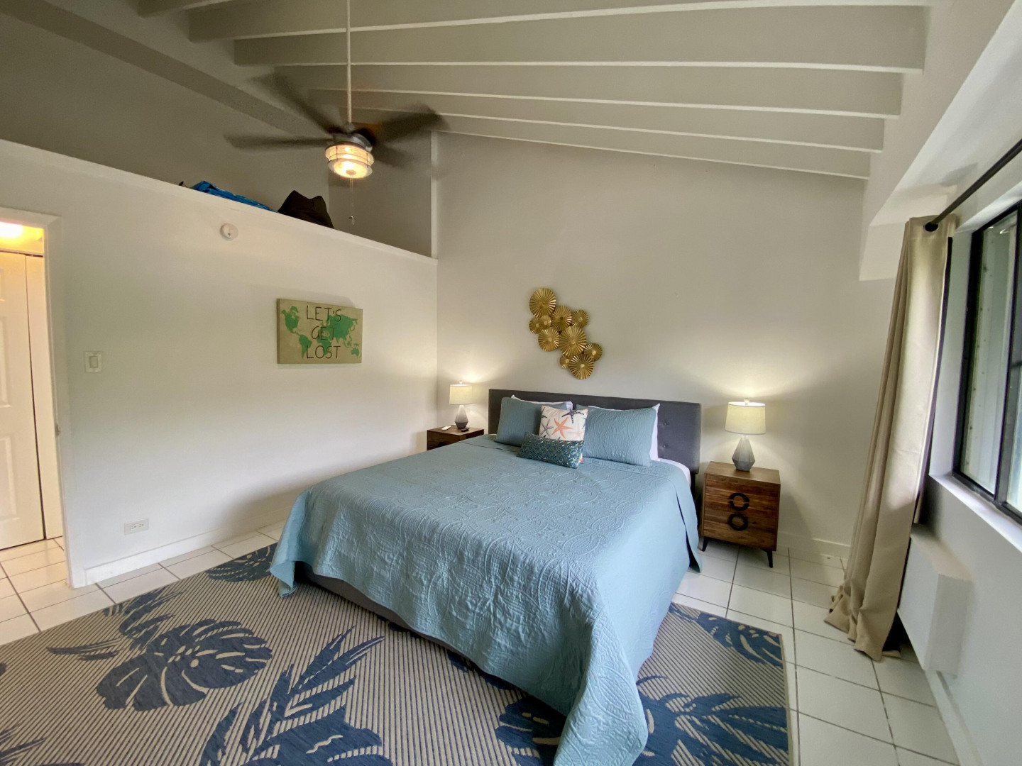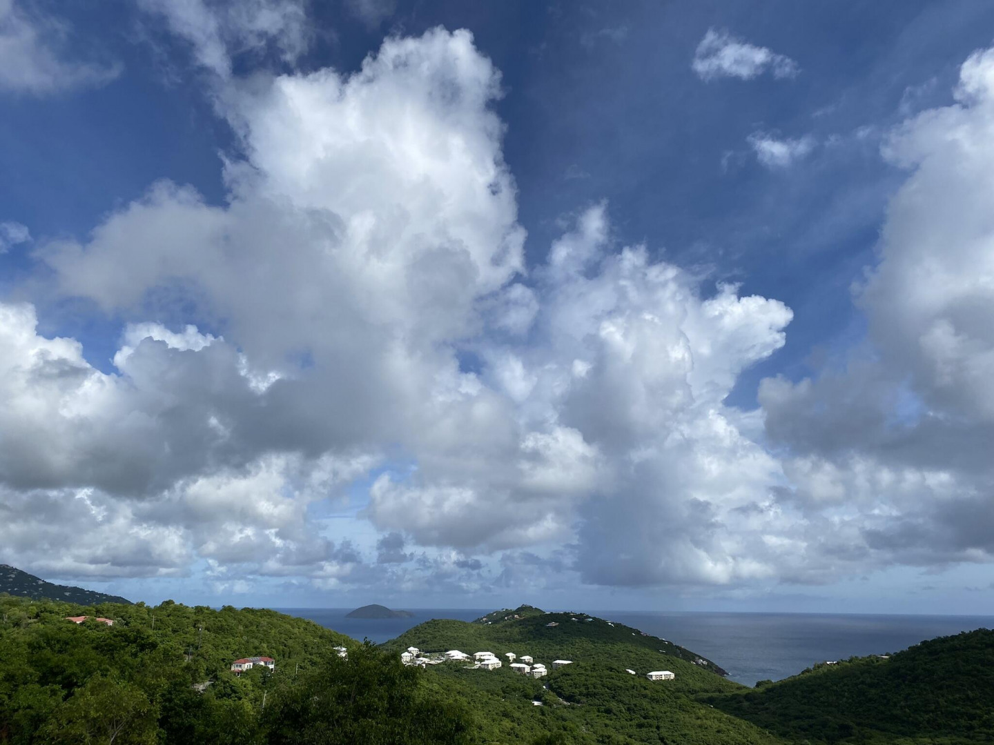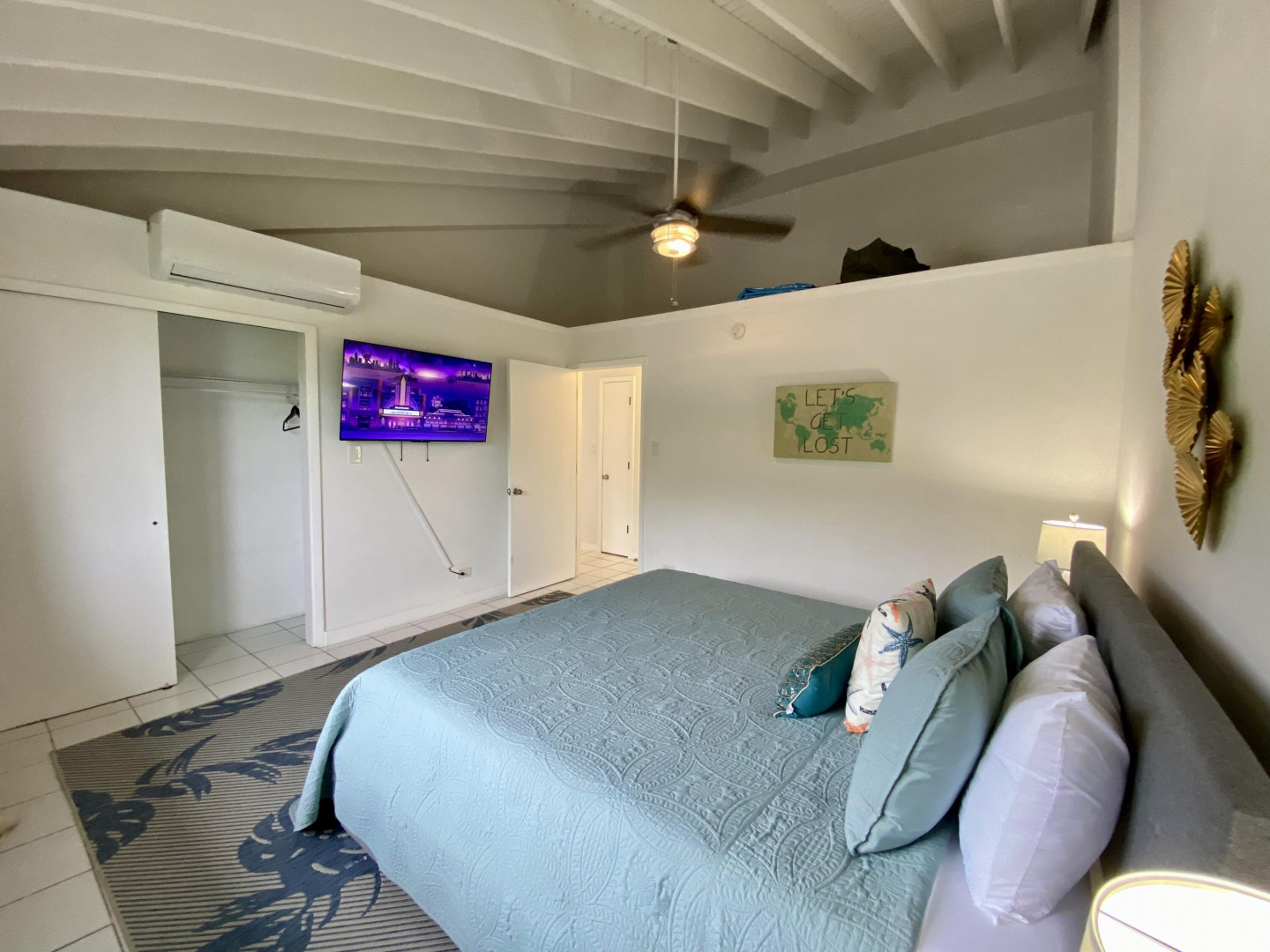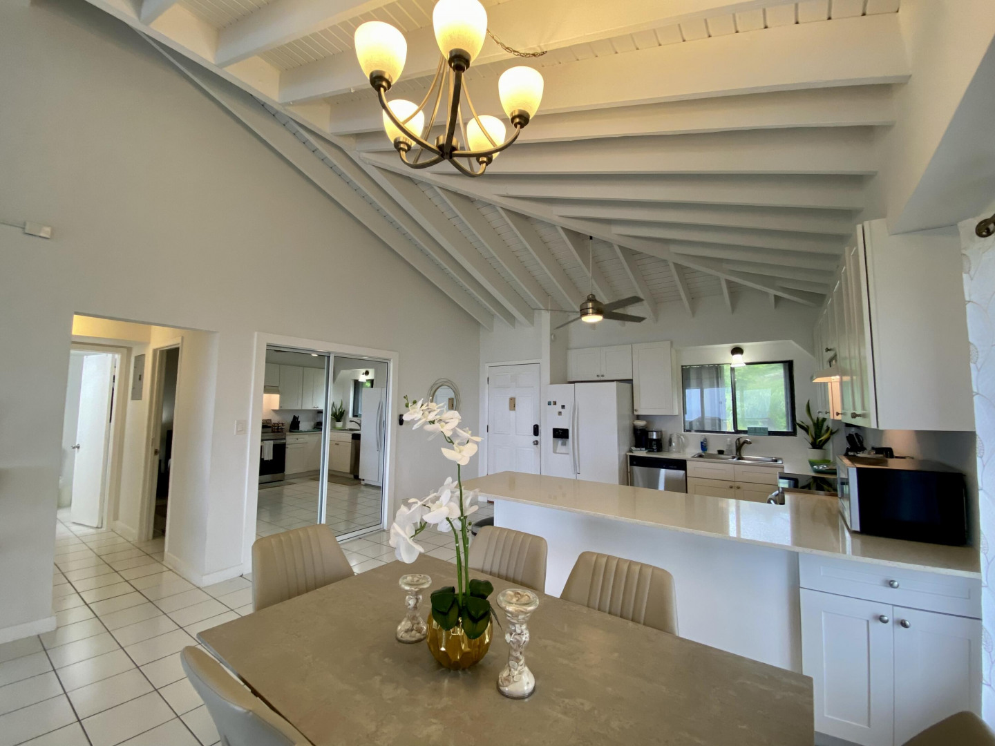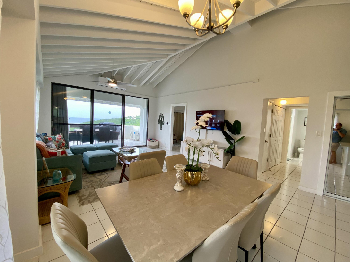 This popular condo on AirBnB, enjoys a spectacular North Side ocean view from its highest elevation in Palm Gardens, and the building most convenient to the complex entrance. Dramatic cathedral ceilings throughout, contemporary fixtures and lighting, newer split a/c's and instant hot water heater. Well-equipped, tastefully furnished and is move-in or short-term rental ready from day one. Relaxing balcony for entertaining or just chillin', 3 ea 50'' smart flat-screens throughout for your entertainment. Well-located, be in town or at Magens Bay Beach within minutes, Red Hook ferry dock just 15 minutes away for those excursions to St. John, the BVI and beyond! (see virtual tour's interactive floorplan experience)