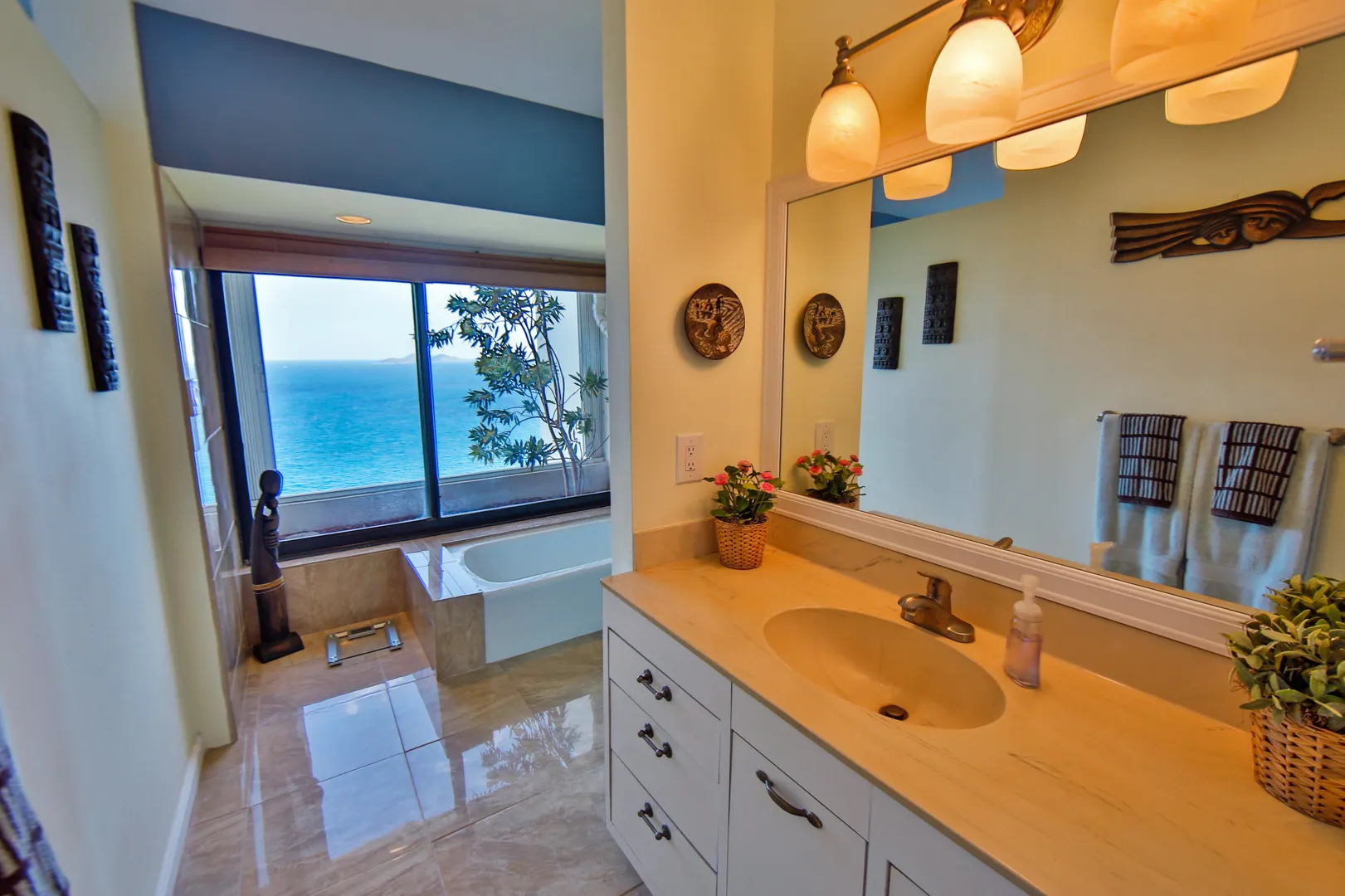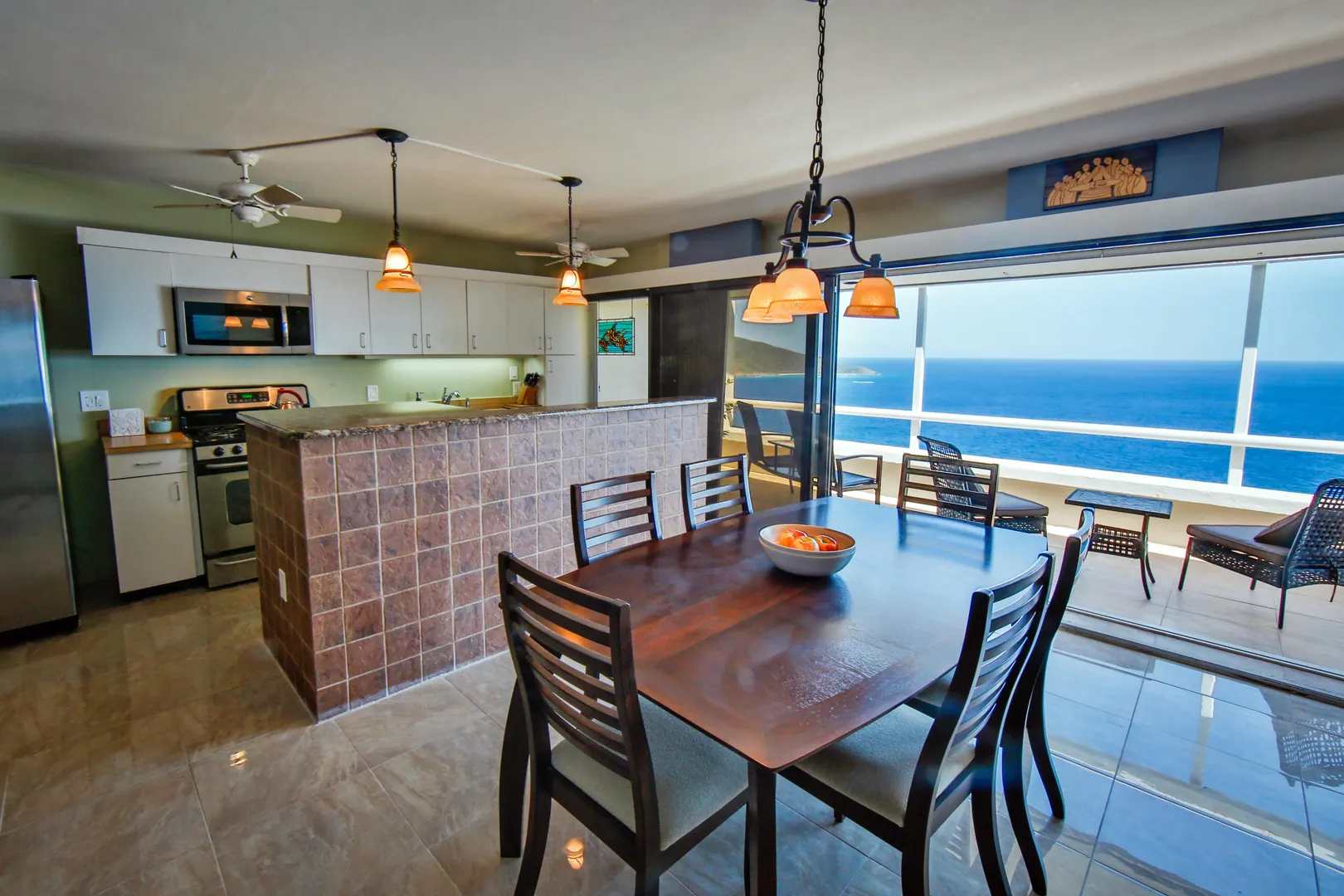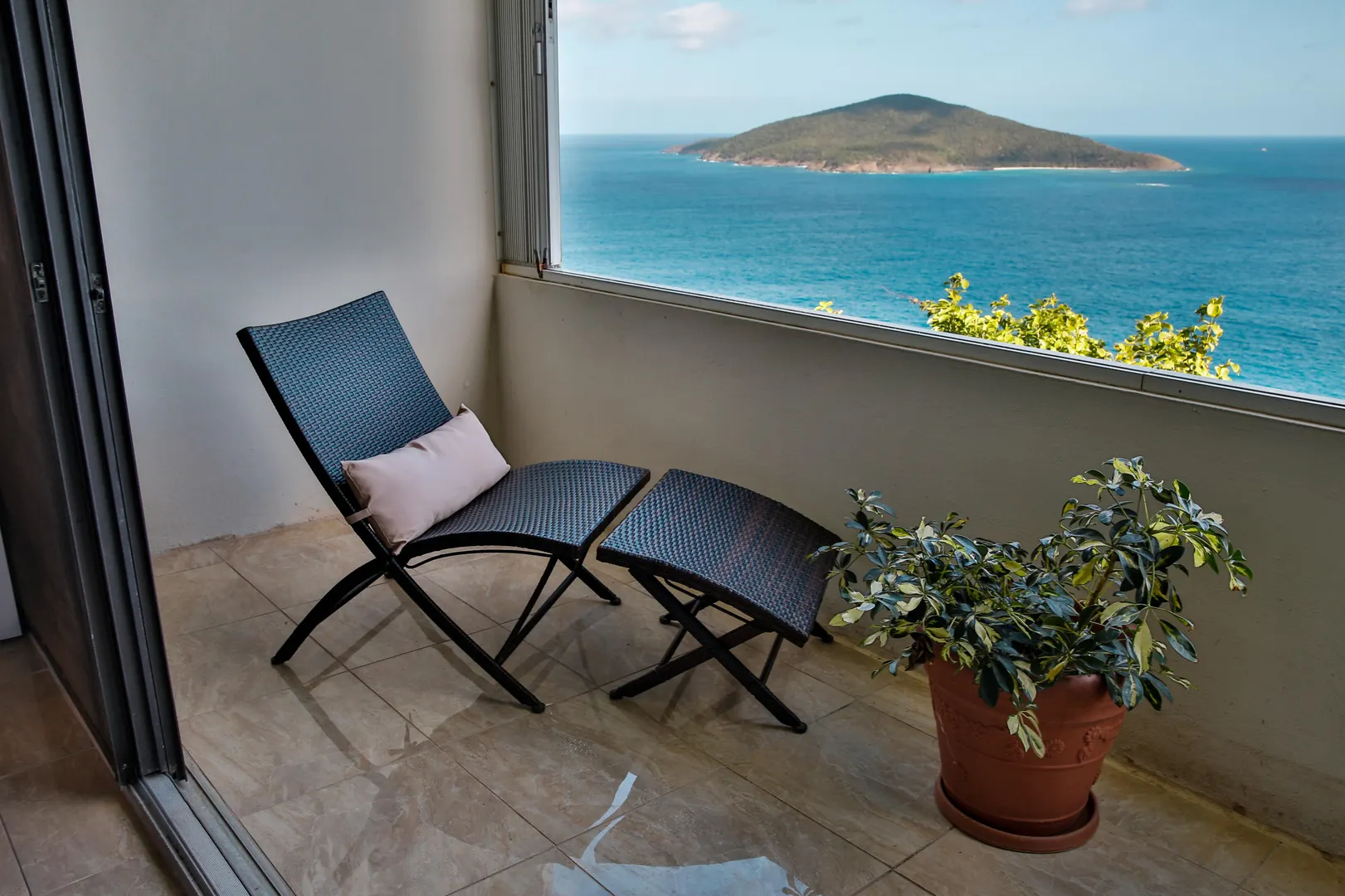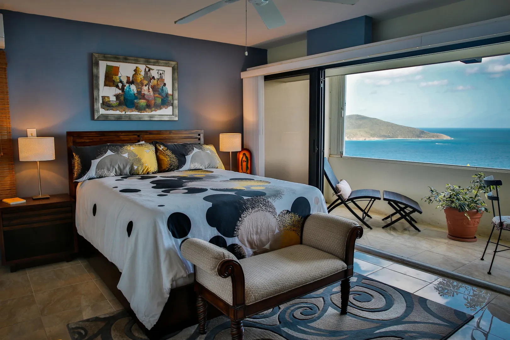 Hear the soothing sounds of the ocean and enjoy a remarkable down island view from this open floor plan two bedroom, two bath walk in condominium. With 28 ft. expanse of floor to ceiling glass there is an unobstructed view including all of the BVI and St John. Stylishly decorated with a contemporary vibe, the unit has recently been remodeled with 18 inch porcelain floor tiles. The open conceptlayout maximizes the enjoyment of the of the 30 ft.shaded deck off the living area. Optional amenities include SmartThings technology to control lighting/electronics and monitoring of doors opened/closed via your mobile devices plus smart TVs with apps allowing you to stream your favorite movies online.