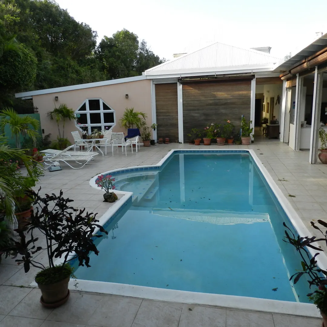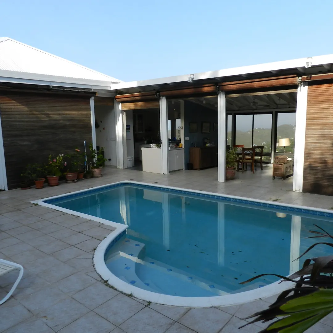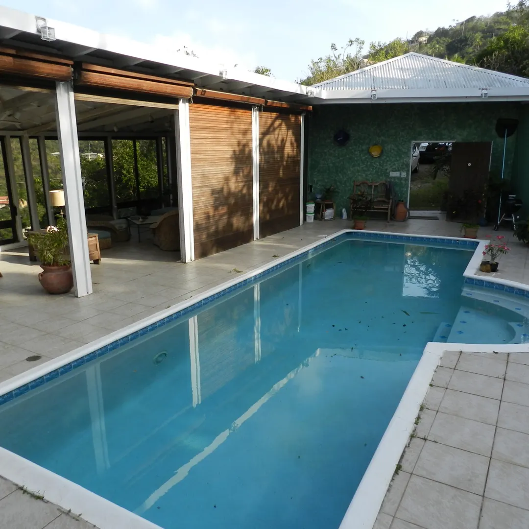 Located high on Valley Rd.,in quiet, Estate St. Jo and Ro, this walk in level home boasts scenic down island views. This 2Br-2.5-BA home enjoys a courtyard pool, huge enclosed patio, large formal living and library areas. Elevated second BR has breezes, views and privacy. Large garage functions as workspace with separate drive. This handyman special is priced to move.