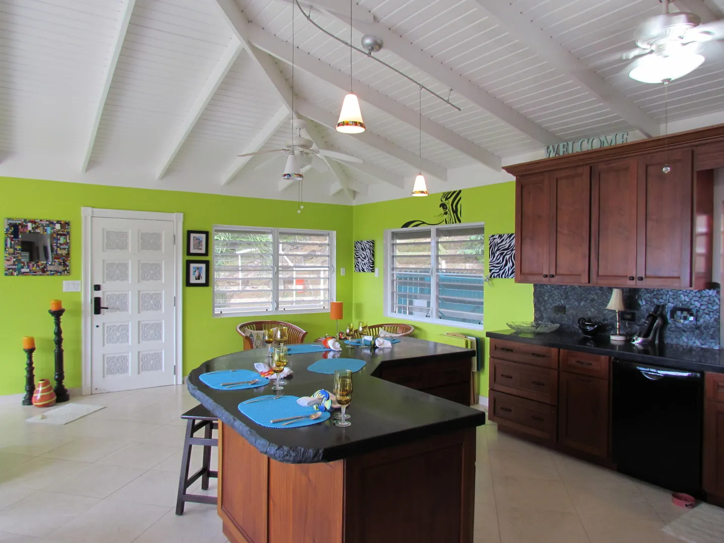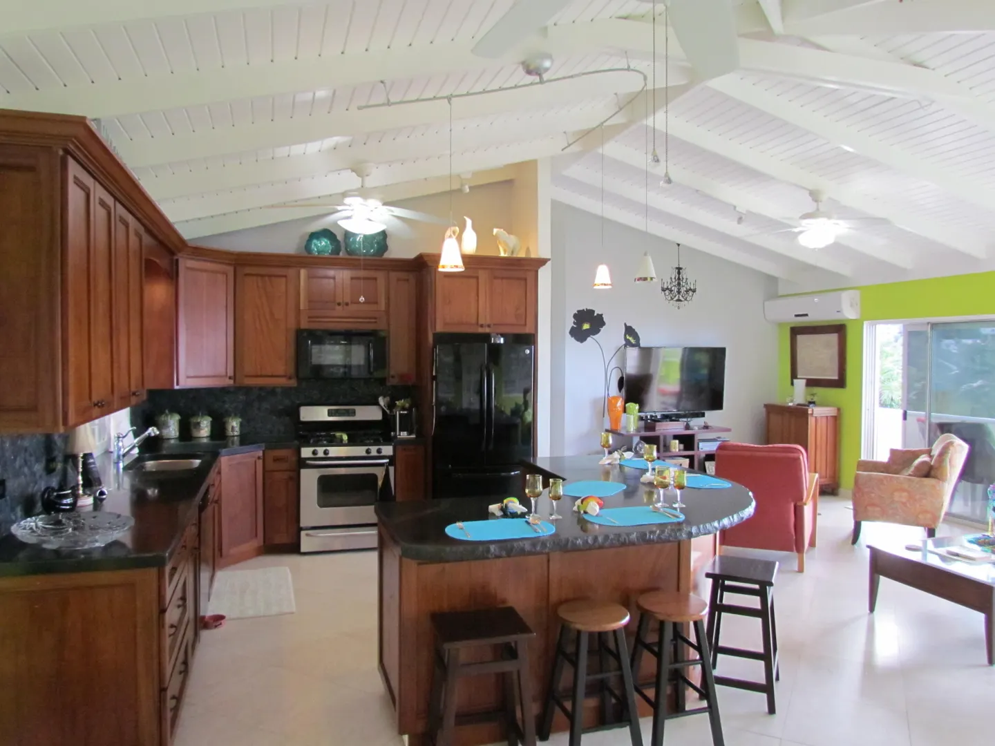 Stylishly redesigned and totally renovated home w/ exceptional quality finishes including custom Mahogany cabinets. Sweeping ocean views from spacious living area & sundeck. Generous and finely appointed master suite includes elegant bath. Spacious parking, covered carport, walk-in level. Large parcel boasts manicured garden areas. Quality renovated 1/1 rental below. See supplement for details.This 3 bedroom/2 bathroom home has been thoughtfully, completely and meticulously upgraded boasting beautiful custom made Mahogany back cabinets and unique custom concrete countertops in kitchen & bathroom, high end Porcelanosa tiles throughout, raised and reinforced ceilings throughout, recently upgraded electrical and cistern recently redone with easy access from Master Suite, roof recently redone, and convenient split ac units. Large interior pantry/laundry room with stylish barn door, handy outdoor shed connecting to a shady carport space, an option for expanding the upper patio/deck. Owners thoughtfully appointed resin light covers for interior/exterior lighting and solar screens to cut the afternoon glare. Beautiful classic teak furnishings from Bali available for separate purchase (ALL furniture available for separate sale by owner).