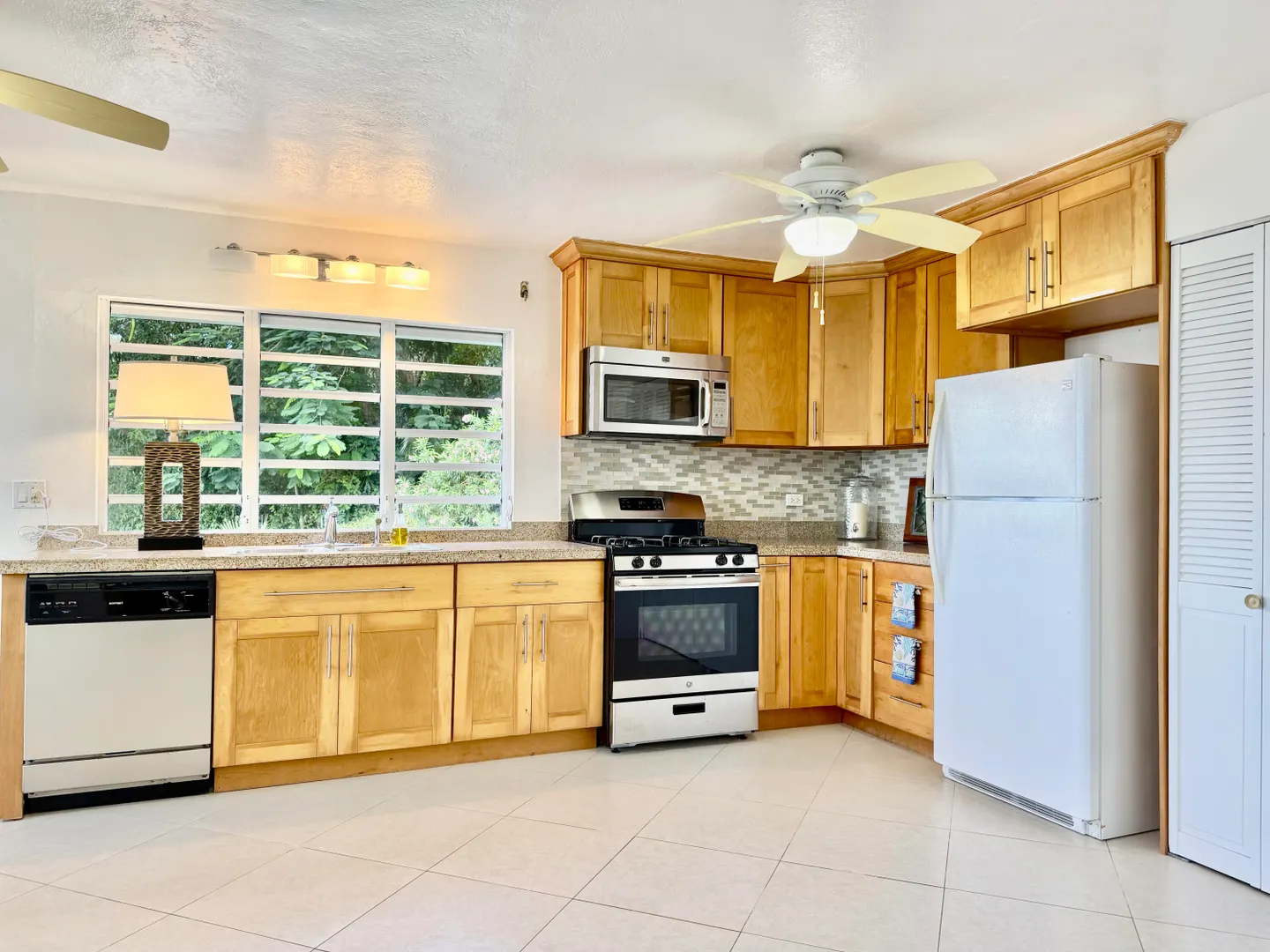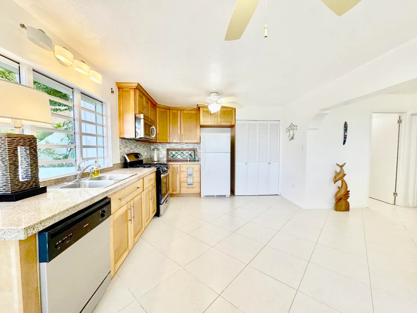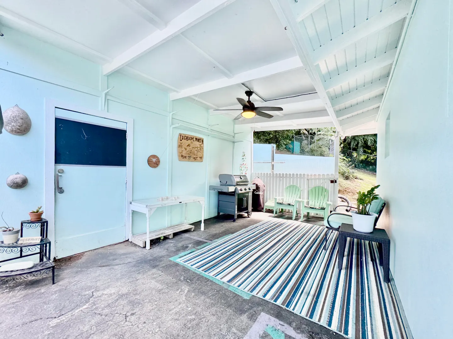 Nestled in a quiet North Side neighborhood, this 3-bed, 2-bath concrete home with a spacious 1-bed apartment offers privacy and comfort. Enjoy stunning sunsets from the covered porches and breathtaking views of inner and outer brass islands. Features include automatic roll down hurricane shutters, 15kw generator with automatic transfer switch, 5 split AC units, large kitchen with gas stove, solar water heater, and a paved driveway with gated parking for 4 cars. The fenced yard includes mature fruit trees, a large detached shed with electricity, and lush landscaping for privacy. The apartment has off-street parking and income history.