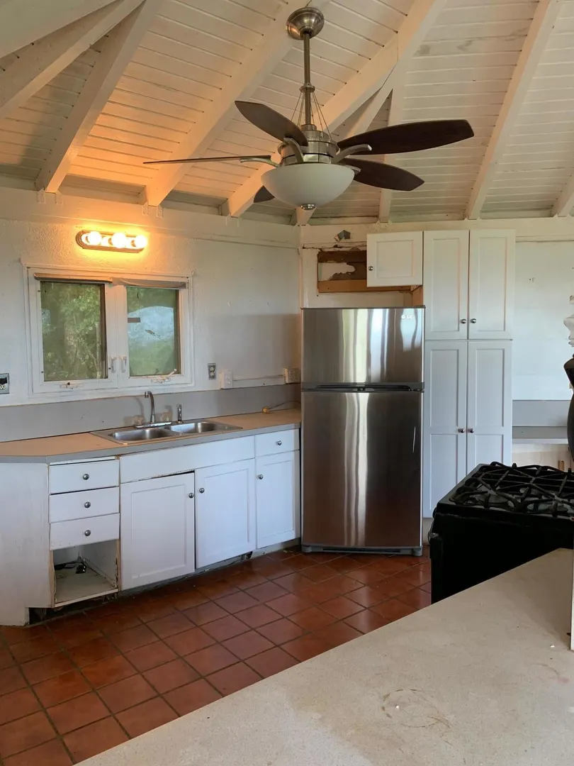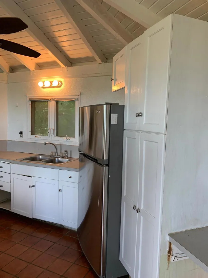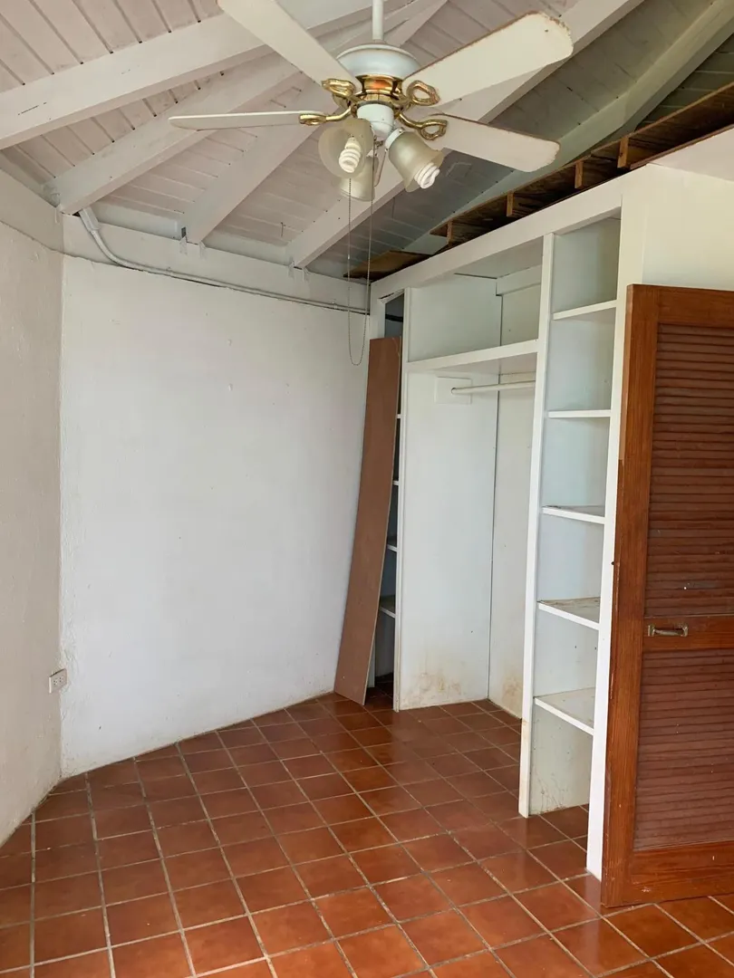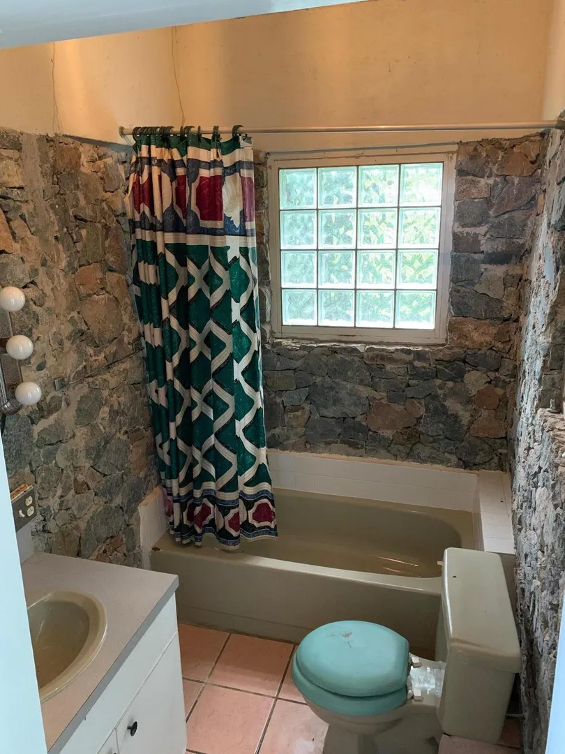 Masonry and stone fixer upper consisting of two hexagons to which the seller has added a spacious wood frame master bedroom. Attractive blue bit sone work inside and out.The home is set among tropical trees, shrubs and boulders. There is an additional space below that may possibly be converted into a bedroom or office.View of Hans Lollick and St. John.Sold As Is.