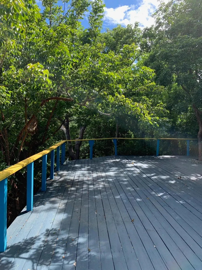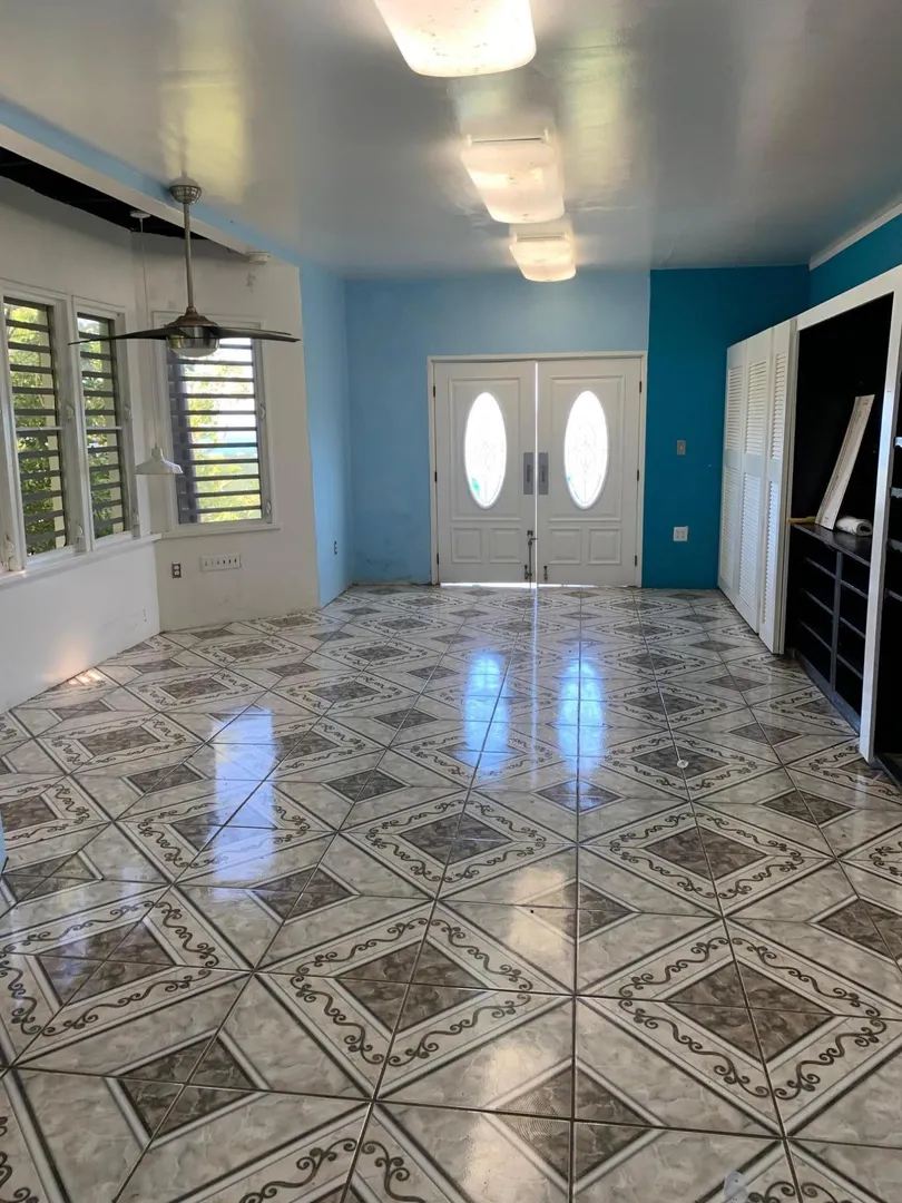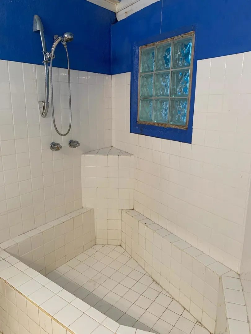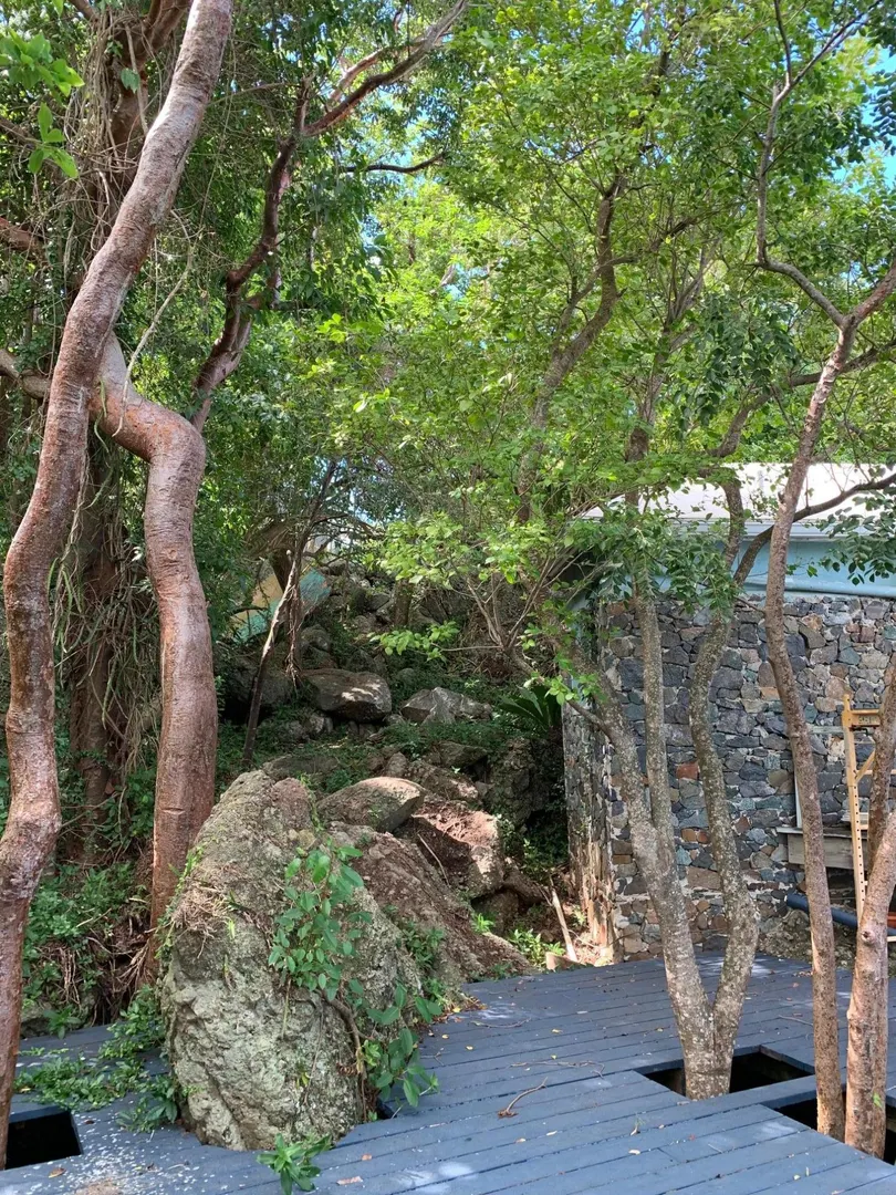 Masonry and stone fixer upper consisting of two hexagons to which the seller has added a spacious wood frame master bedroom. Attractive blue bit sone work inside and out.The home is set among tropical trees, shrubs and boulders. There is an additional space below that may possibly be converted into a bedroom or office.View of Hans Lollick and St. John.Sold As Is.