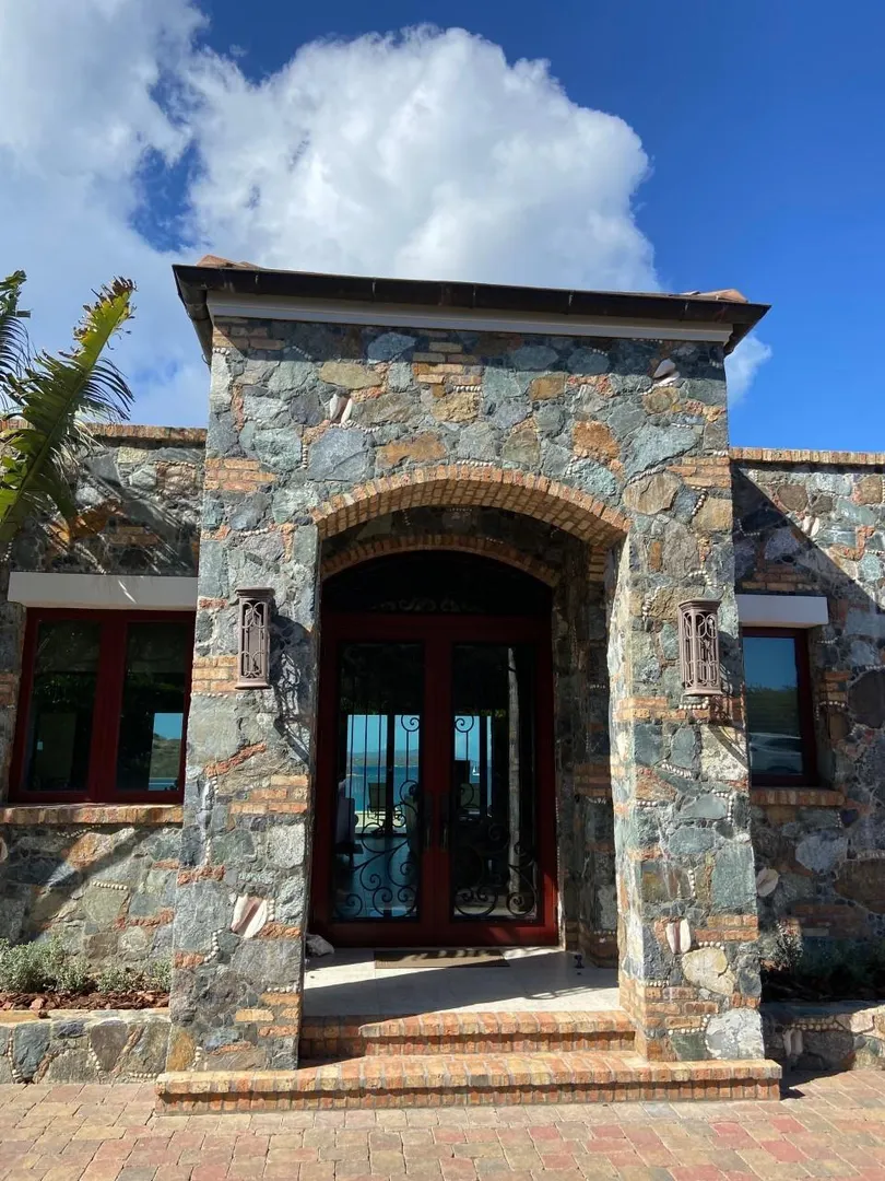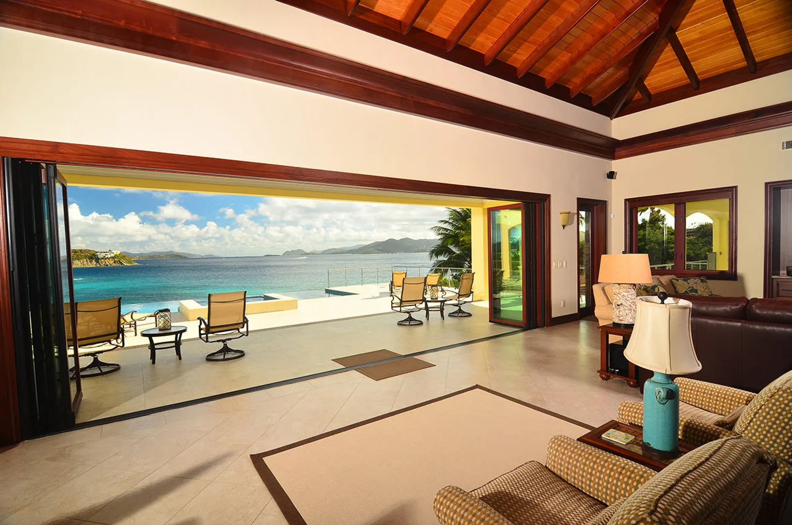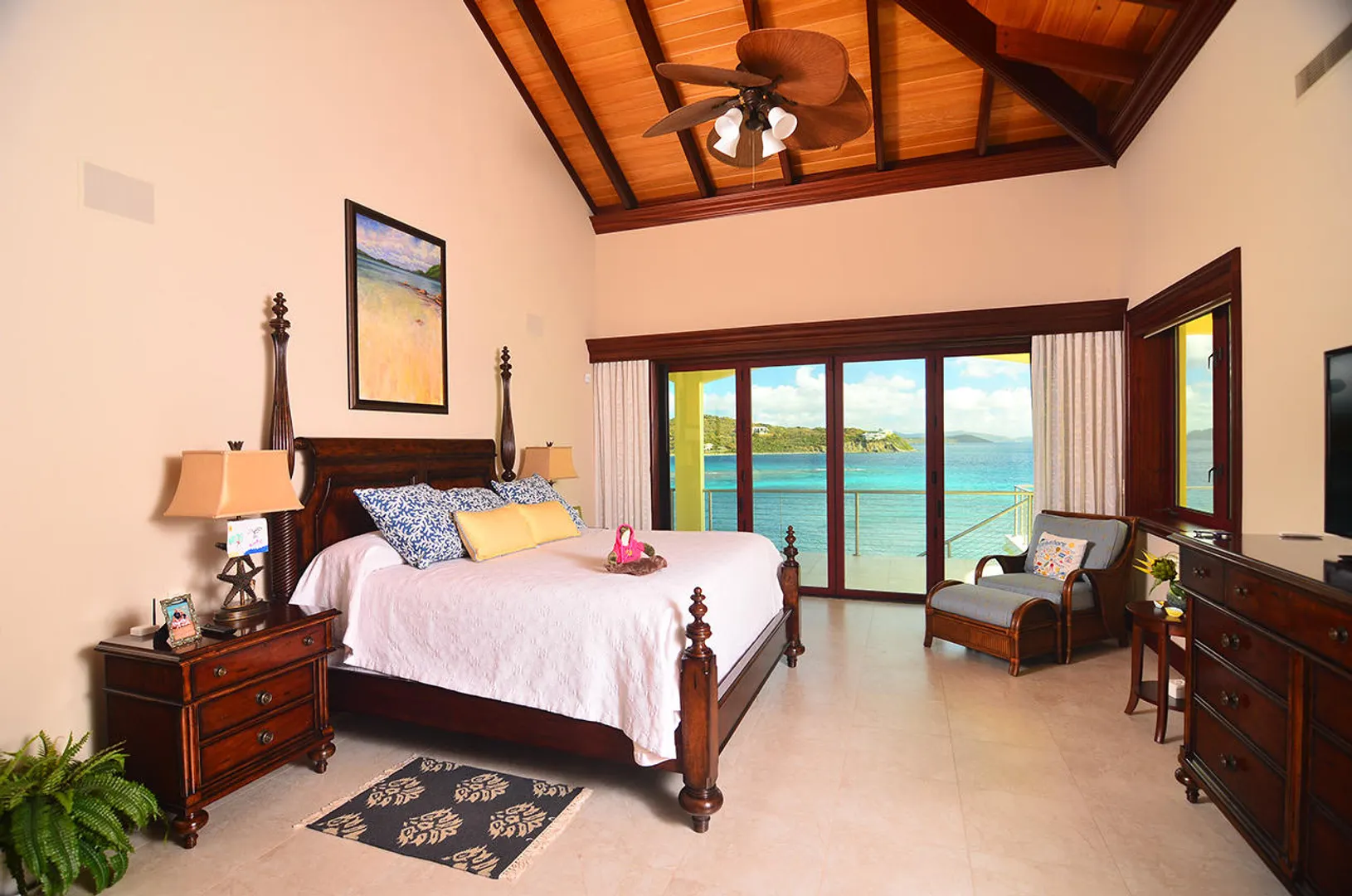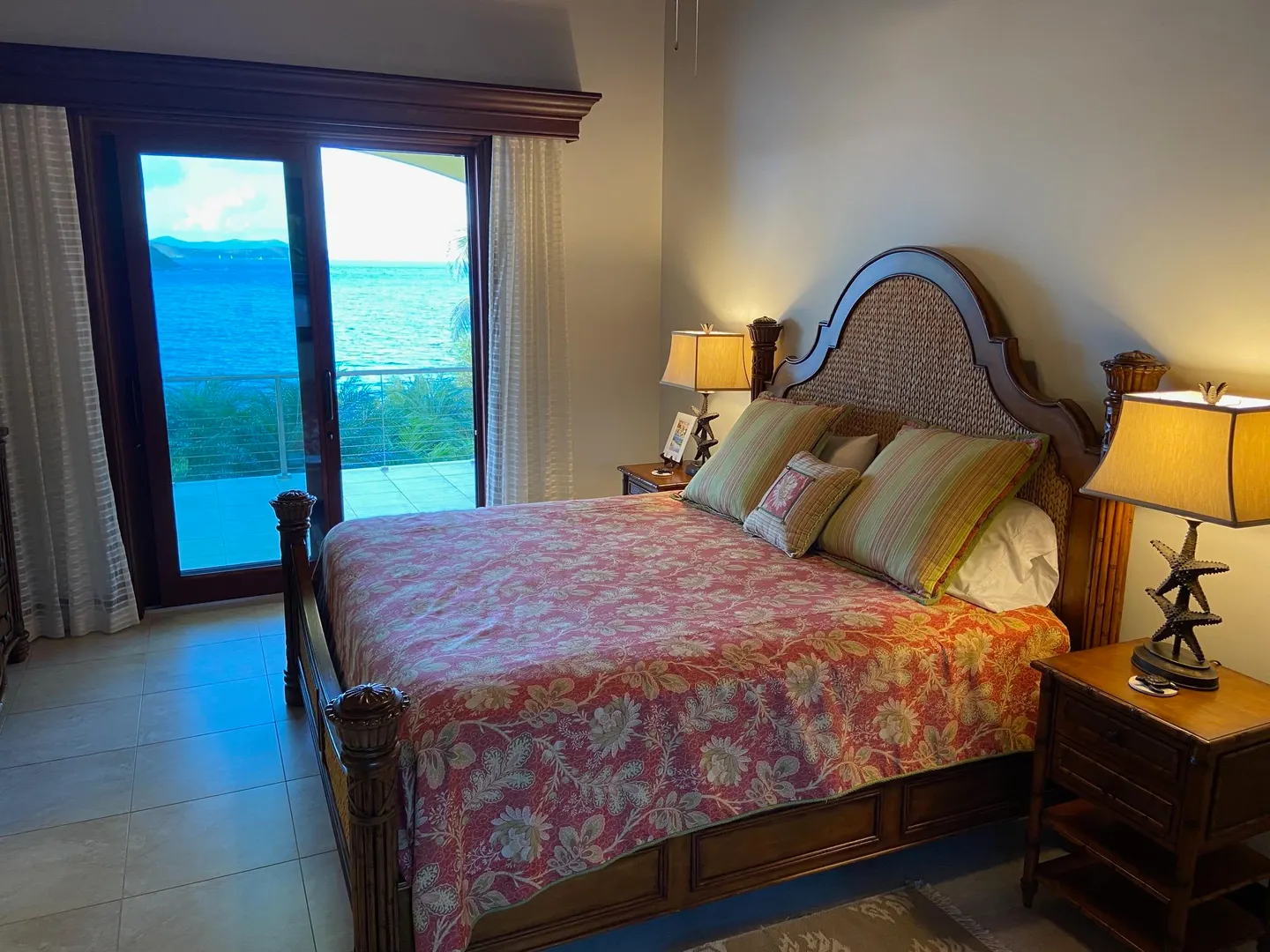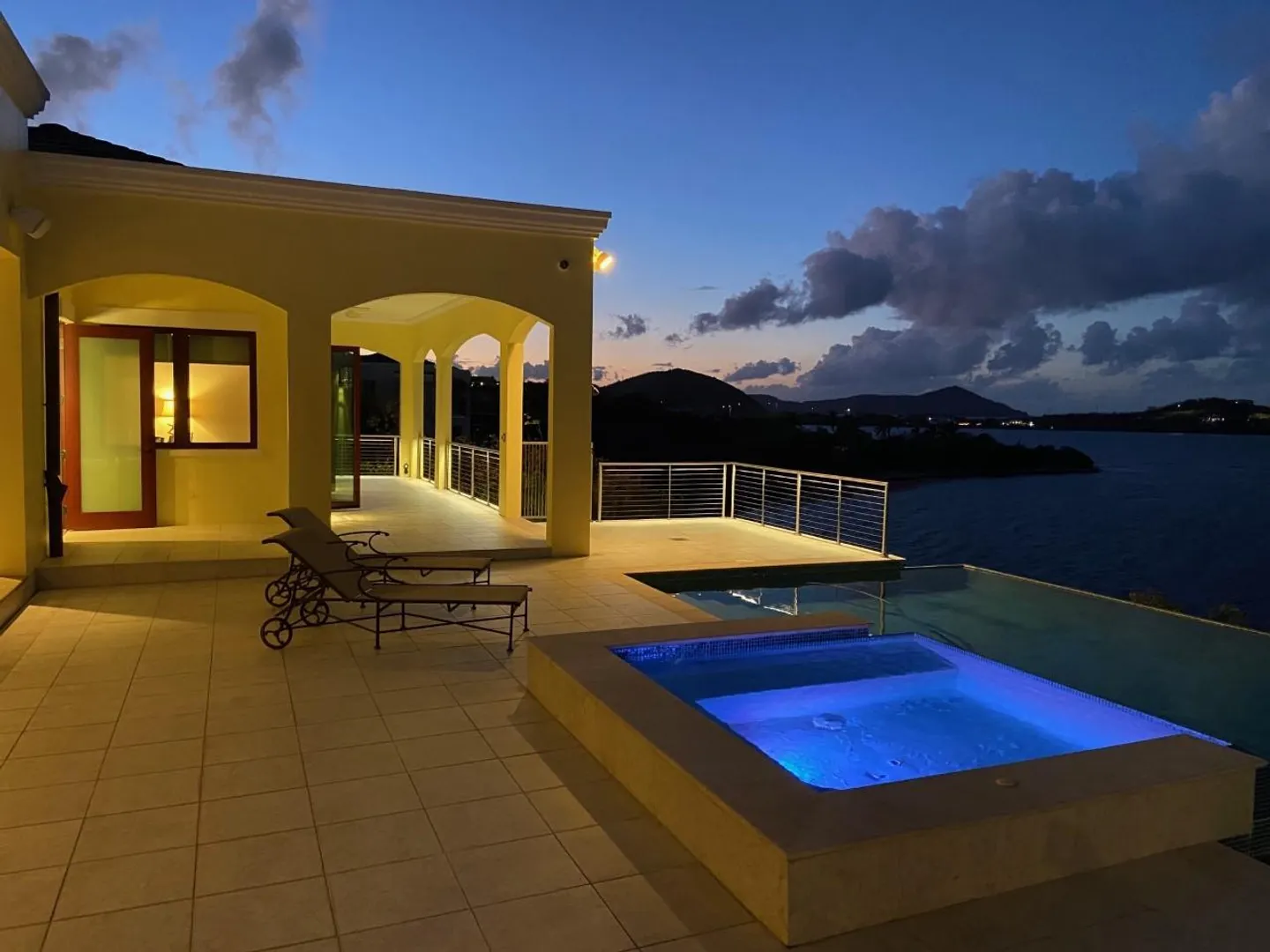 Artfully designed to blend indoor and outdoor living, ISLAND TIME, captures exquisite seascapes and gentle trade winds from a premier waterfront location inside renowned Waterpoint Estates. Coveted location near the end of the peninsula, facing St. John, bordered by gentle Pilsbury Sound, assures murmuring waves creating soothing water music to stir the soul. Upon arrival at this luxury retreat, the hand-built stone facade with covered entry, captures a visitor with a sense of exquisite West Indian style, quiet charm and welcome. The open single level floor plan maximizes natural light and ventilation. The Texas sized interior boasts the biggest Great Room on the peninsula, with 20 foot vaulted ceilings and folding glass walls along the front. Room sized covered galleries grace the