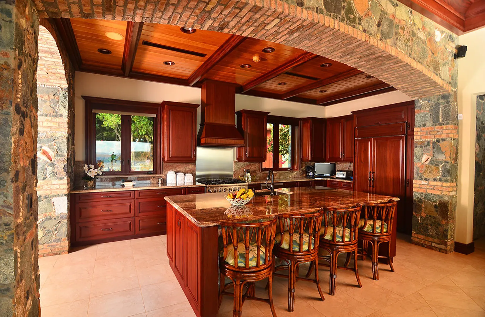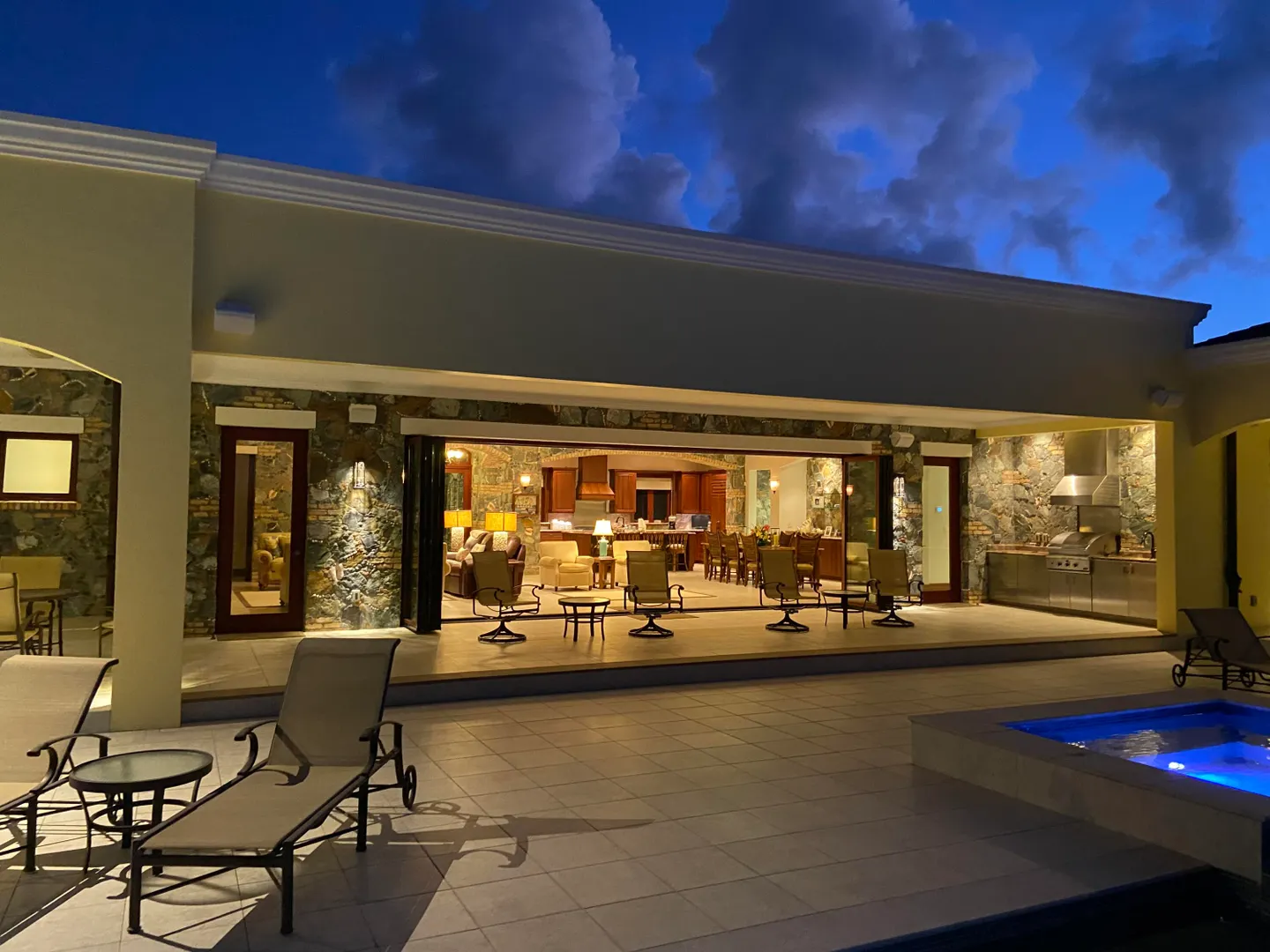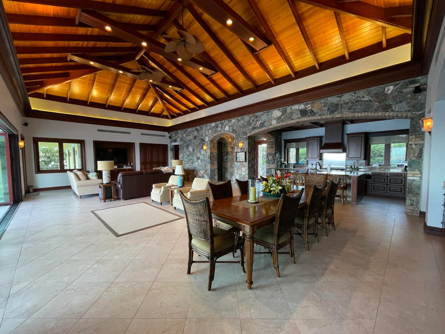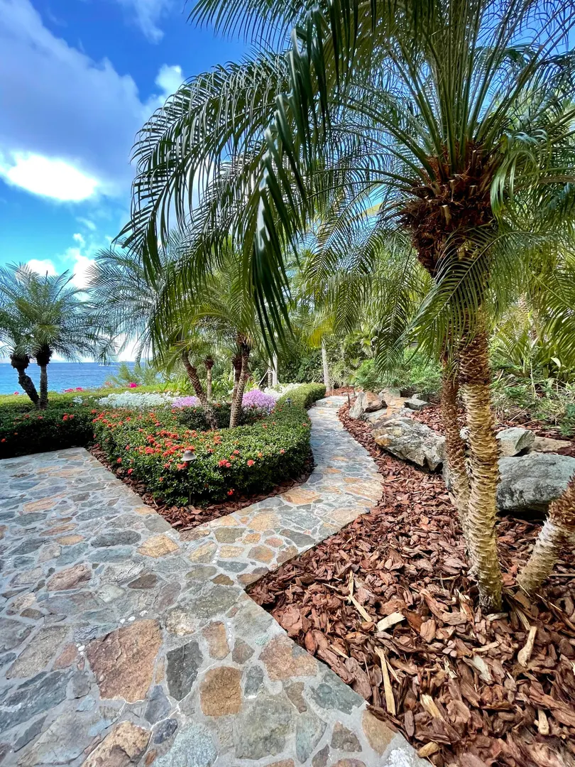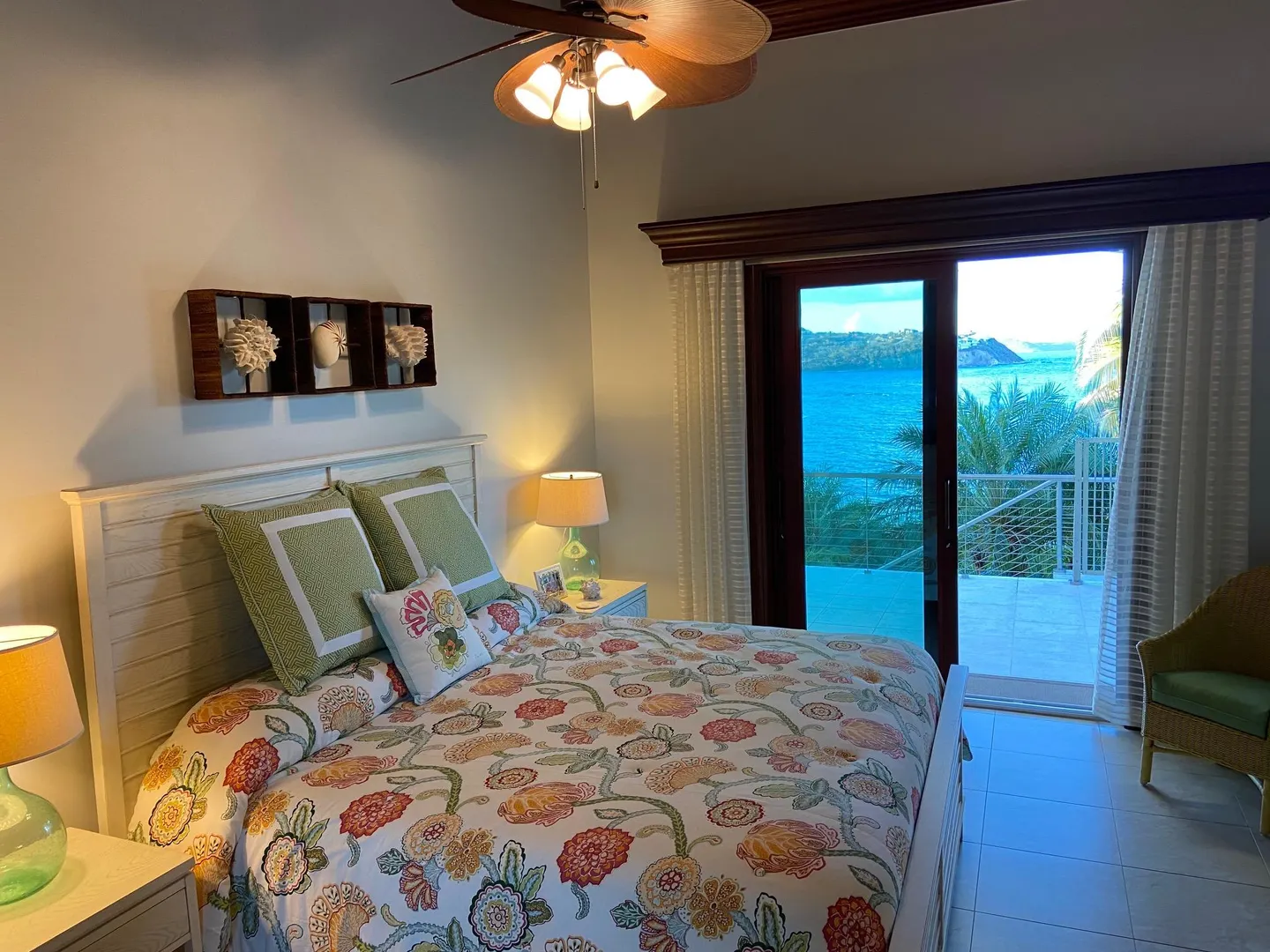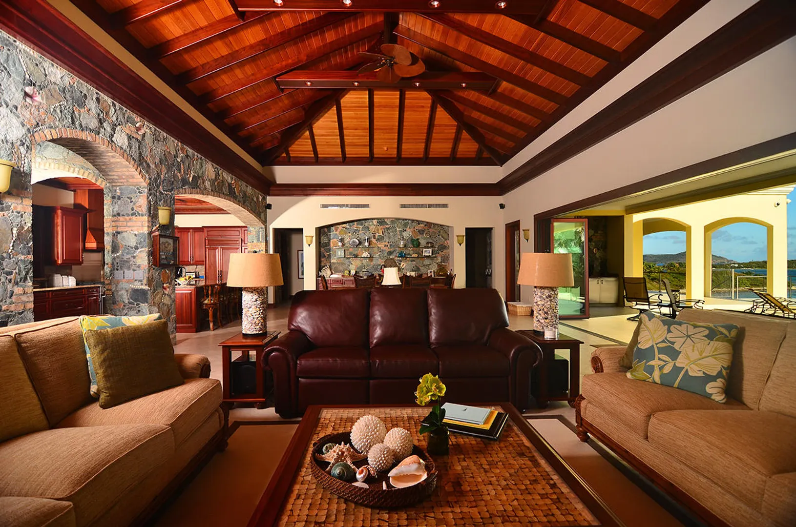 Artfully designed to blend indoor and outdoor living, ISLAND TIME, captures exquisite seascapes and gentle trade winds from a premier waterfront location inside renowned Waterpoint Estates. Coveted location near the end of the peninsula, facing St. John, bordered by gentle Pilsbury Sound, assures murmuring waves creating soothing water music to stir the soul. Upon arrival at this luxury retreat, the hand-built stone facade with covered entry, captures a visitor with a sense of exquisite West Indian style, quiet charm and welcome. The open single level floor plan maximizes natural light and ventilation. The Texas sized interior boasts the biggest Great Room on the peninsula, with 20 foot vaulted ceilings and folding glass walls along the front. Room sized covered galleries grace the