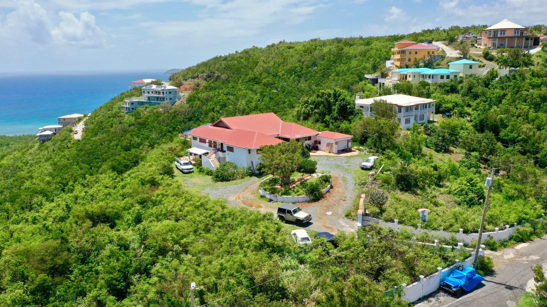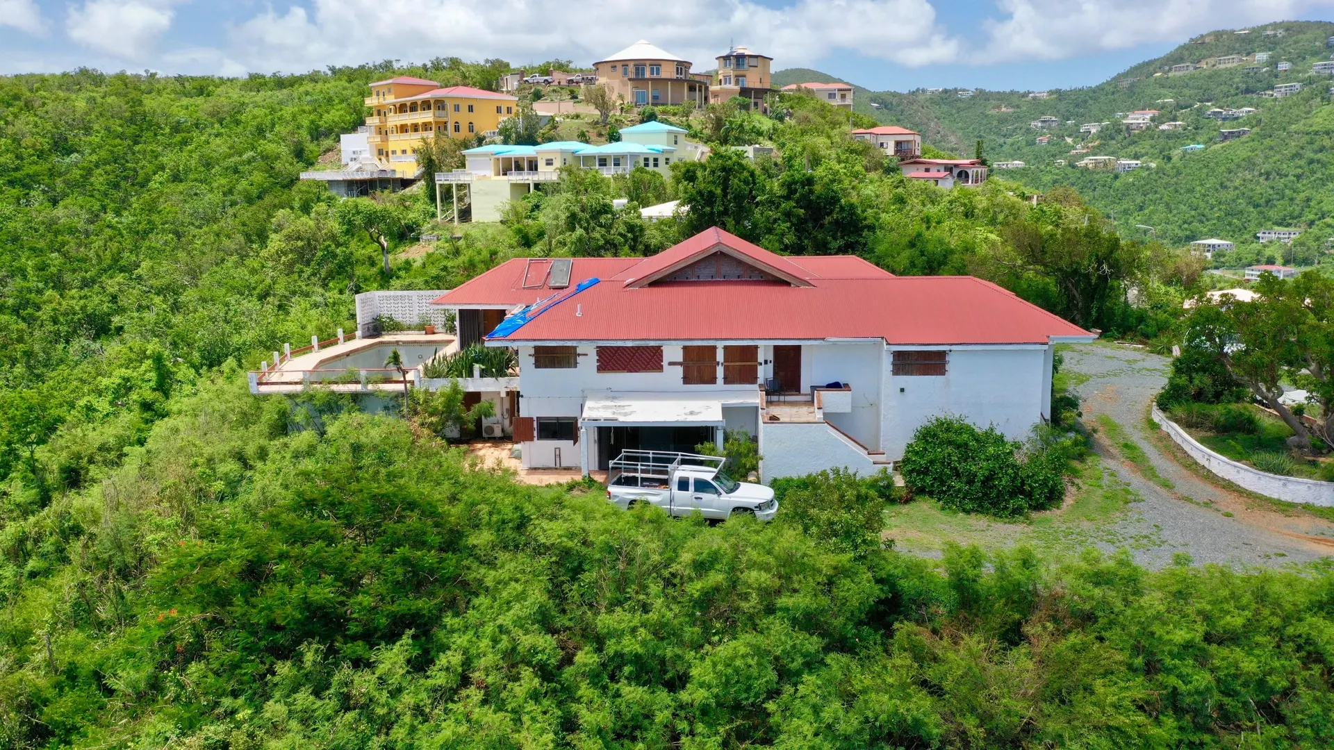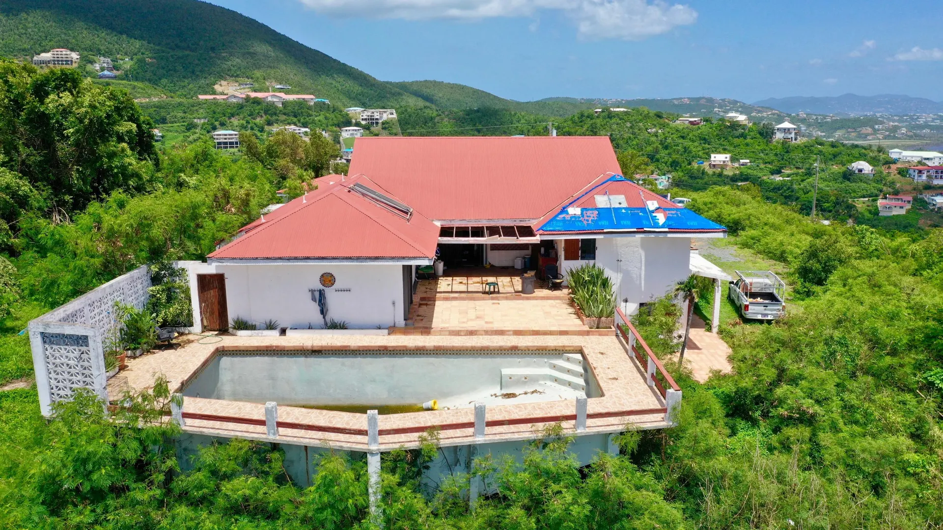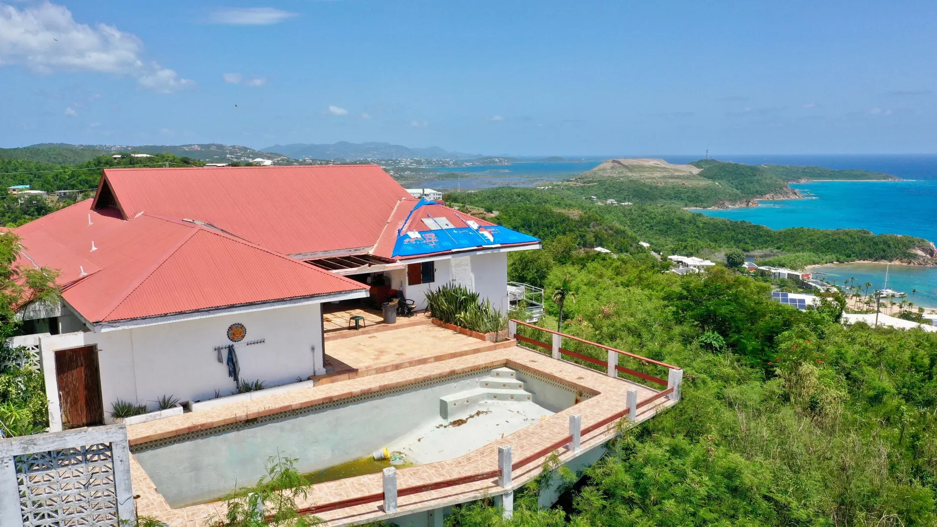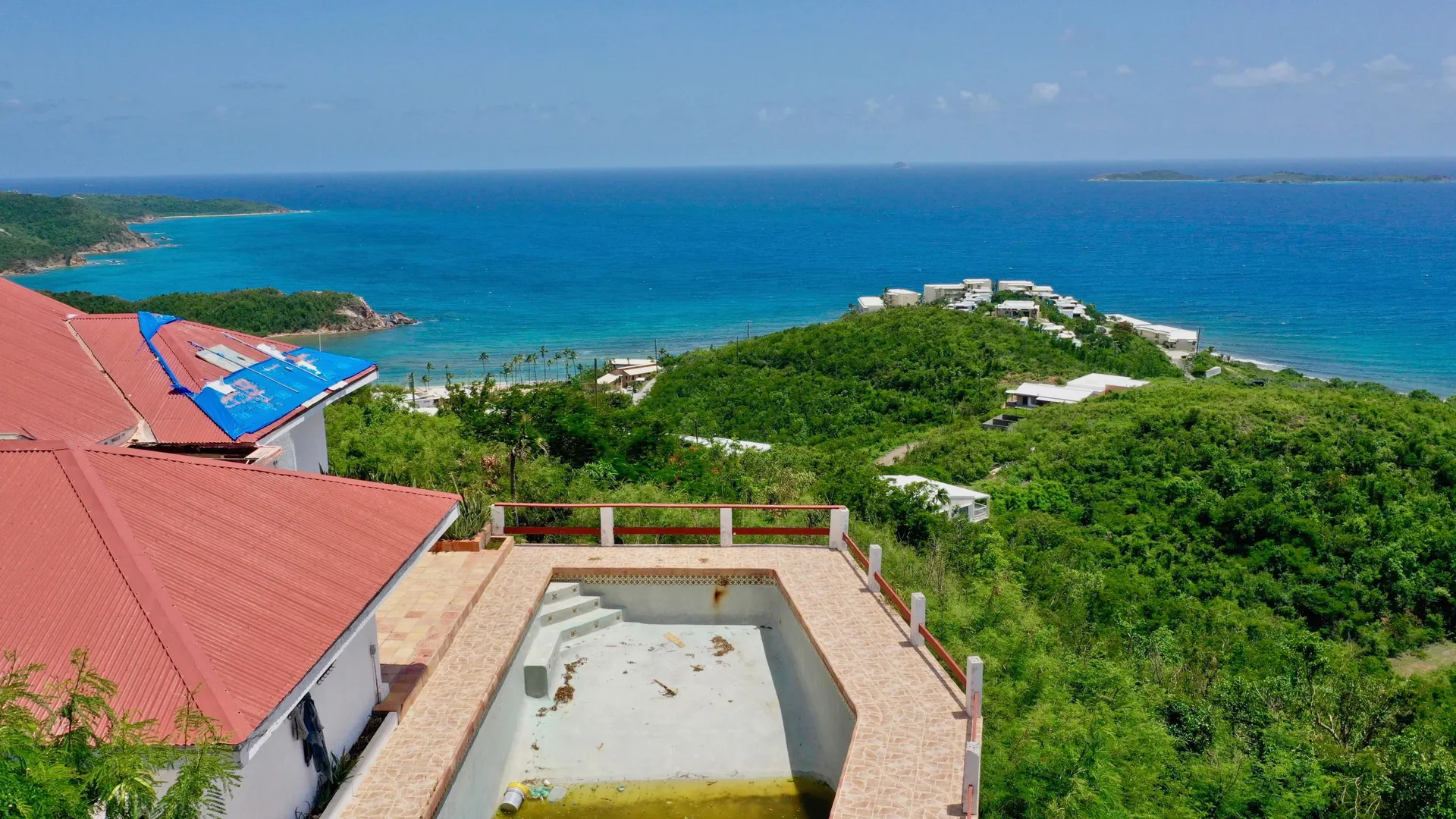 Back on the market! Large family home with spectacular views. Main house is 4/2.5 with a 1/1 apartment. Located at the end of a road high in the Bolongo Hills, this family home sits on a .72 of an acre with views East to St. John and South to St. Croix. Property has a large pool & pool deck. This home sustained damage in Irma & Maria. Great property for a contractor or investor. Seller owns two lots next door (MLS 19-1826) which could be also purchased for a large family compound. Listed at $489,000. Property sold as is.