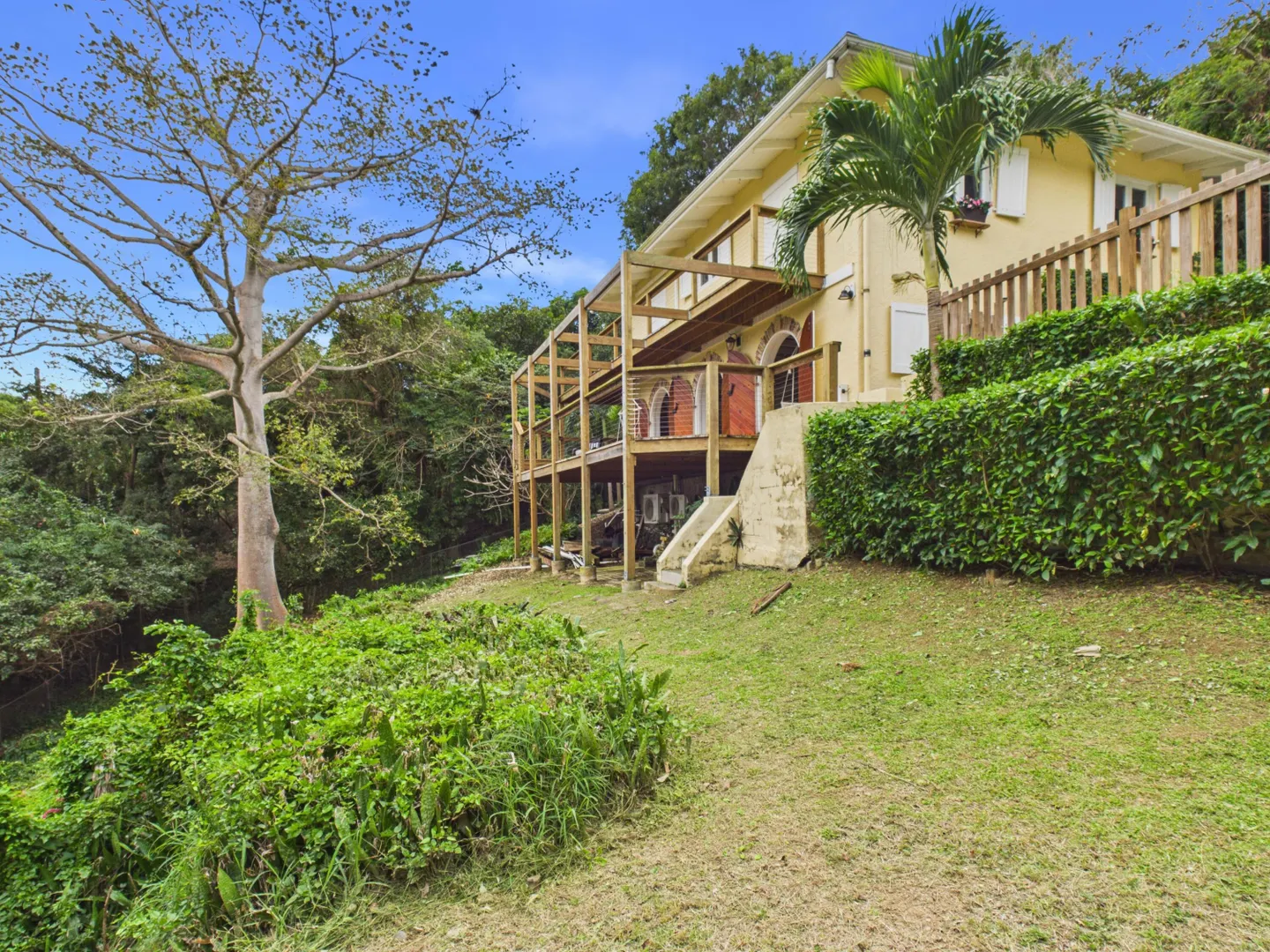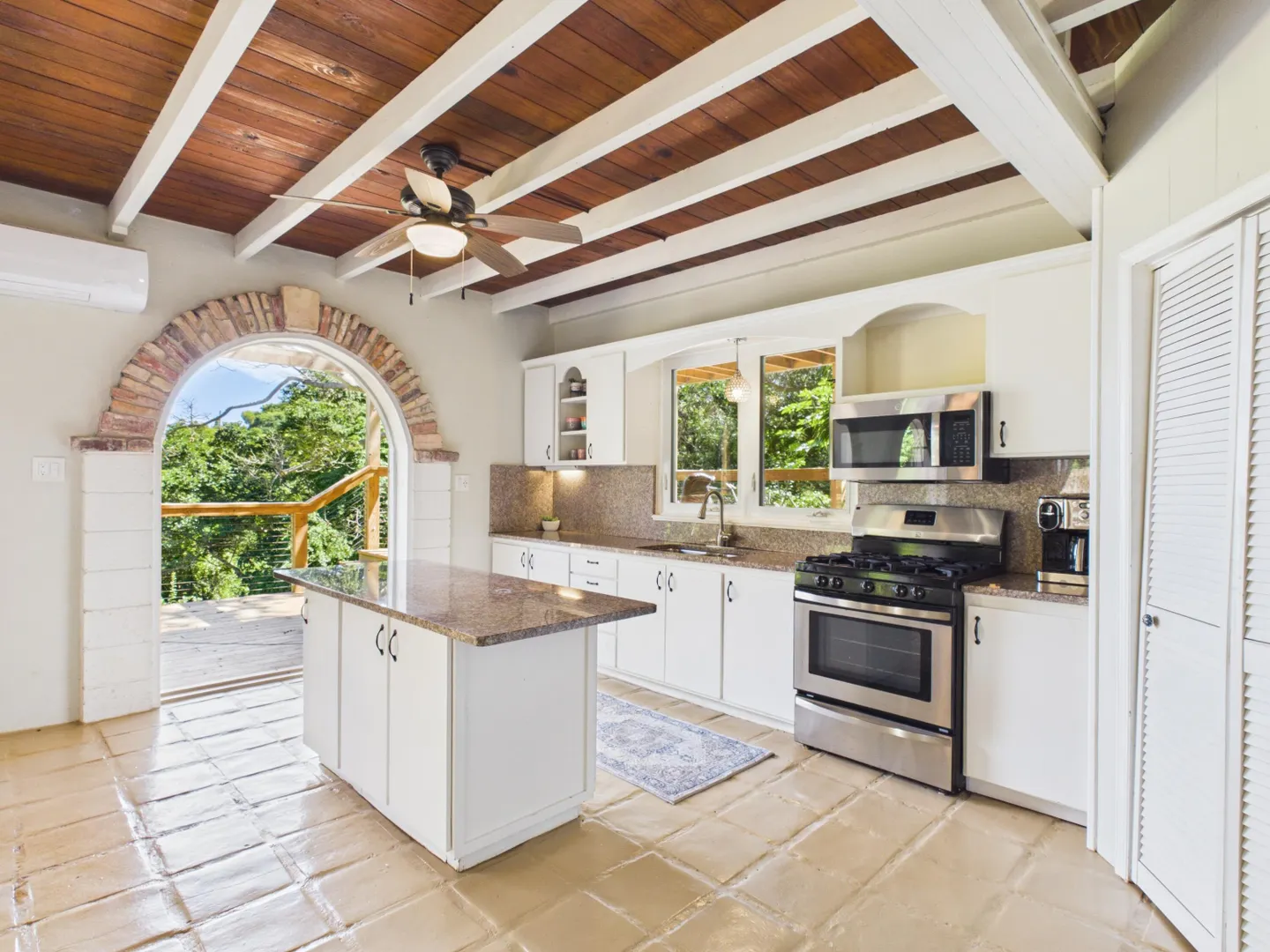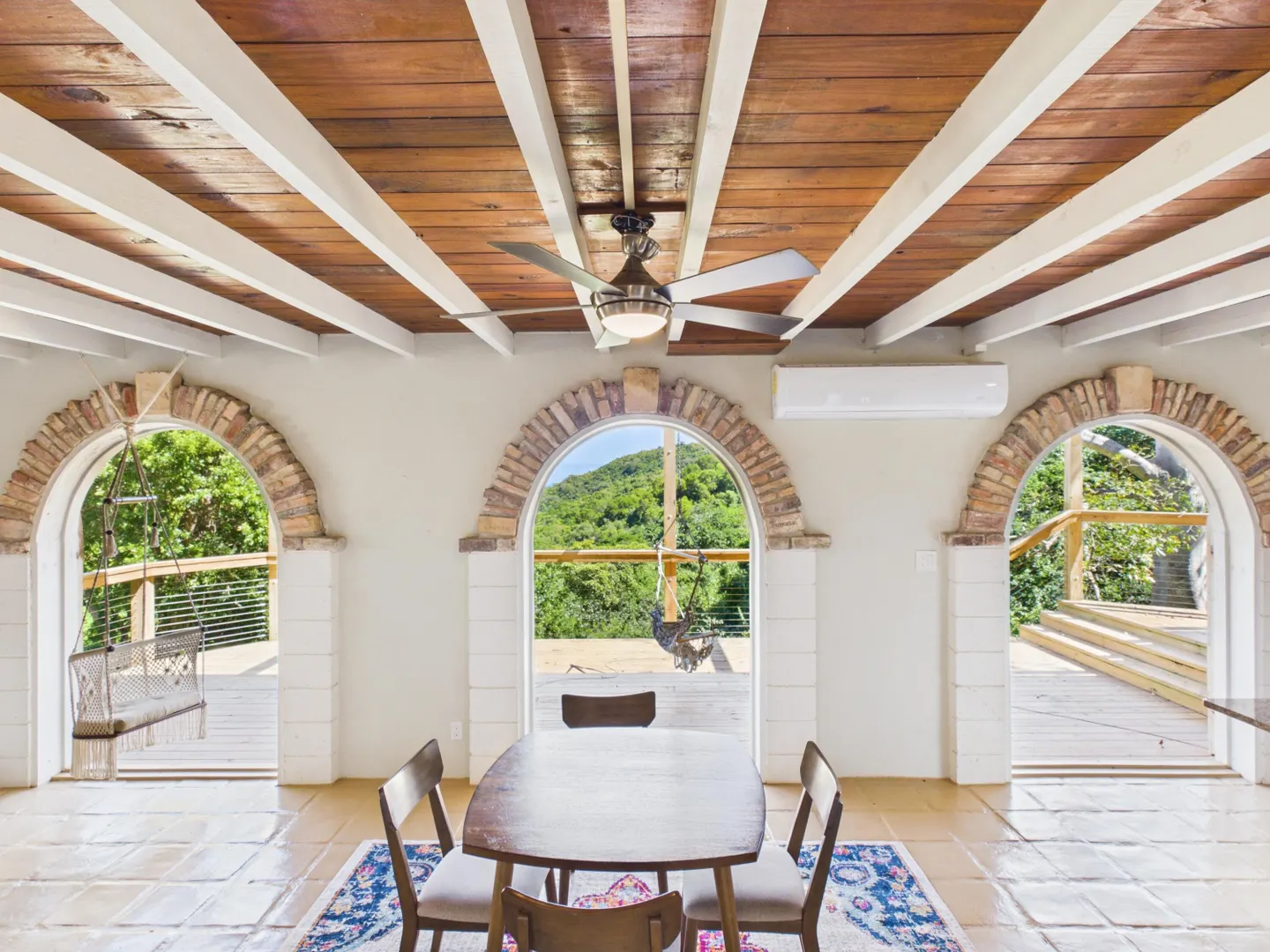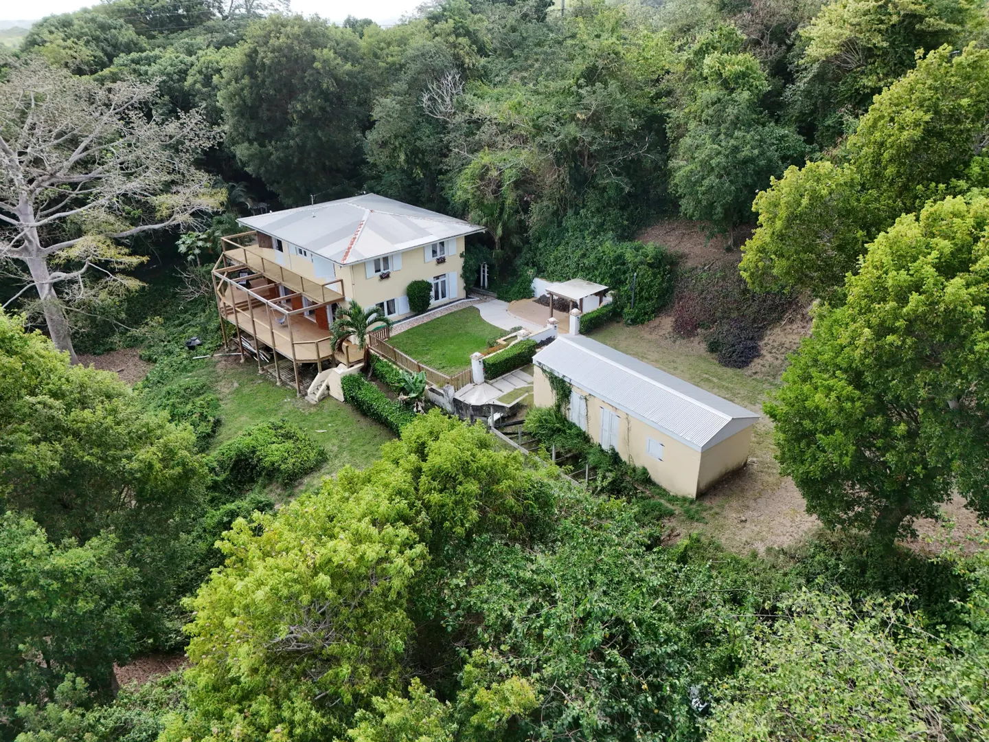 Tucked into 1.16 lush acres in St. Croix's green hills, this private 3-bedroom, 2-bath home captures sweeping mountain and Caribbean Sea views. Mature tropical landscaping creates a peaceful island retreat. Inside, granite countertops, a cozy fireplace, and charming architectural details add warmth and character. Distinctive Danish brick archways open to expansive wraparound decks designed for catching breezes and entertaining under the stars. Enjoy the tranquil areas with ponds and fountains. The shed is a great addition for a workshop or maybe your own art studio. Just minutes from Cane Bay, with dining, hiking trails, world class diving and 10 minutes to Carambola Golf Club. This is the perfect private island retreat!Built in 1987 and well maintained, this 2,712 sq. ft. residence is surrounded by mature landscaping that enhances its privacy and connection to nature. Enjoy a tranquil setting filled with tropical blooms, graceful palms and a majestic kapok tree. The gated and fenced yard creates a secure and welcoming environment for pets or outdoor enjoyment.