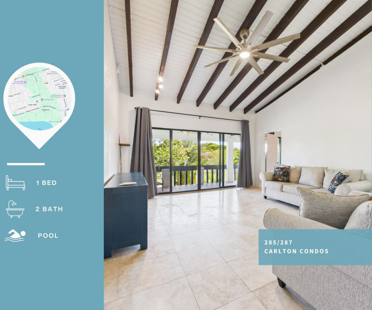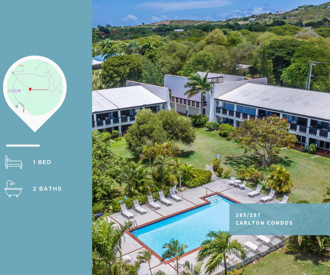 Nestled in the tropical setting of one of the Caribbean's historical & romantic islands, you'll find Carlton Condominiums filled with charm. Recently remodeled kitchen with numerous upgrades equipped with new countertops, new cabinets, refrigerator and gas stove. The unit has 2 spacious air conditioned rooms with vaulted ceilings and 2 bathrooms that have been newly painted. This is an upper level unit with an individual gallery that overlooks the south-shore with a peak-a-boo sea view. The community has spacious fenced in grounds with several fruit trees and a large swimming pool. Water, propane and trash pickup included in monthly HOA. Gated access, common laundry, 15 minute drive to West End Beaches, dining, and grocery stores. Seller is a Licensed Real Estate Agent.