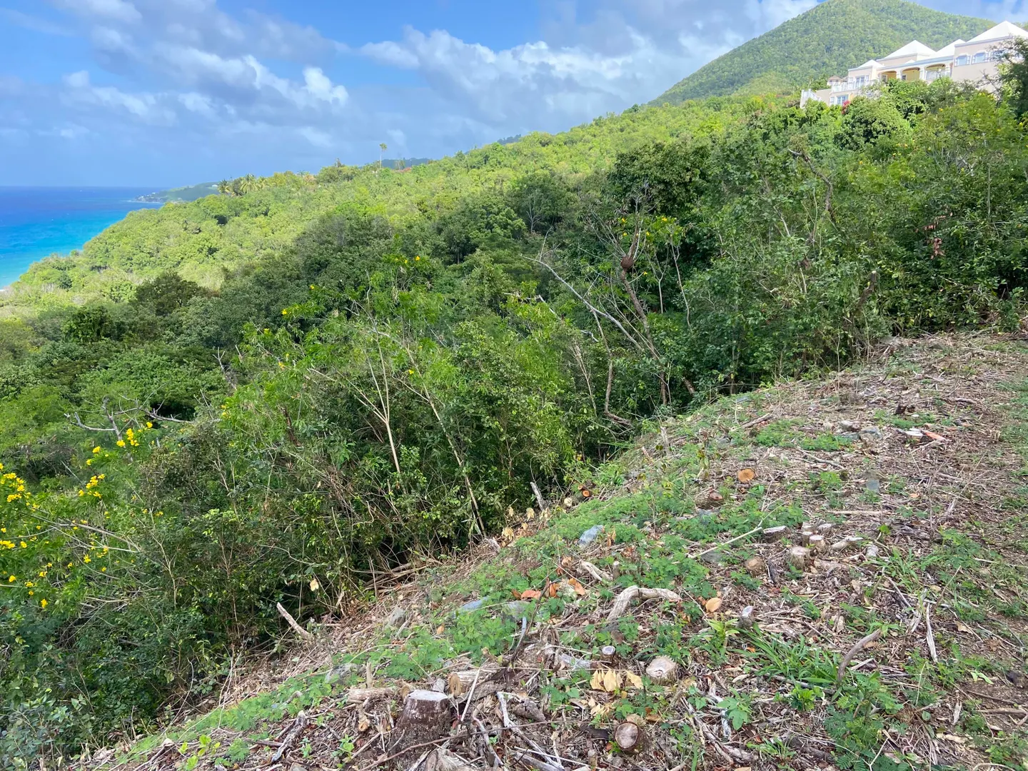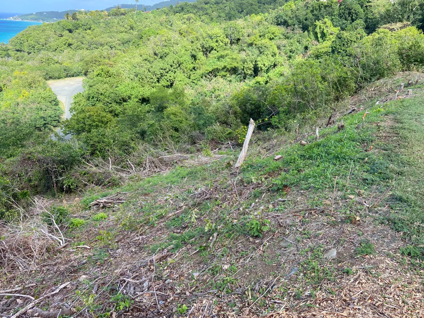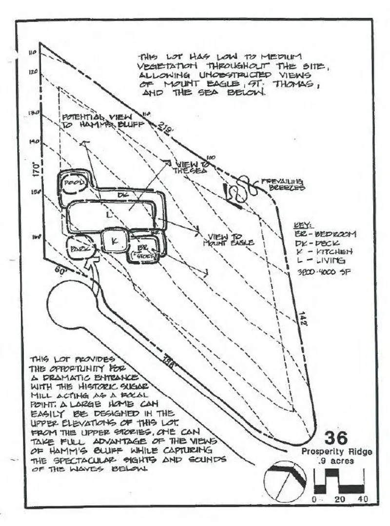 Nestled within the gated community of Prosperity Ridge at Carambola, this .79-acre corner lot offers privacy, security, and a quality building site. Located at the end of a quiet cul-de-sac and surrounded by lush tropical foliage, the property provides a peaceful and secluded setting to build your Caribbean dream home.Perched on a hillside, the lot captures breathtaking views of the Caribbean Sea, a historic sugar mill, and the untouched mountain landscape surrounding it. Constant trade winds provide natural cooling year-round, enhancing the comfort and enjoyment of outdoor living.Owners enjoy privileged access to the Carambola Beach Resort and the nearby Carambola Golf Course. Ideally located near world-renowned diving at ''The Wall'' at Cane Bay, several restaurants and golf courseLot has been cleared in past but will NOT CONTINUE to be cleared and maintained. Buyer to do a survey to confirm boundaries and any clearing would be at buyer's own expense post closing.