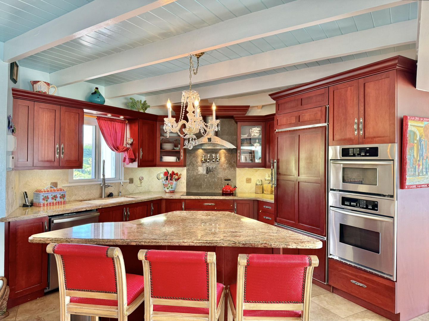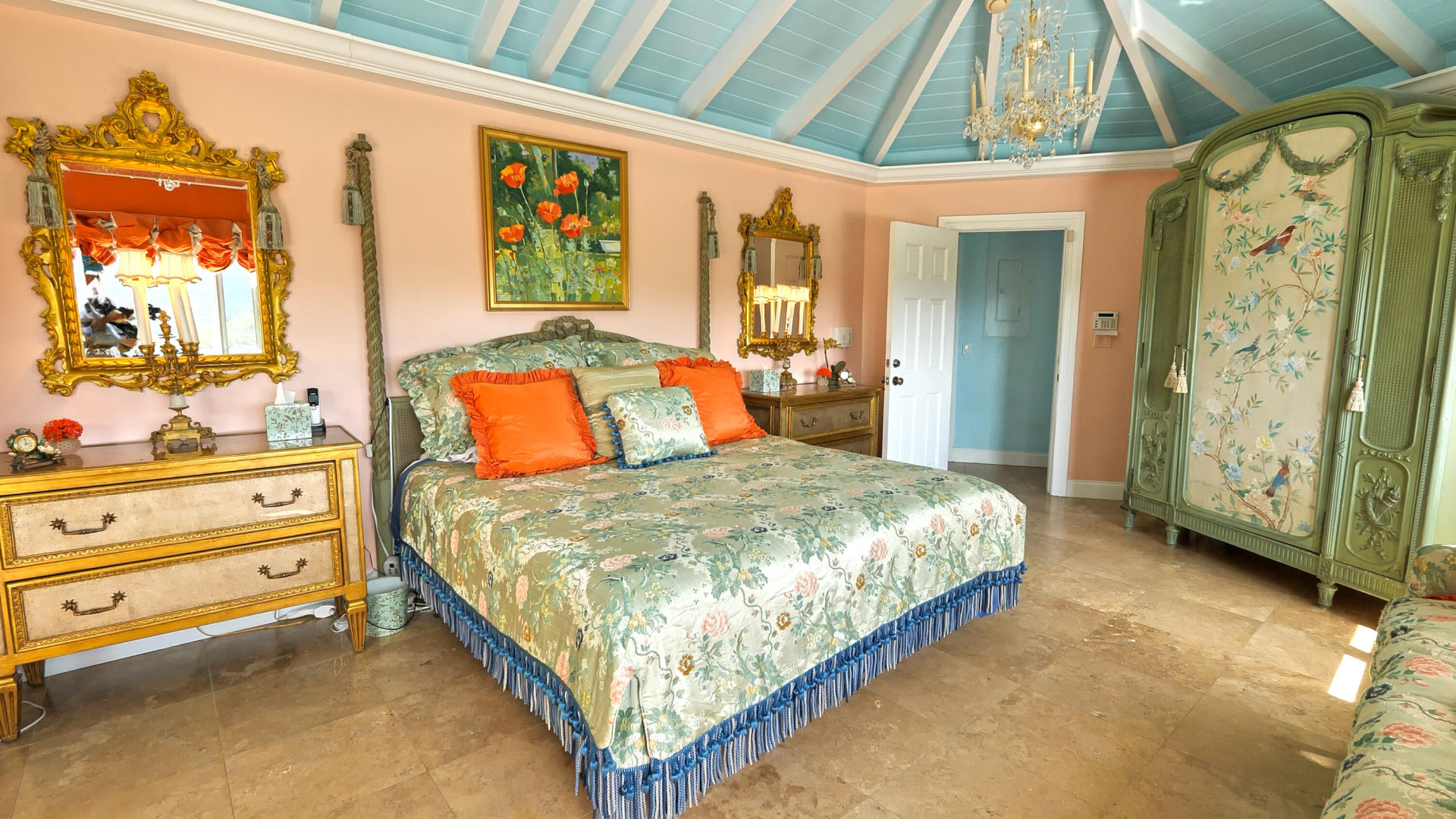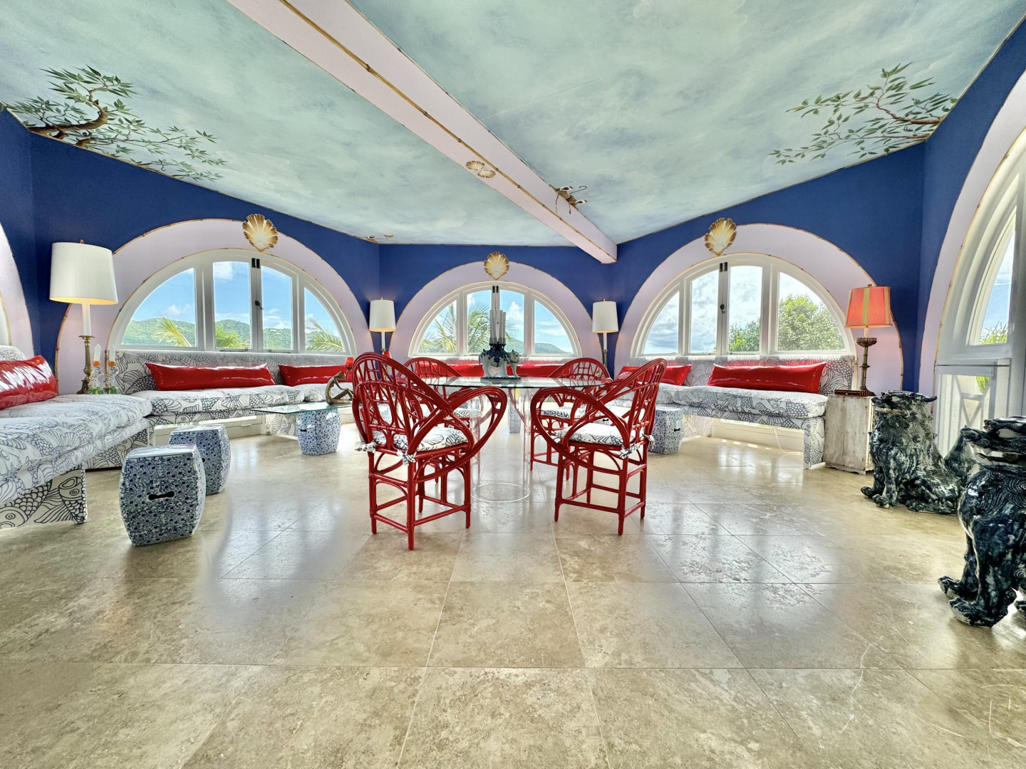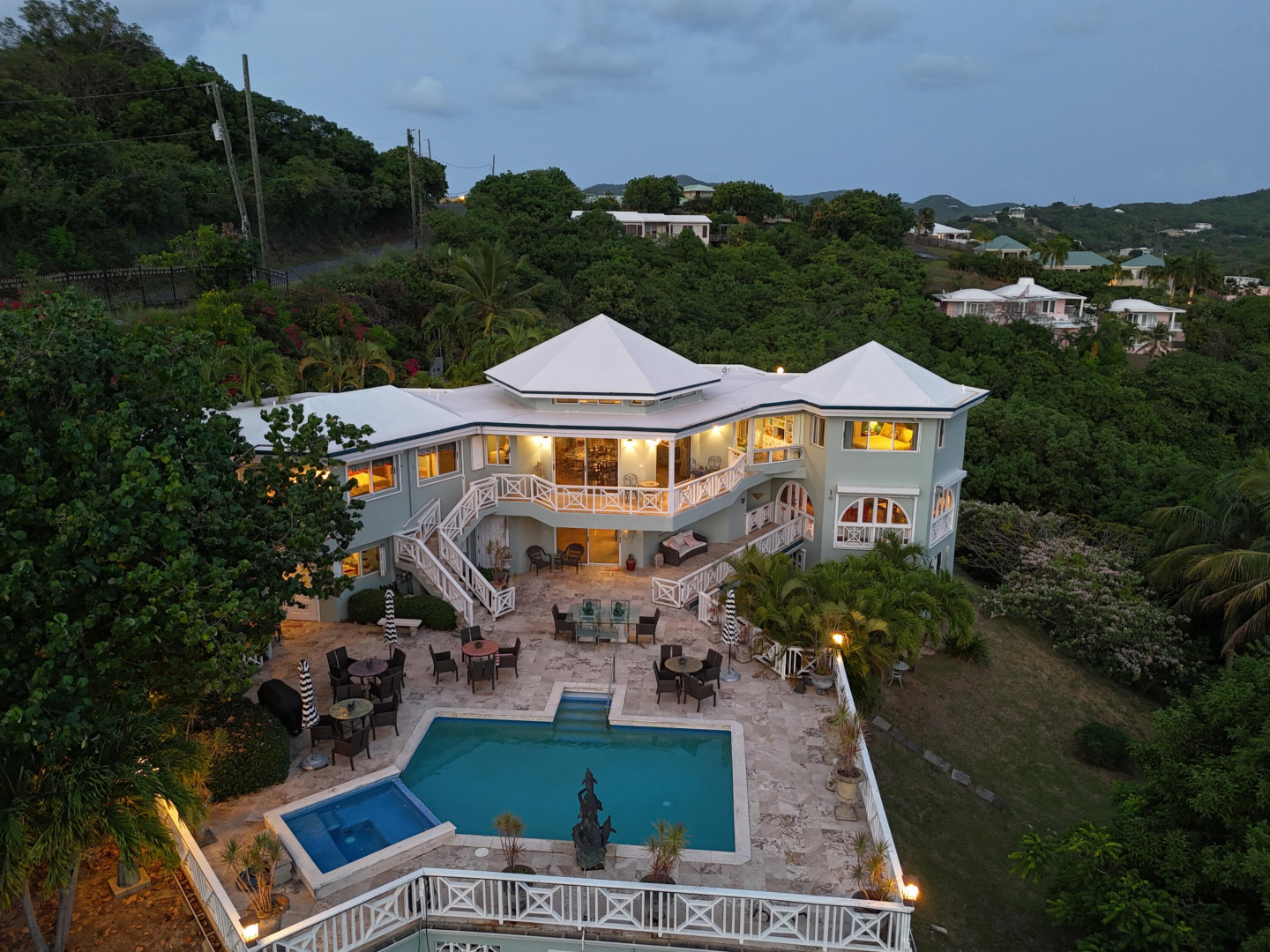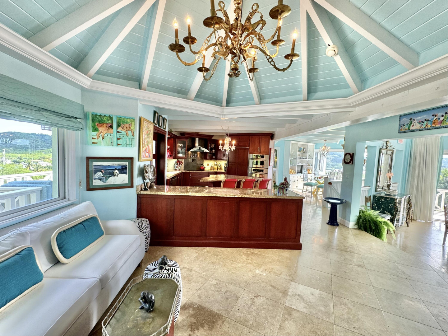 Discover Papaya Court, an iconic St. Croix estate featured in several of Carleton Varney's design books. Varney, also known as 'Mr. Color' and longtime president of Dorothy Draper & Co., was a close friend of the seller. This exquisite home is designed for grand entertaining, featuring a luxurious Chef's kitchen and dining area upstairs, complemented by a fully equipped bar with direct access to an expansive pool deck downstairs. The private and luxurious primary suite, along with three guest suites, ensures comfort for visiting guests. Nestled in the island's premier beach community, this masterpiece offers sweeping views of The Buccaneer Golf Course, Christiansted, and the Caribbean Sea. Beaches, restaurants, and shopping are just minutes away.Papaya Court is designed for grand entertaining and refined living. As you enter through a beautiful iron gate, sourced from a prestigious auction, you are welcomed by an expansive property where every detail has been thoughtfully curated. The home's layout offers multiple living areas, perfect for hosting gatherings and functions or enjoying quiet moments in the tropical breeze. The upstairs level features an open Chef's kitchen, recently updated with top-of-the-line appliances and gleaming granite countertops. The spacious island, sleek cabinetry, and high-end finishes make this kitchen an ideal space for preparing culinary delights. Adjacent to the kitchen is a formal dining room, where you can host elegant dinners while enjoying the beautiful view of the golf course and the lights of Christiansted at night. The downstairs area is equally impressive, with a fully equipped bar and lounge that opens directly onto the expansive pool deck with a large and inviting pool. The pool is set up with a pool heater to make sure the temperature stays comfortable even when the tradewinds cool it down in the winter months. Whether you're hosting large gatherings or intimate parties, this outdoor space offers the perfect venue, with ample room for sunbathing, dining, or relaxing by the pool. The poolside guest suite provides visitors with their own private living room and kitchen, allowing for extended stays in comfort and privacy.