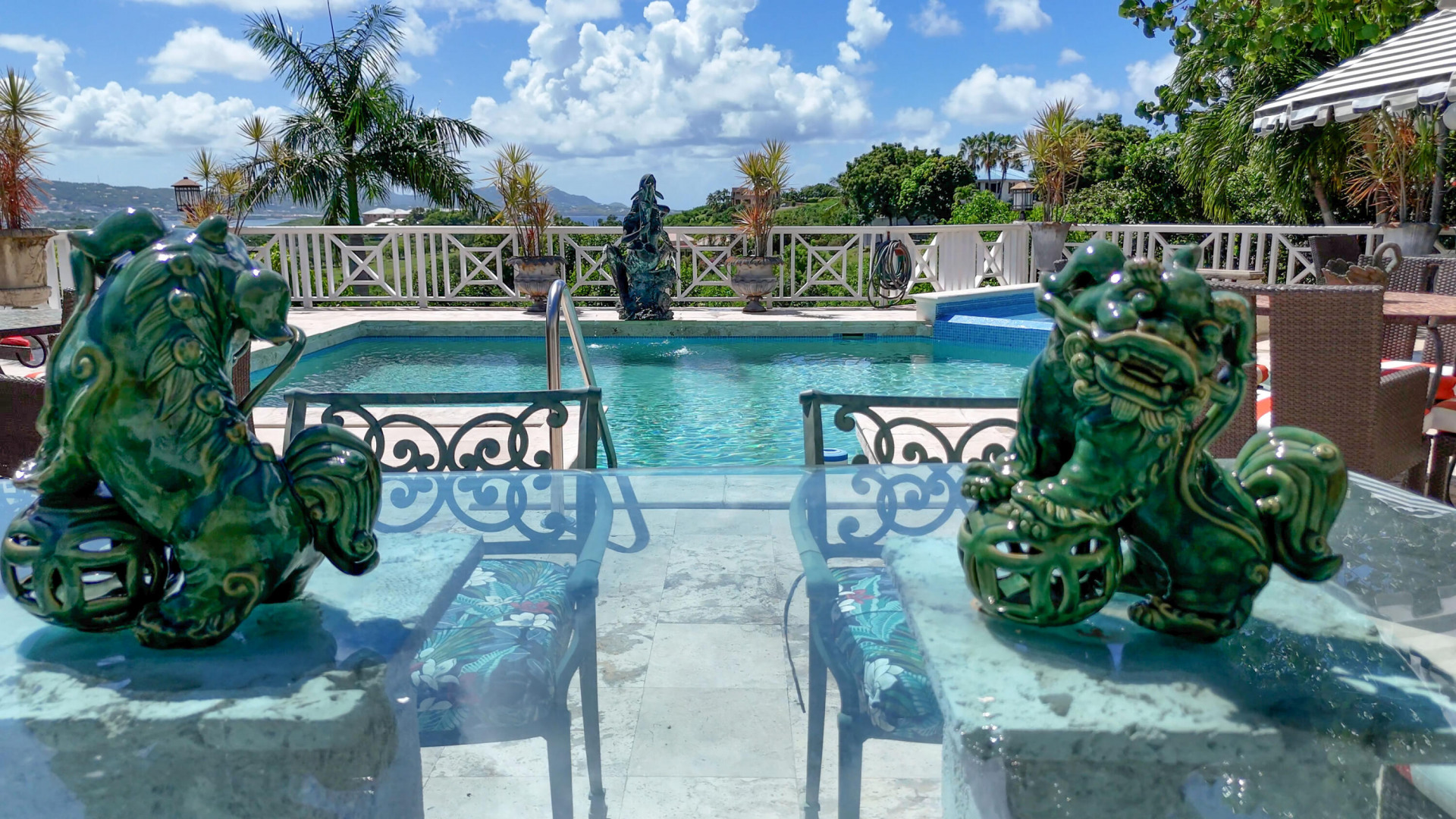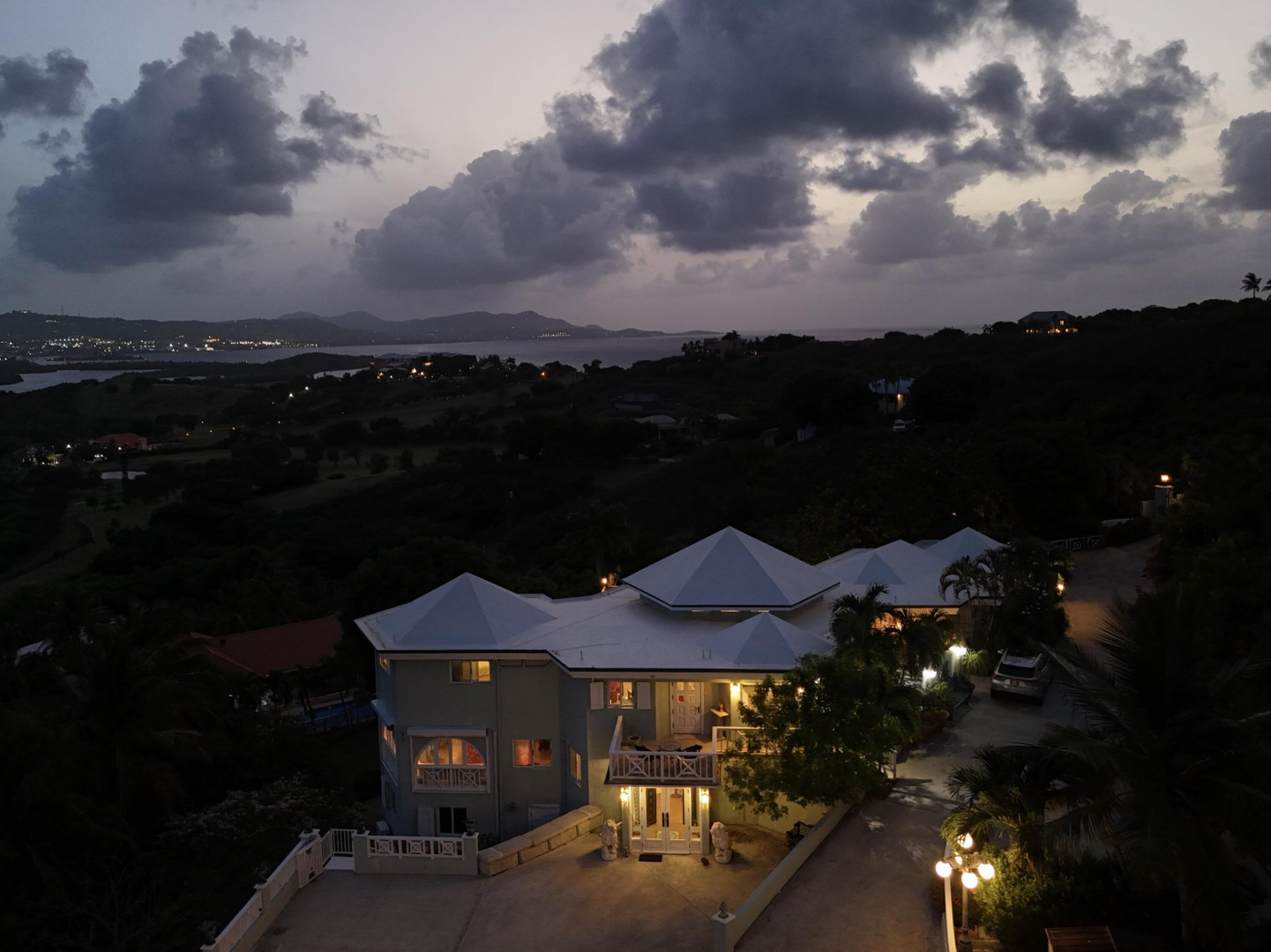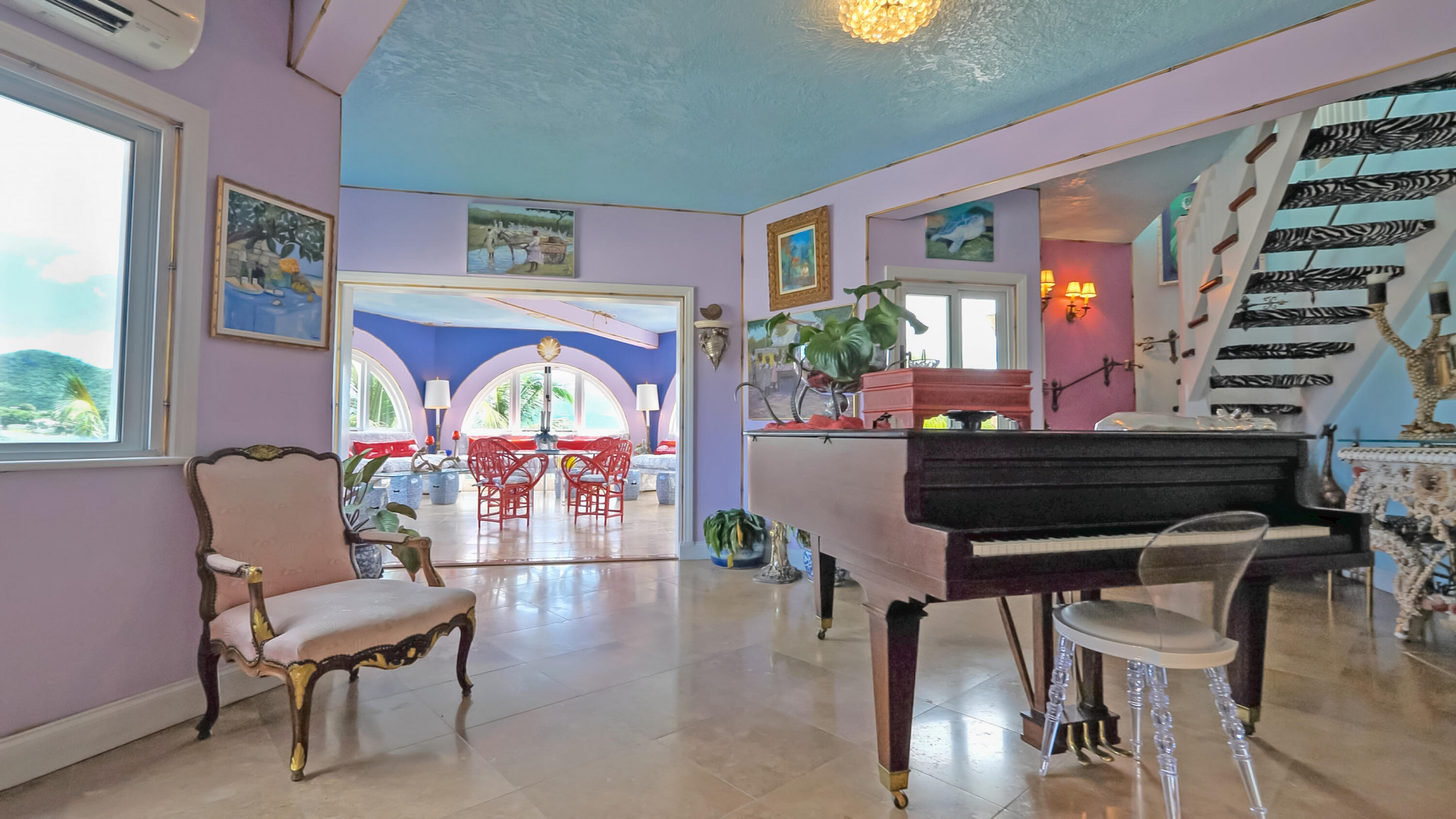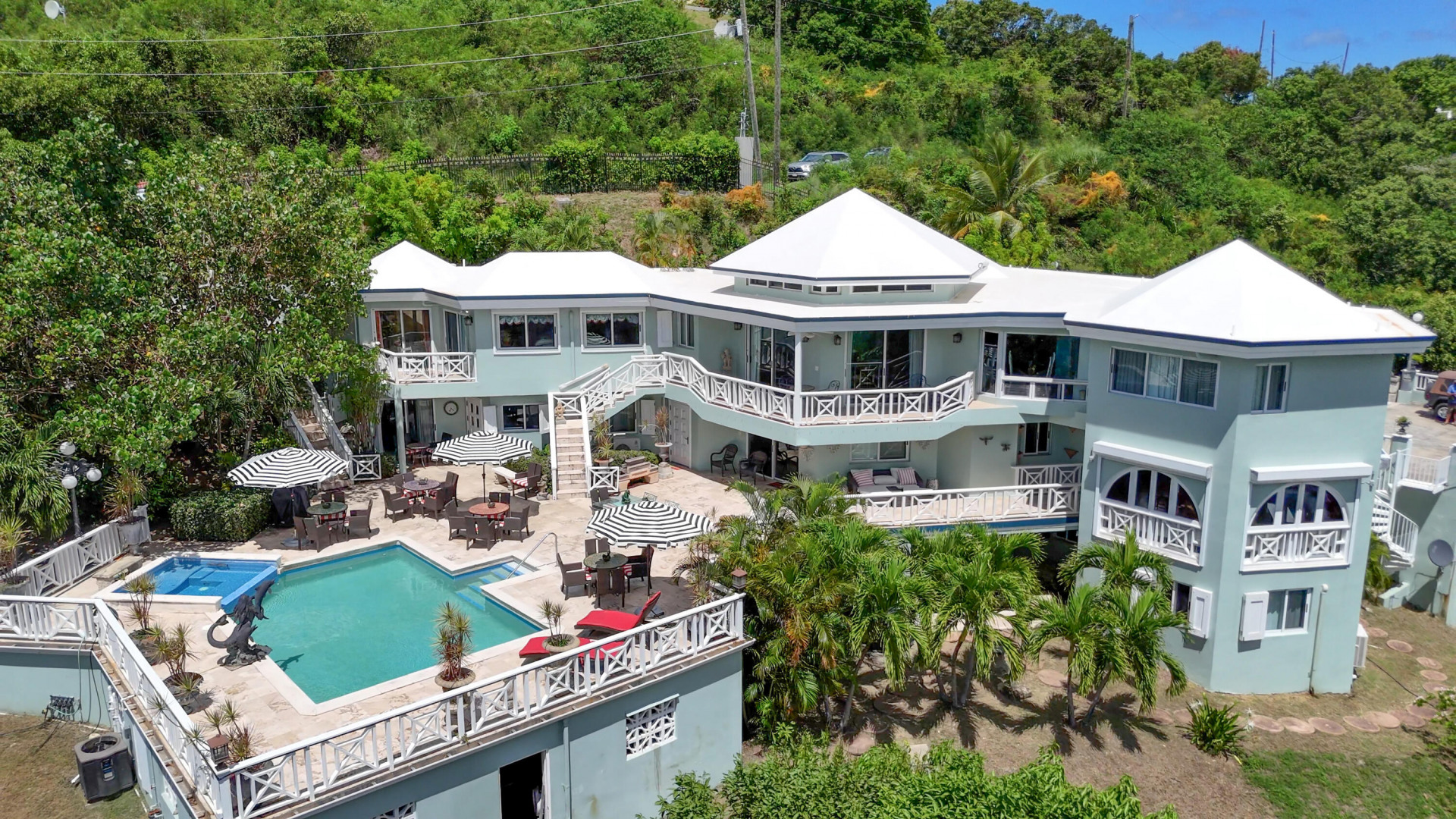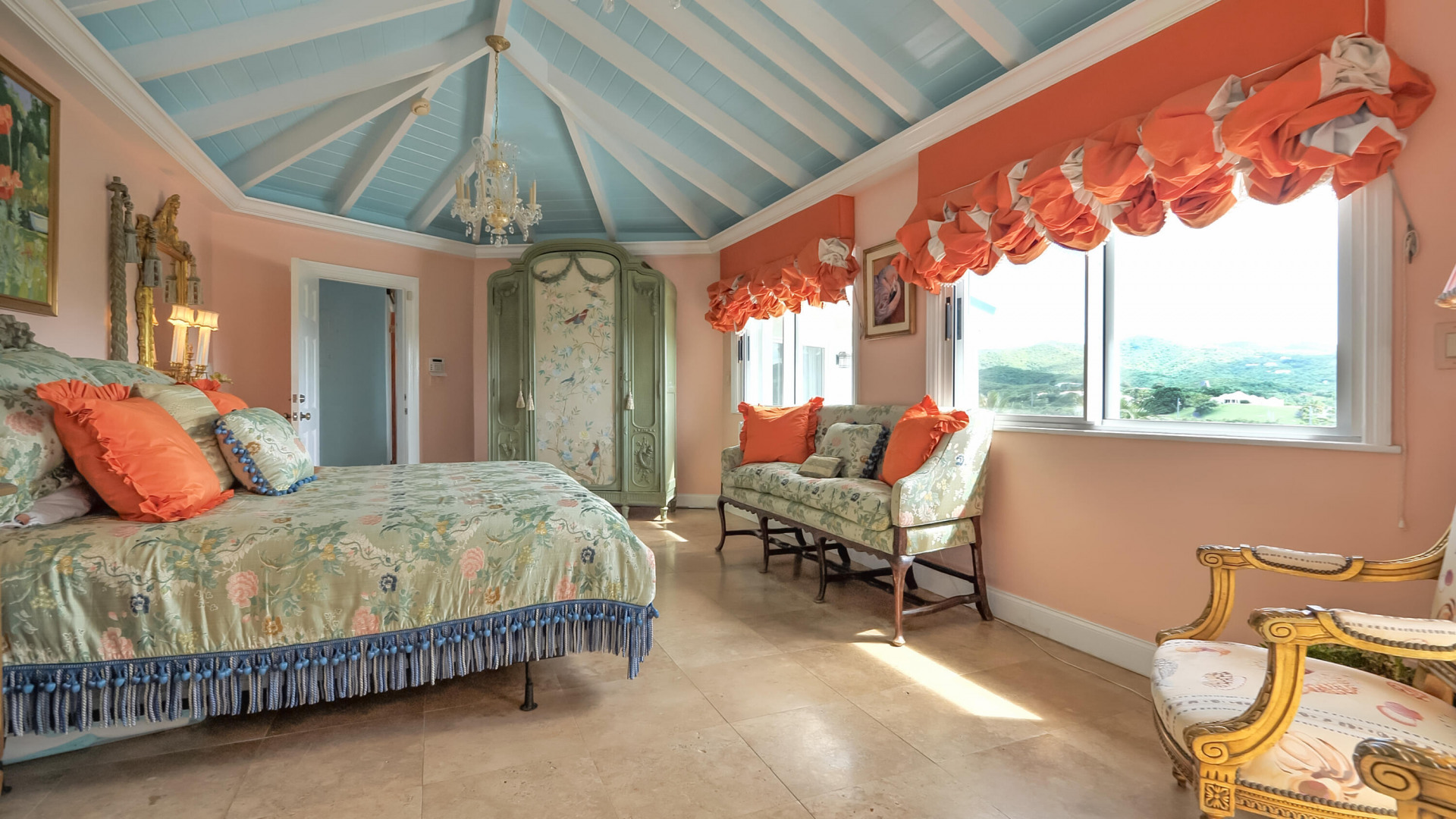 Discover Papaya Court, an iconic St. Croix estate featured in several of Carleton Varney's design books. Varney, also known as 'Mr. Color' and longtime president of Dorothy Draper & Co., was a close friend of the seller. This exquisite home is designed for grand entertaining, featuring a luxurious Chef's kitchen and dining area upstairs, complemented by a fully equipped bar with direct access to an expansive pool deck downstairs. The private and luxurious primary suite, along with three guest suites, ensures comfort for visiting guests. Nestled in the island's premier beach community, this masterpiece offers sweeping views of The Buccaneer Golf Course, Christiansted, and the Caribbean Sea. Beaches, restaurants, and shopping are just minutes away.Papaya Court is designed for grand entertaining and refined living. As you enter through a beautiful iron gate, sourced from a prestigious auction, you are welcomed by an expansive property where every detail has been thoughtfully curated. The home's layout offers multiple living areas, perfect for hosting gatherings and functions or enjoying quiet moments in the tropical breeze. The upstairs level features an open Chef's kitchen, recently updated with top-of-the-line appliances and gleaming granite countertops. The spacious island, sleek cabinetry, and high-end finishes make this kitchen an ideal space for preparing culinary delights. Adjacent to the kitchen is a formal dining room, where you can host elegant dinners while enjoying the beautiful view of the golf course and the lights of Christiansted at night. The downstairs area is equally impressive, with a fully equipped bar and lounge that opens directly onto the expansive pool deck with a large and inviting pool. The pool is set up with a pool heater to make sure the temperature stays comfortable even when the tradewinds cool it down in the winter months. Whether you're hosting large gatherings or intimate parties, this outdoor space offers the perfect venue, with ample room for sunbathing, dining, or relaxing by the pool. The poolside guest suite provides visitors with their own private living room and kitchen, allowing for extended stays in comfort and privacy.