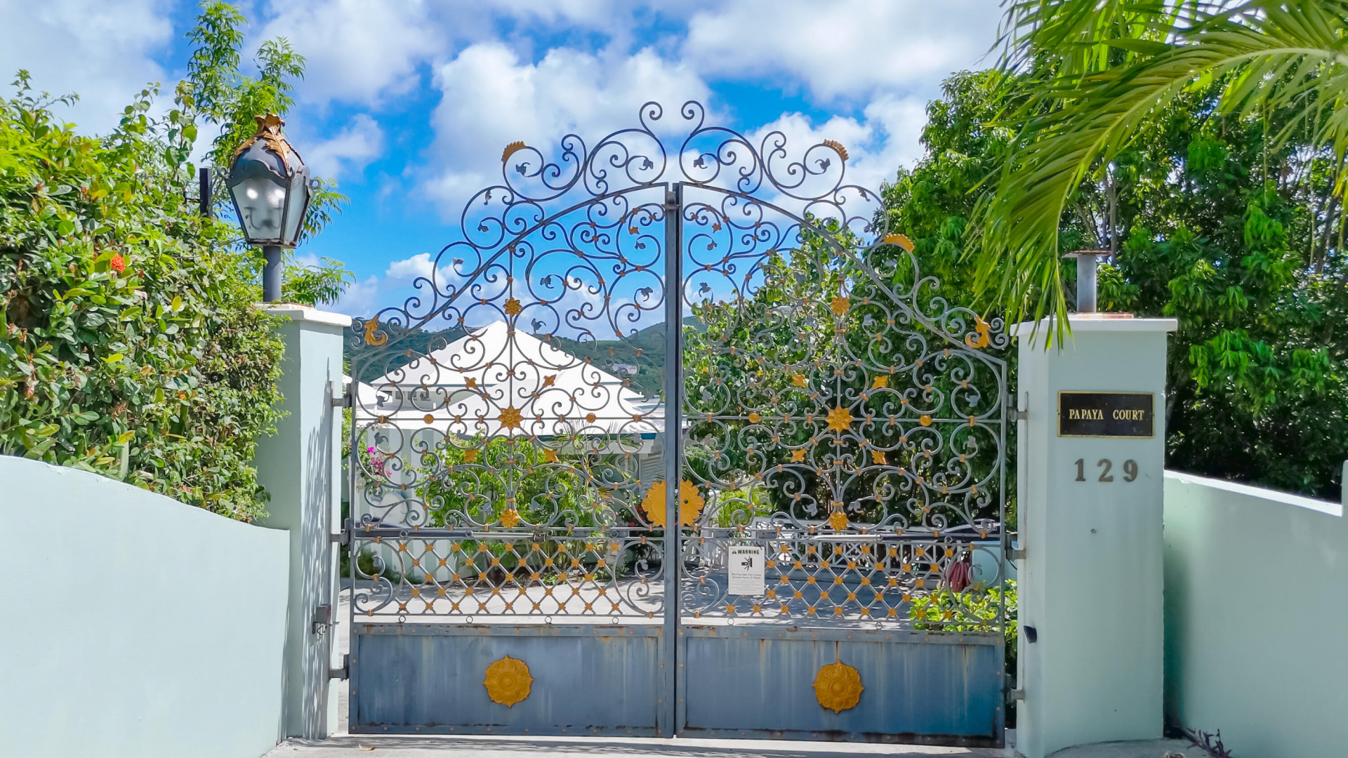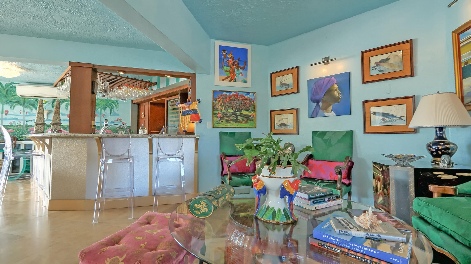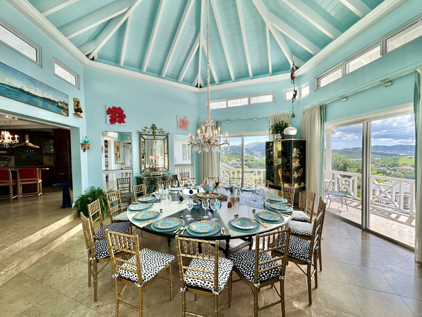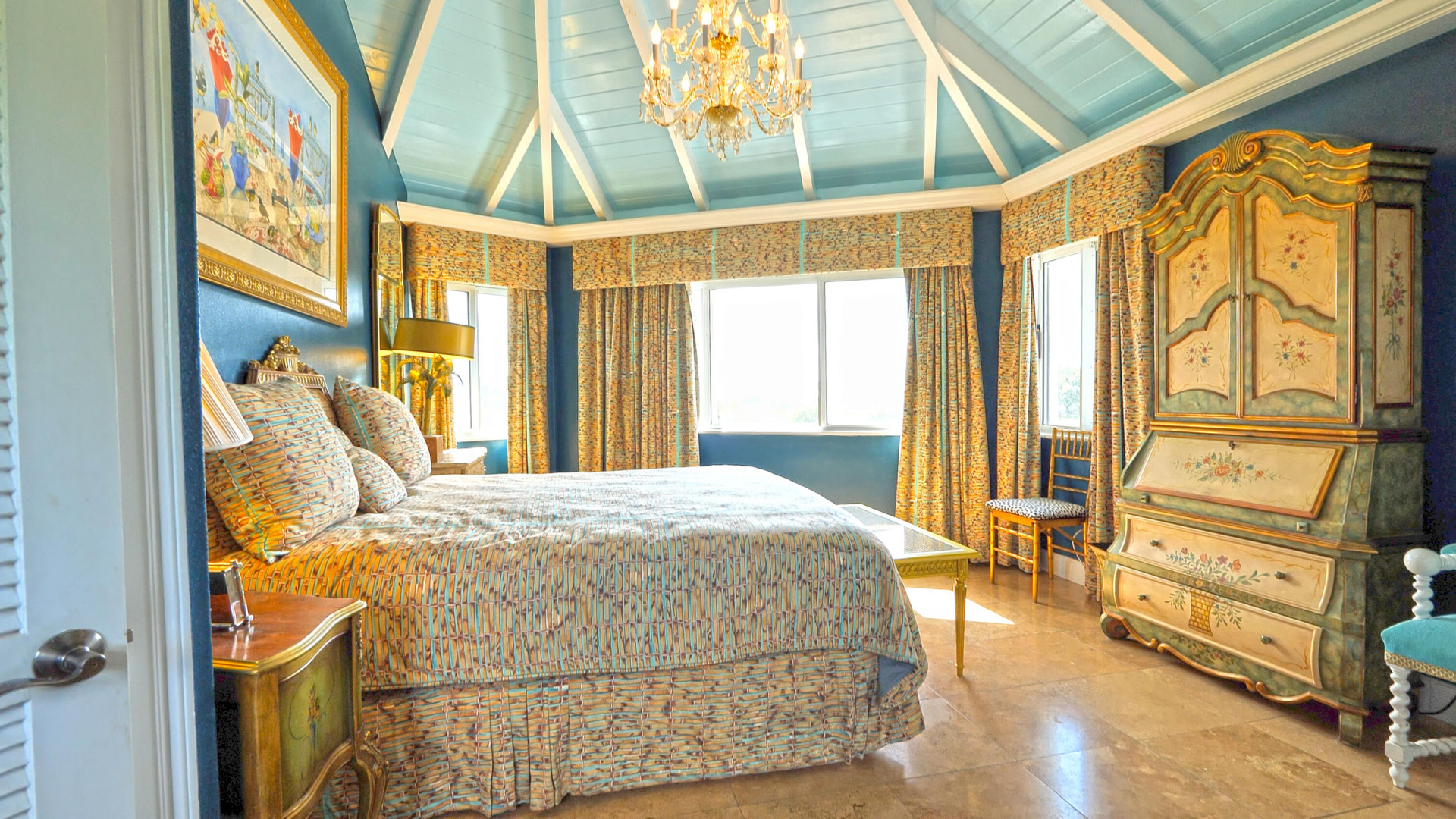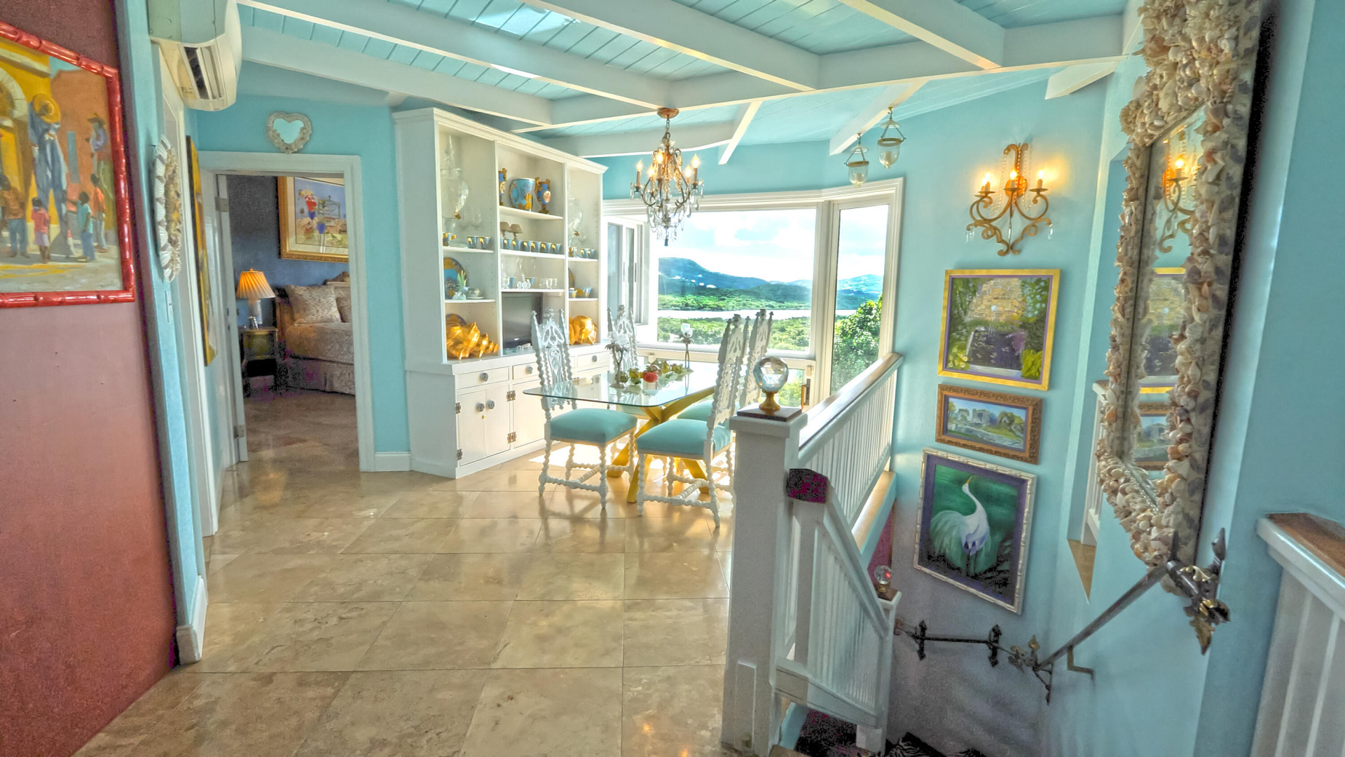 Discover Papaya Court, an iconic St. Croix estate featured in several of Carleton Varney's design books. Varney, also known as 'Mr. Color' and longtime president of Dorothy Draper & Co., was a close friend of the seller. This exquisite home is designed for grand entertaining, featuring a luxurious Chef's kitchen and dining area upstairs, complemented by a fully equipped bar with direct access to an expansive pool deck downstairs. The private and luxurious primary suite, along with three guest suites, ensures comfort for visiting guests. Nestled in the island's premier beach community, this masterpiece offers sweeping views of The Buccaneer Golf Course, Christiansted, and the Caribbean Sea. Beaches, restaurants, and shopping are just minutes away.Papaya Court is designed for grand entertaining and refined living. As you enter through a beautiful iron gate, sourced from a prestigious auction, you are welcomed by an expansive property where every detail has been thoughtfully curated. The home's layout offers multiple living areas, perfect for hosting gatherings and functions or enjoying quiet moments in the tropical breeze. The upstairs level features an open Chef's kitchen, recently updated with top-of-the-line appliances and gleaming granite countertops. The spacious island, sleek cabinetry, and high-end finishes make this kitchen an ideal space for preparing culinary delights. Adjacent to the kitchen is a formal dining room, where you can host elegant dinners while enjoying the beautiful view of the golf course and the lights of Christiansted at night. The downstairs area is equally impressive, with a fully equipped bar and lounge that opens directly onto the expansive pool deck with a large and inviting pool. The pool is set up with a pool heater to make sure the temperature stays comfortable even when the tradewinds cool it down in the winter months. Whether you're hosting large gatherings or intimate parties, this outdoor space offers the perfect venue, with ample room for sunbathing, dining, or relaxing by the pool. The poolside guest suite provides visitors with their own private living room and kitchen, allowing for extended stays in comfort and privacy.