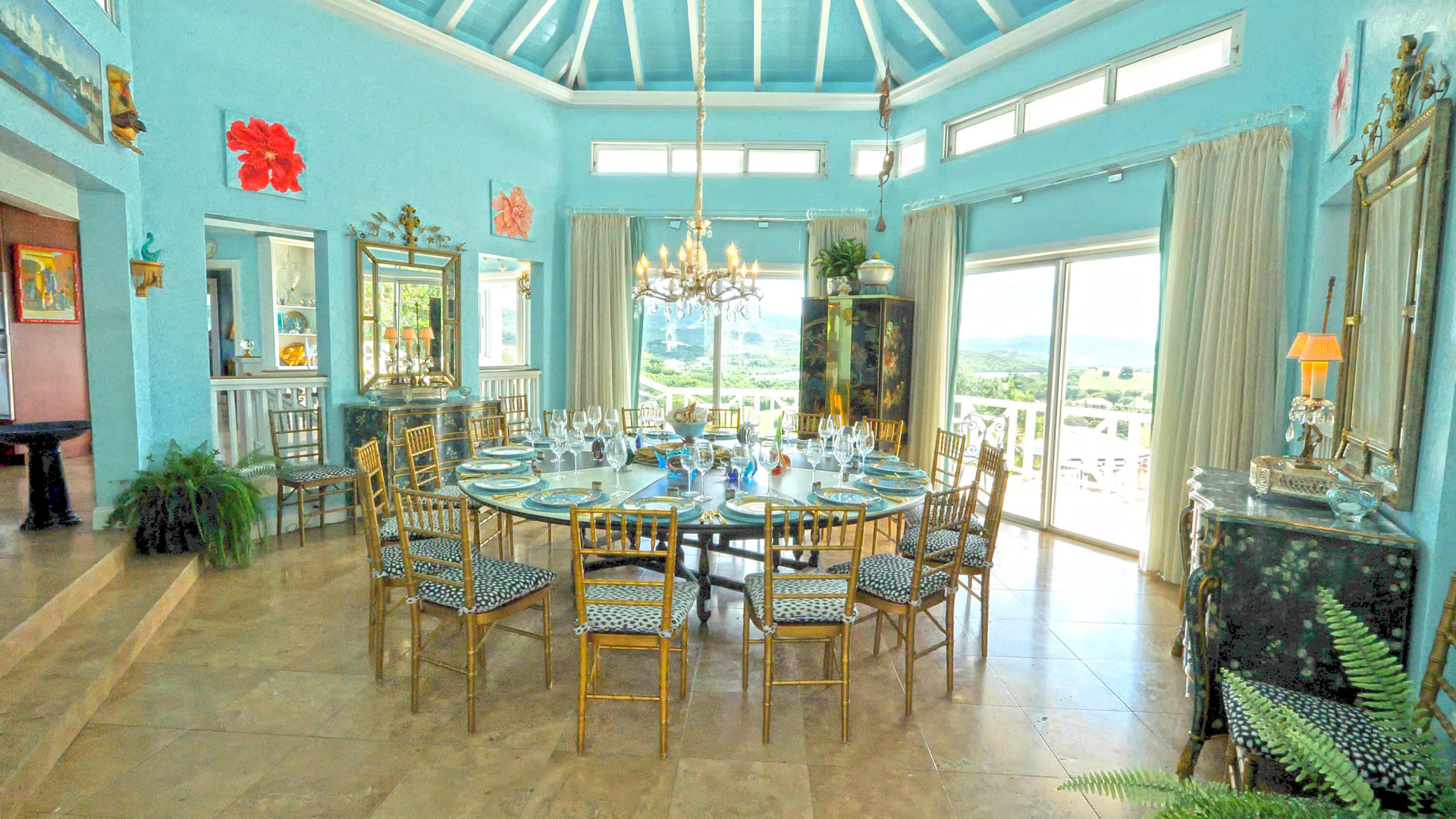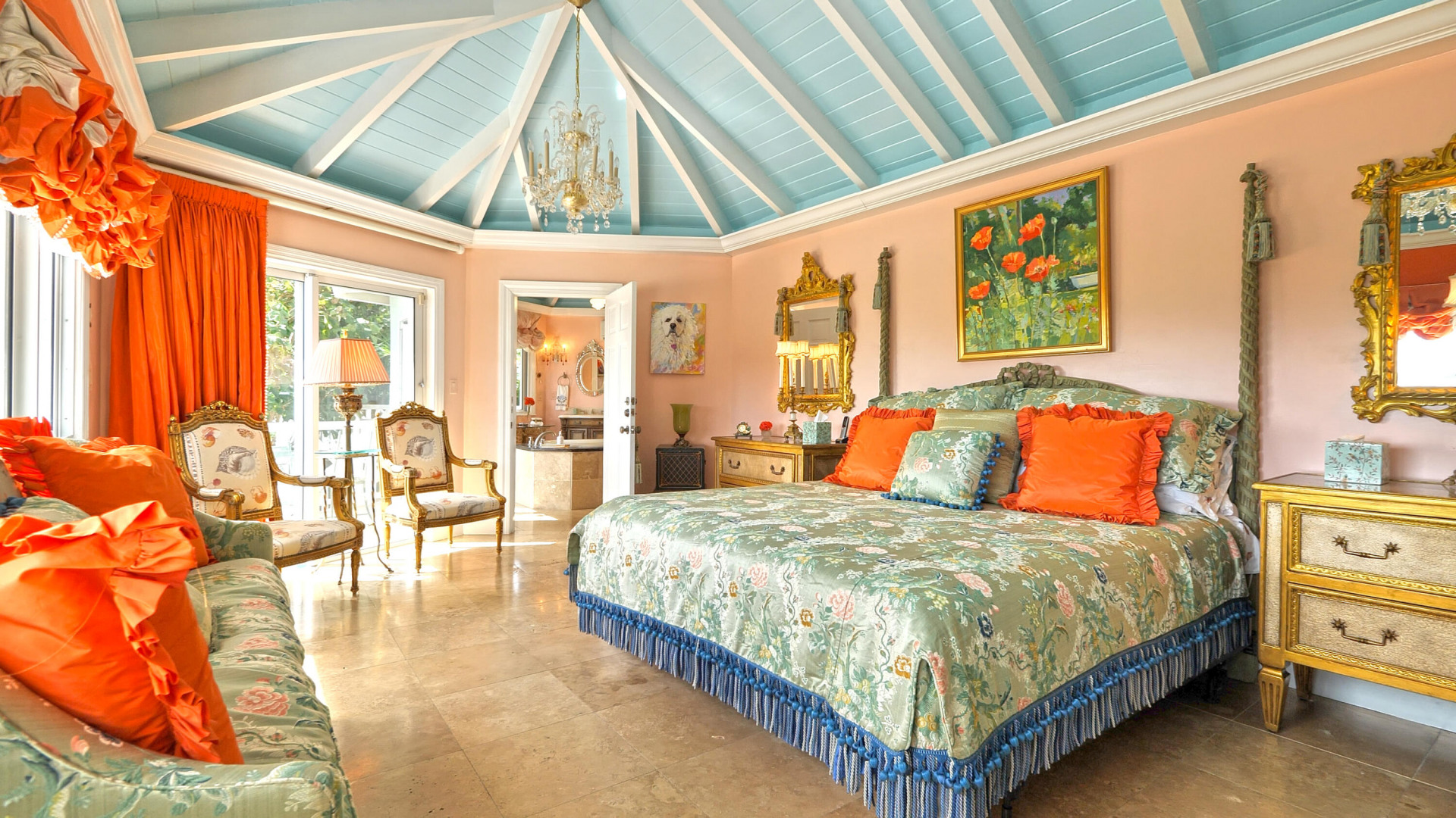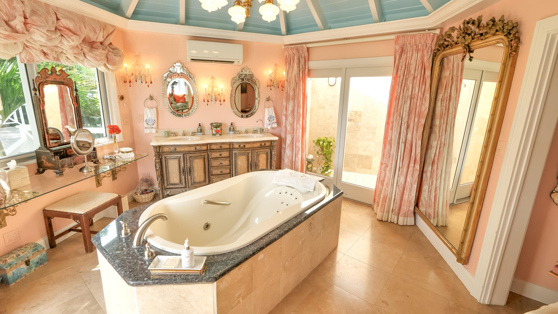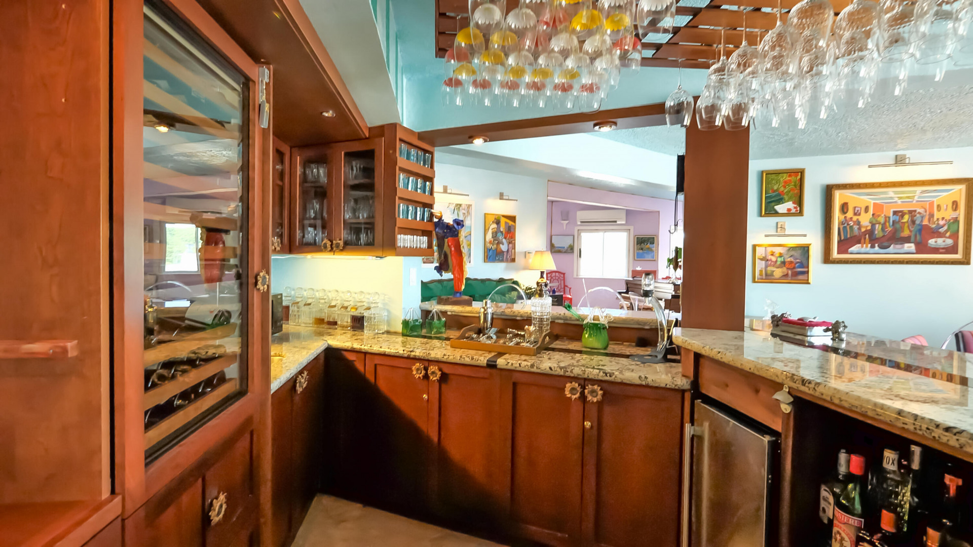 Discover Papaya Court, an iconic St. Croix estate featured in several of Carleton Varney's design books. Varney, also known as 'Mr. Color' and longtime president of Dorothy Draper & Co., was a close friend of the seller. This exquisite home is designed for grand entertaining, featuring a luxurious Chef's kitchen and dining area upstairs, complemented by a fully equipped bar with direct access to an expansive pool deck downstairs. The private and luxurious primary suite, along with three guest suites, ensures comfort for visiting guests. Nestled in the island's premier beach community, this masterpiece offers sweeping views of The Buccaneer Golf Course, Christiansted, and the Caribbean Sea. Beaches, restaurants, and shopping are just minutes away.Papaya Court is designed for grand entertaining and refined living. As you enter through a beautiful iron gate, sourced from a prestigious auction, you are welcomed by an expansive property where every detail has been thoughtfully curated. The home's layout offers multiple living areas, perfect for hosting gatherings and functions or enjoying quiet moments in the tropical breeze. The upstairs level features an open Chef's kitchen, recently updated with top-of-the-line appliances and gleaming granite countertops. The spacious island, sleek cabinetry, and high-end finishes make this kitchen an ideal space for preparing culinary delights. Adjacent to the kitchen is a formal dining room, where you can host elegant dinners while enjoying the beautiful view of the golf course and the lights of Christiansted at night. The downstairs area is equally impressive, with a fully equipped bar and lounge that opens directly onto the expansive pool deck with a large and inviting pool. The pool is set up with a pool heater to make sure the temperature stays comfortable even when the tradewinds cool it down in the winter months. Whether you're hosting large gatherings or intimate parties, this outdoor space offers the perfect venue, with ample room for sunbathing, dining, or relaxing by the pool. The poolside guest suite provides visitors with their own private living room and kitchen, allowing for extended stays in comfort and privacy.
