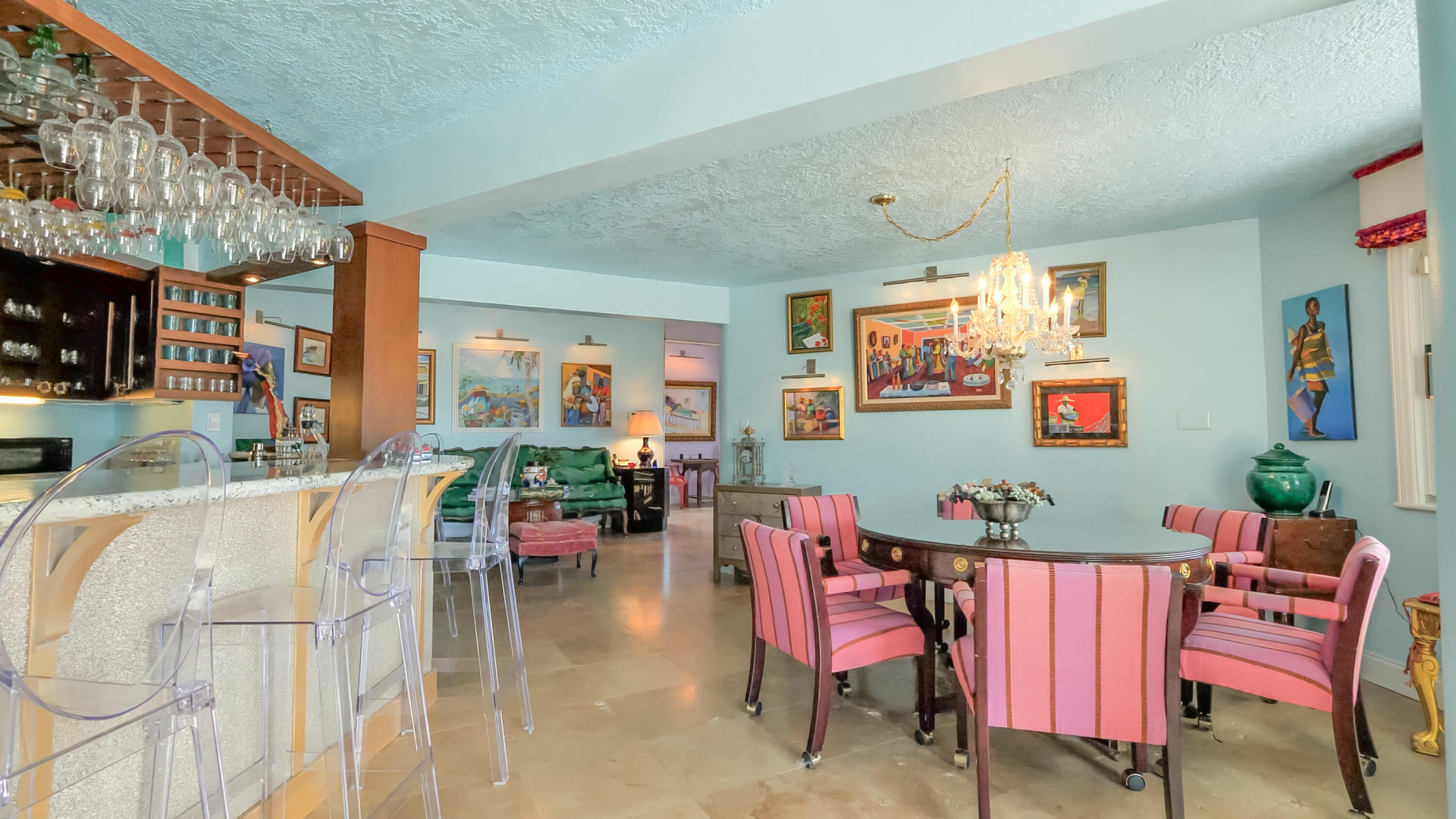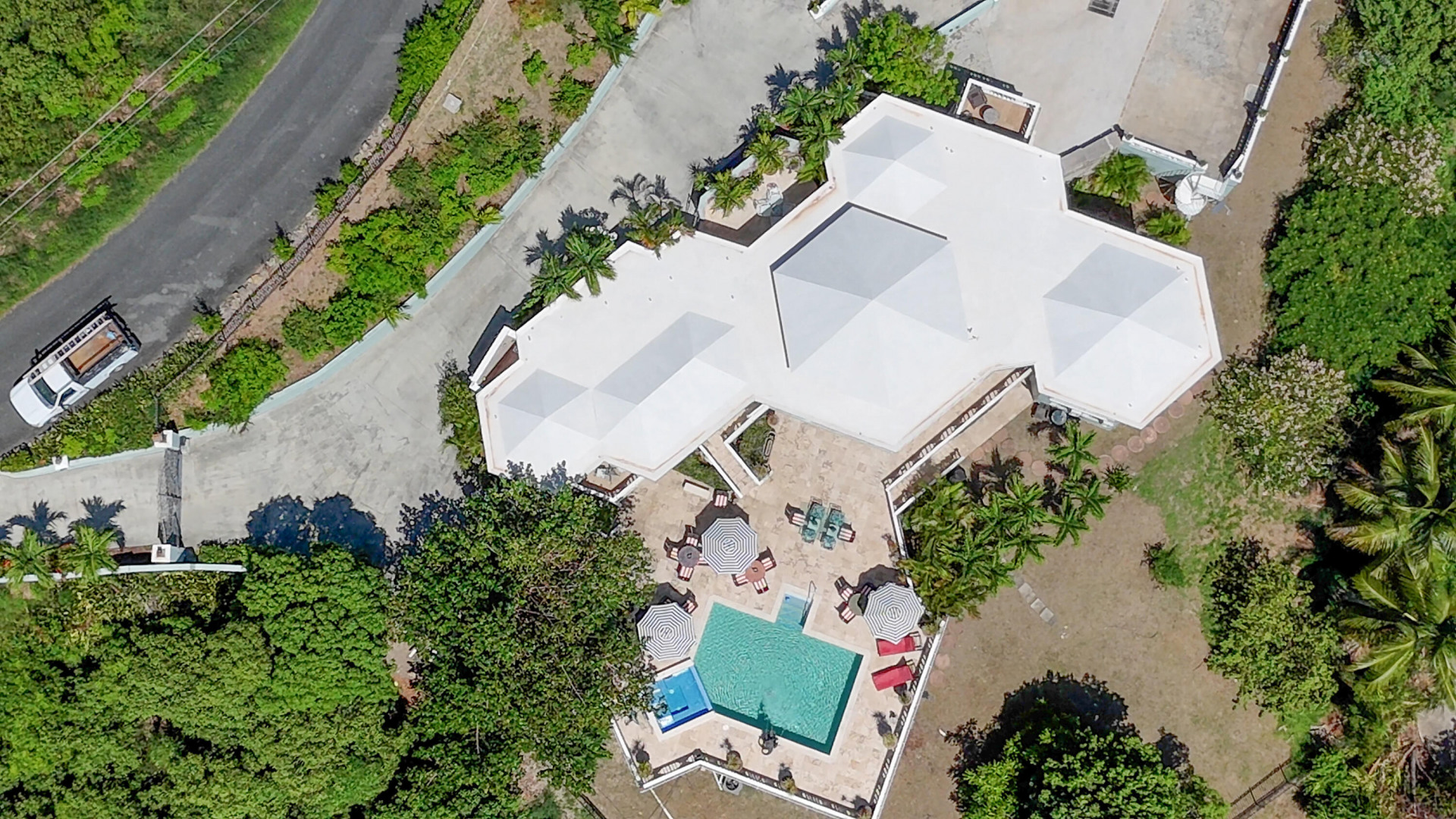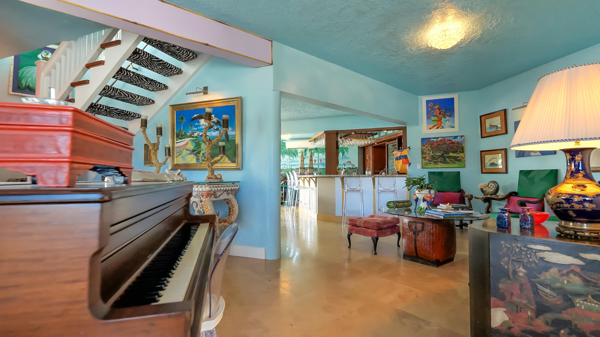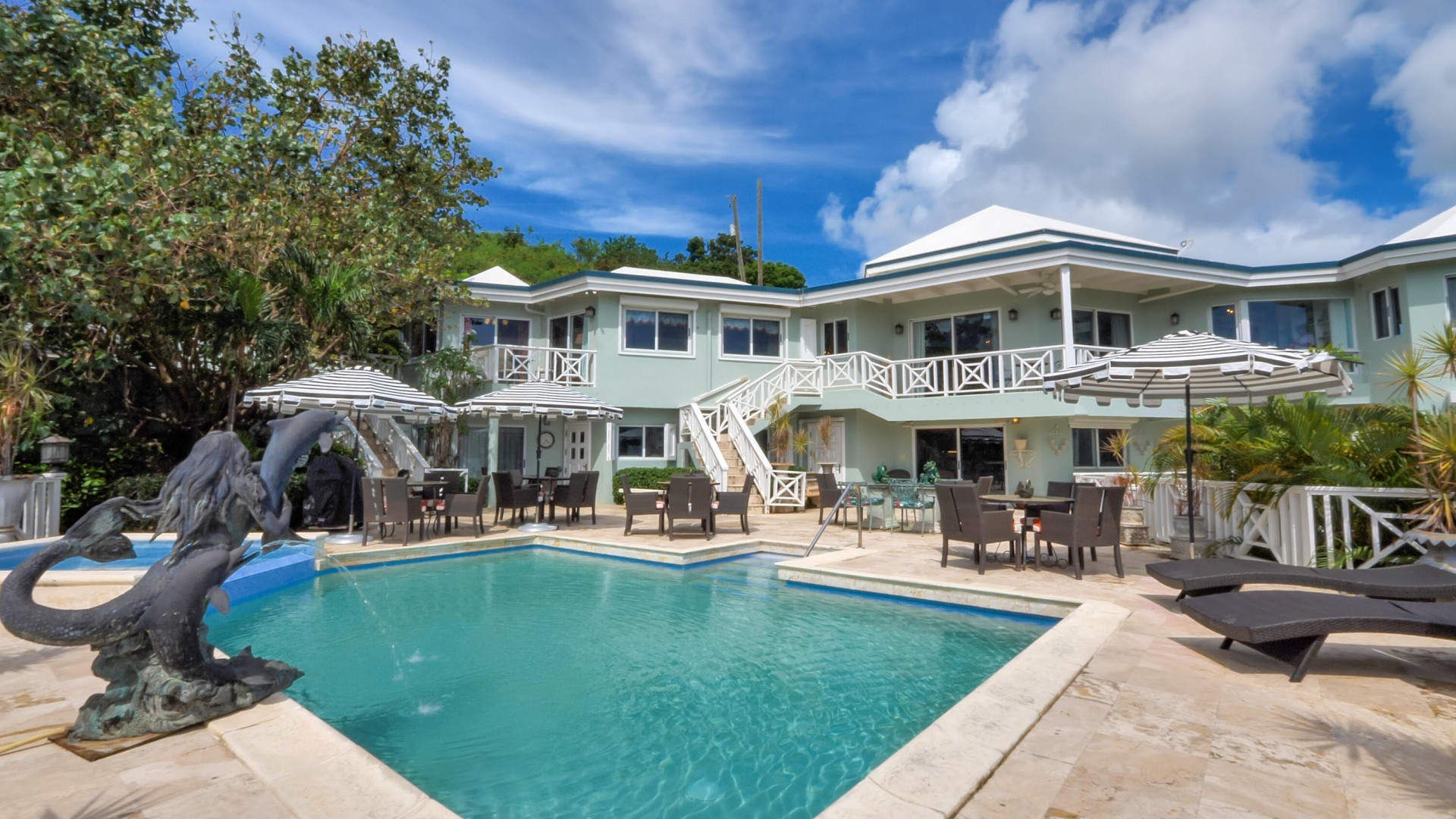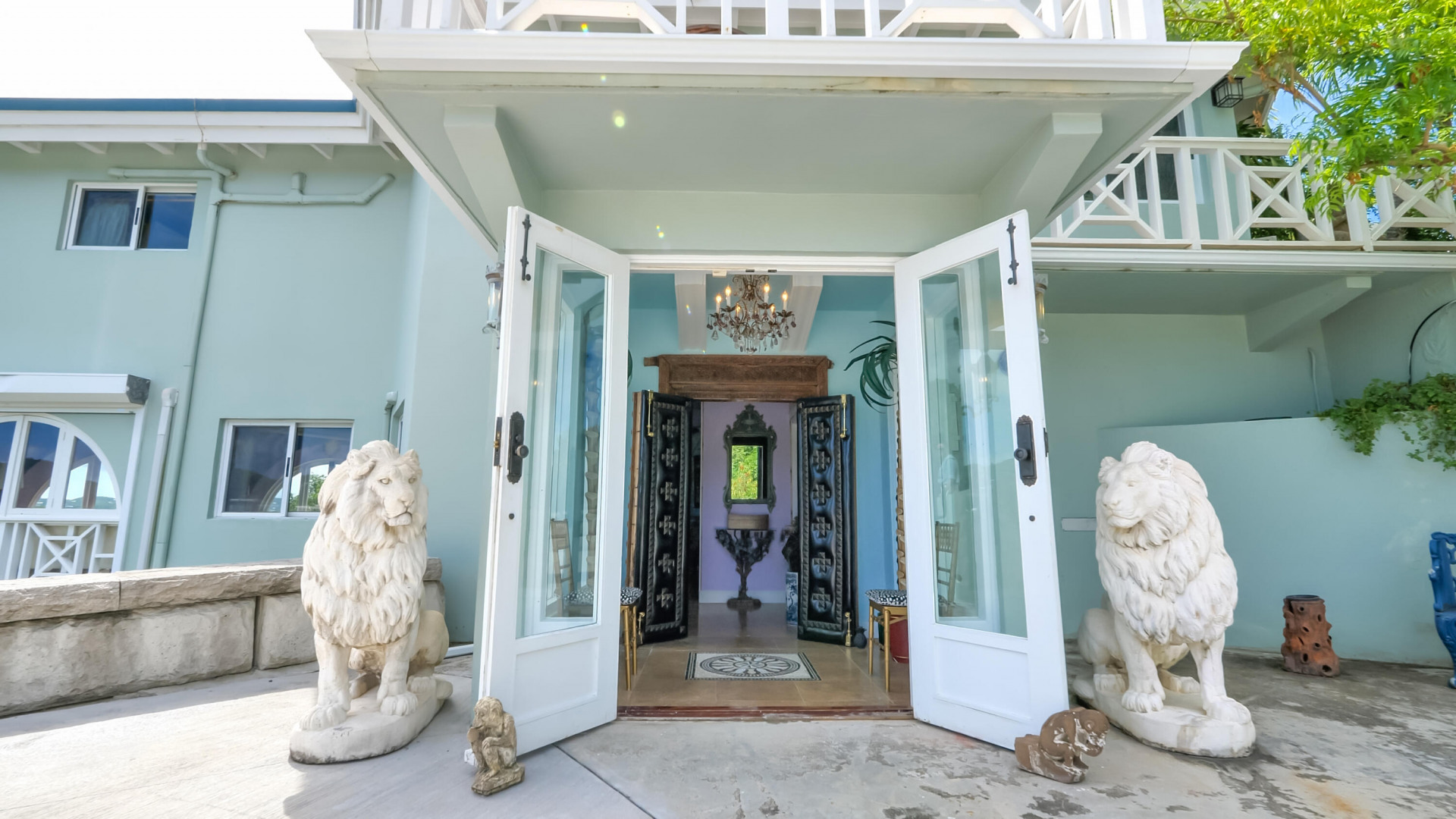Discover Papaya Court, an iconic St. Croix estate featured in several of Carleton Varney's design books. Varney, also known as 'Mr. Color' and longtime president of Dorothy Draper & Co., was a close friend of the seller. This exquisite home is designed for grand entertaining, featuring a luxurious Chef's kitchen and dining area upstairs, complemented by a fully equipped bar with direct access to an expansive pool deck downstairs. The private and luxurious primary suite, along with three guest suites, ensures comfort for visiting guests. Nestled in the island's premier beach community, this masterpiece offers sweeping views of The Buccaneer Golf Course, Christiansted, and the Caribbean Sea. Beaches, restaurants, and shopping are just minutes away.Papaya Court is designed for grand entertaining and refined living. As you enter through a beautiful iron gate, sourced from a prestigious auction, you are welcomed by an expansive property where every detail has been thoughtfully curated. The home's layout offers multiple living areas, perfect for hosting gatherings and functions or enjoying quiet moments in the tropical breeze. The upstairs level features an open Chef's kitchen, recently updated with top-of-the-line appliances and gleaming granite countertops. The spacious island, sleek cabinetry, and high-end finishes make this kitchen an ideal space for preparing culinary delights. Adjacent to the kitchen is a formal dining room, where you can host elegant dinners while enjoying the beautiful view of the golf course and the lights of Christiansted at night. The downstairs area is equally impressive, with a fully equipped bar and lounge that opens directly onto the expansive pool deck with a large and inviting pool. The pool is set up with a pool heater to make sure the temperature stays comfortable even when the tradewinds cool it down in the winter months. Whether you're hosting large gatherings or intimate parties, this outdoor space offers the perfect venue, with ample room for sunbathing, dining, or relaxing by the pool. The poolside guest suite provides visitors with their own private living room and kitchen, allowing for extended stays in comfort and privacy.