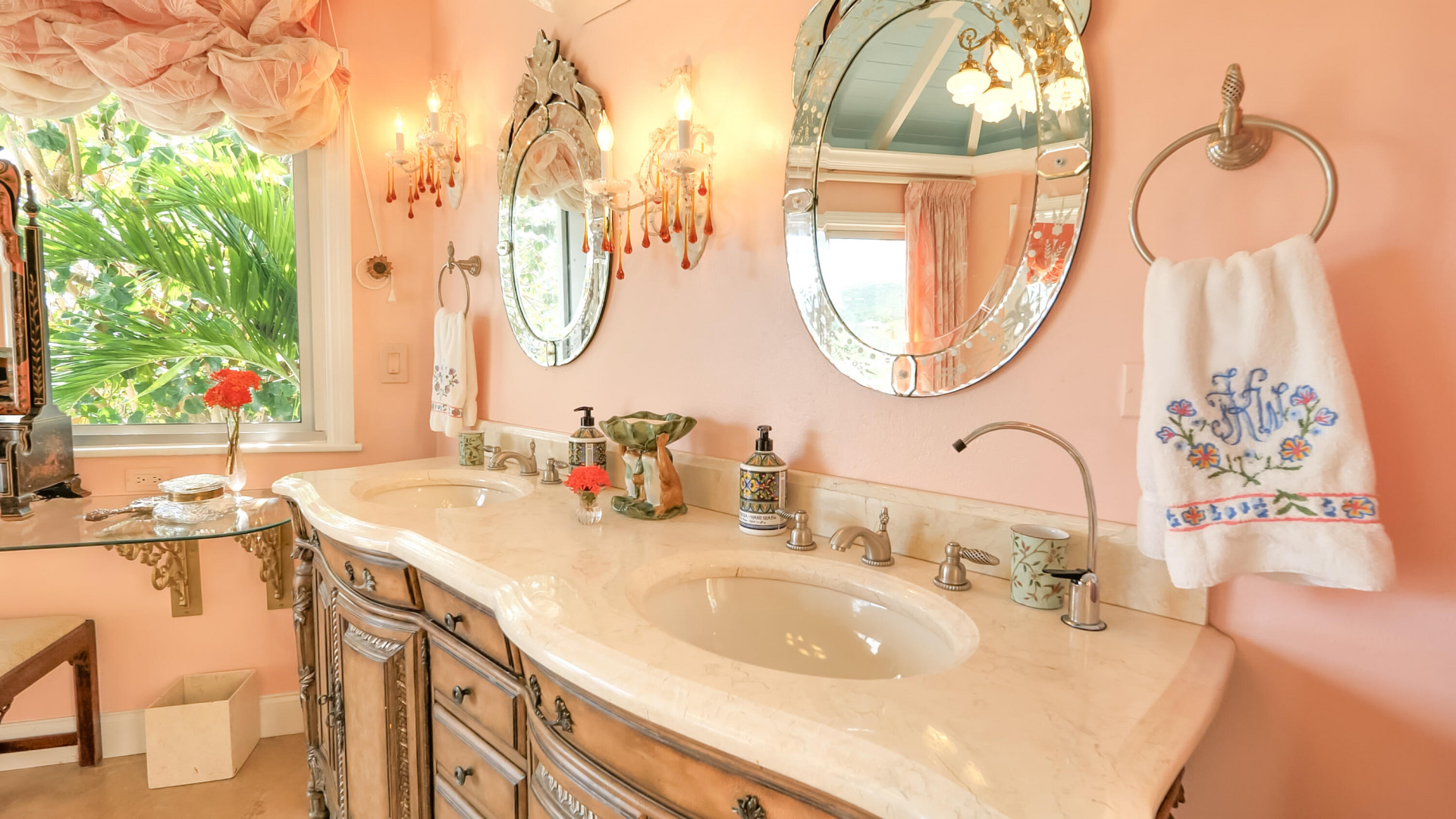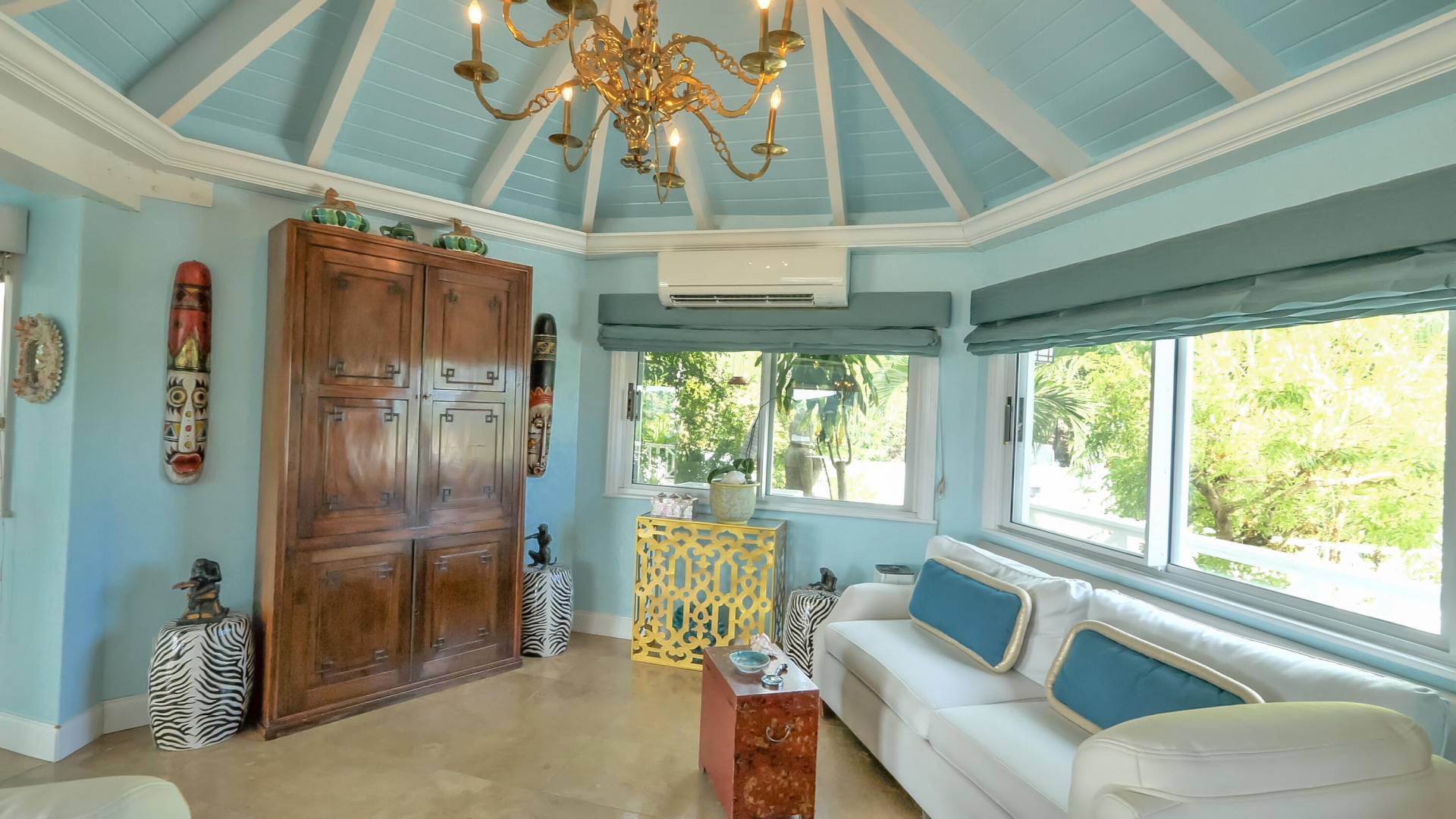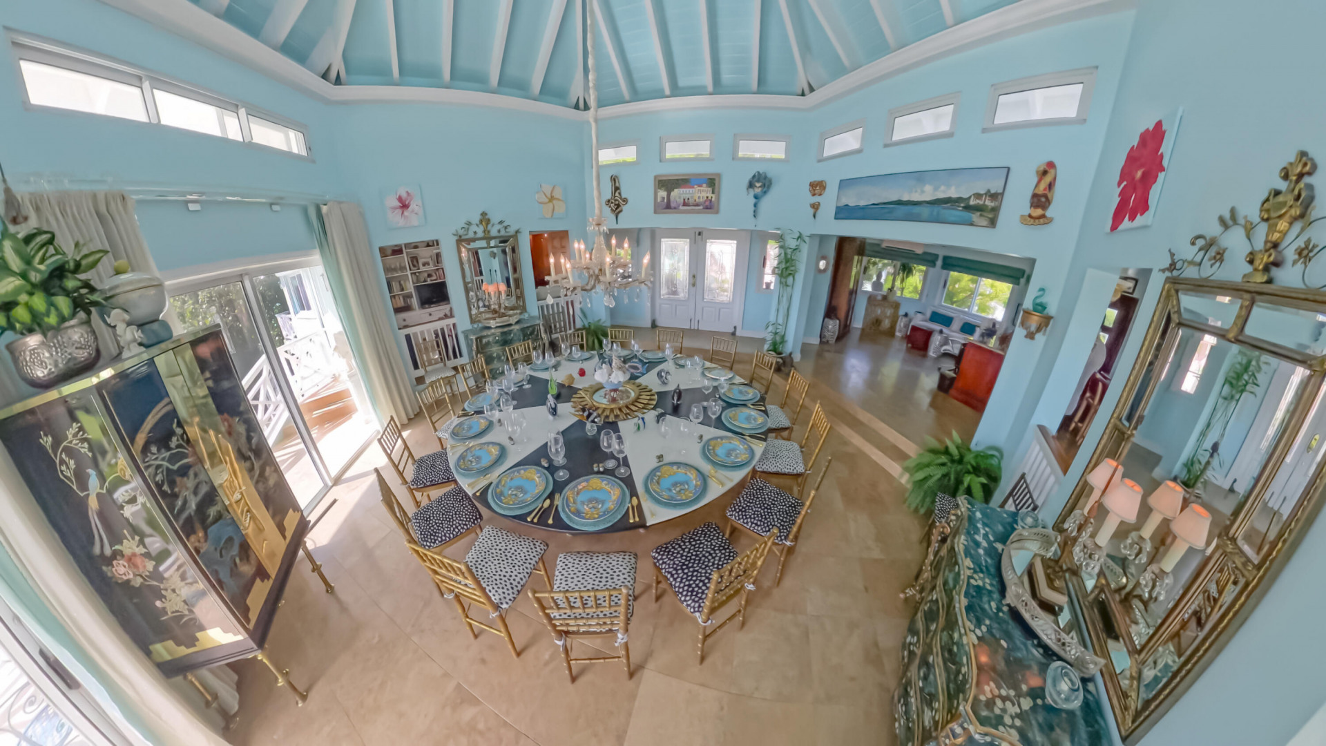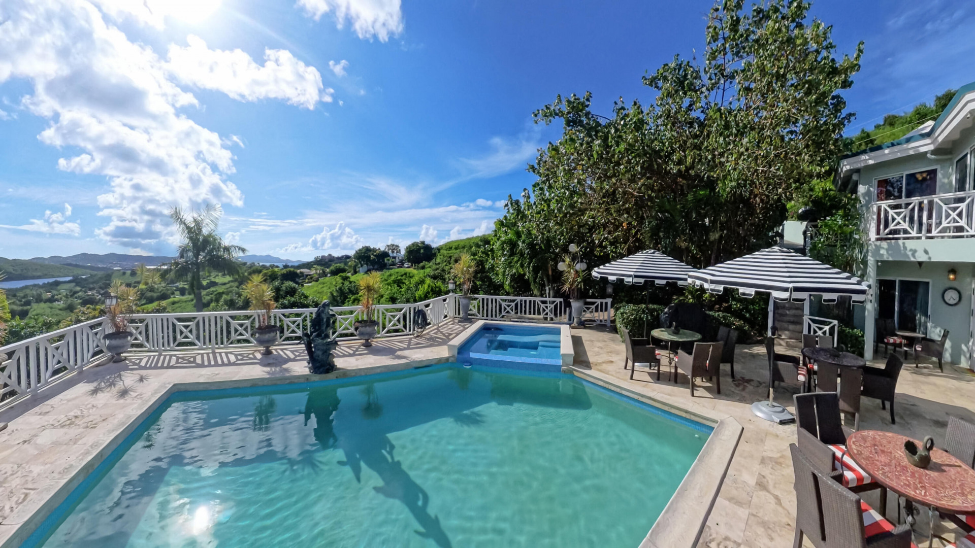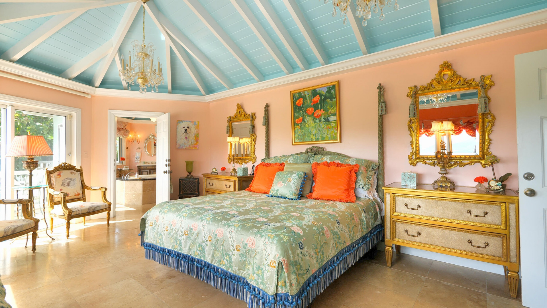 Discover Papaya Court, an iconic St. Croix estate featured in several of Carleton Varney's design books. Varney, also known as 'Mr. Color' and longtime president of Dorothy Draper & Co., was a close friend of the seller. This exquisite home is designed for grand entertaining, featuring a luxurious Chef's kitchen and dining area upstairs, complemented by a fully equipped bar with direct access to an expansive pool deck downstairs. The private and luxurious primary suite, along with three guest suites, ensures comfort for visiting guests. Nestled in the island's premier beach community, this masterpiece offers sweeping views of The Buccaneer Golf Course, Christiansted, and the Caribbean Sea. Beaches, restaurants, and shopping are just minutes away.Papaya Court is designed for grand entertaining and refined living. As you enter through a beautiful iron gate, sourced from a prestigious auction, you are welcomed by an expansive property where every detail has been thoughtfully curated. The home's layout offers multiple living areas, perfect for hosting gatherings and functions or enjoying quiet moments in the tropical breeze. The upstairs level features an open Chef's kitchen, recently updated with top-of-the-line appliances and gleaming granite countertops. The spacious island, sleek cabinetry, and high-end finishes make this kitchen an ideal space for preparing culinary delights. Adjacent to the kitchen is a formal dining room, where you can host elegant dinners while enjoying the beautiful view of the golf course and the lights of Christiansted at night. The downstairs area is equally impressive, with a fully equipped bar and lounge that opens directly onto the expansive pool deck with a large and inviting pool. The pool is set up with a pool heater to make sure the temperature stays comfortable even when the tradewinds cool it down in the winter months. Whether you're hosting large gatherings or intimate parties, this outdoor space offers the perfect venue, with ample room for sunbathing, dining, or relaxing by the pool. The poolside guest suite provides visitors with their own private living room and kitchen, allowing for extended stays in comfort and privacy.