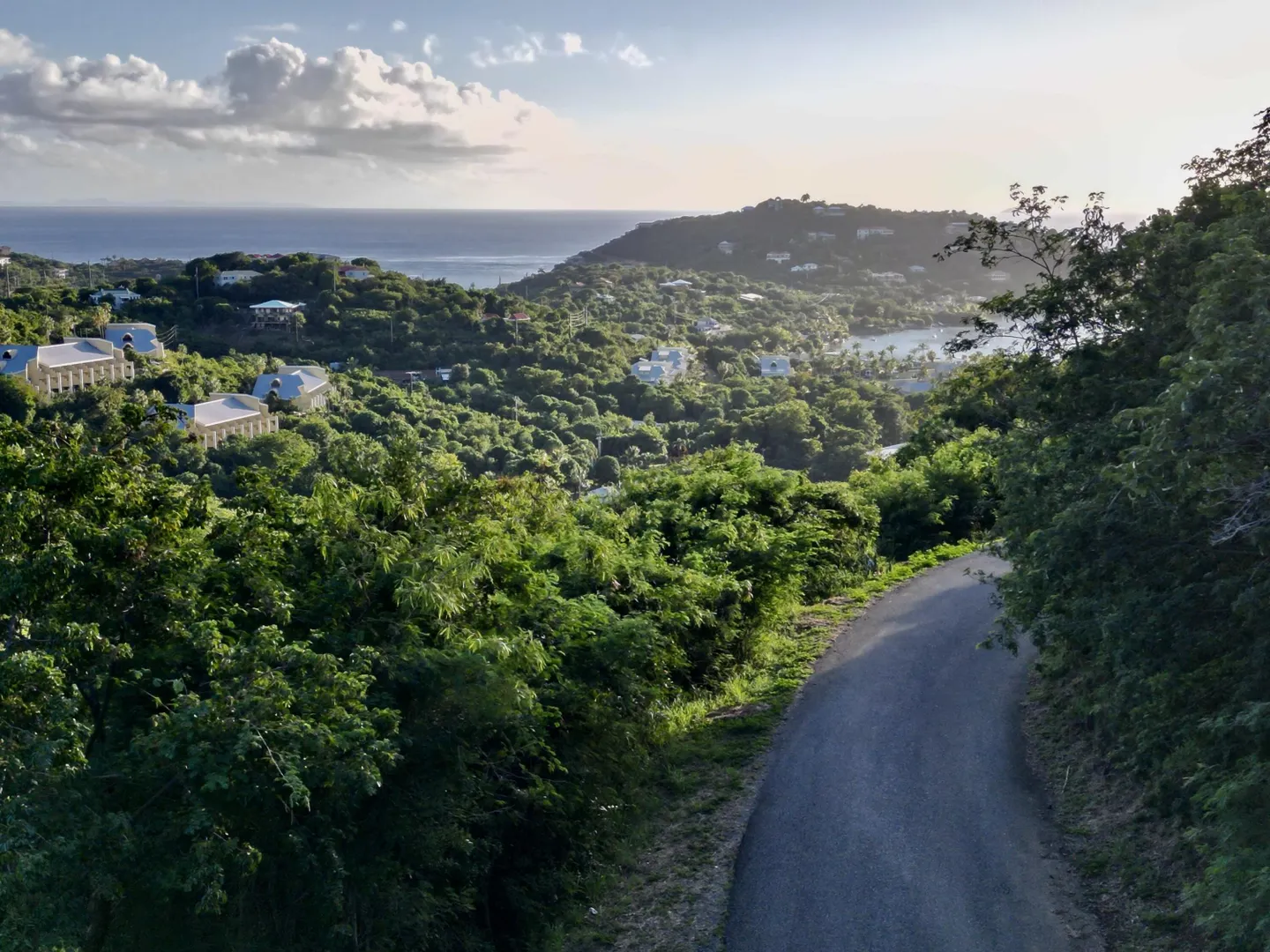 Downhill build with gentle breezes, lush vegetation & privacy. Paved access with utilities nearby. Views of South Shore & beyond to St. Croix. Adjacent parcel also listed for sale. Buy both for a 1/2 acre!