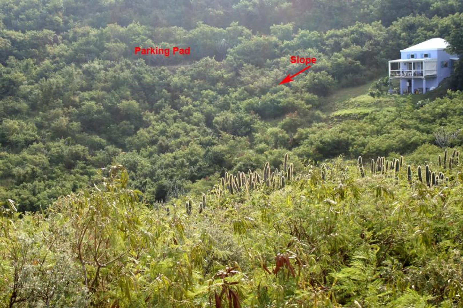The view from this lot is just incredible! You are nearly directly across from Buck Island, and just to the left, looking west, you can see the twinkling lights of Christiansted at night. Nicely situated to get the breezes from the east, too. Pad cut in and nice gentle slope. It would be a very private place, too, with the topography the way it is.