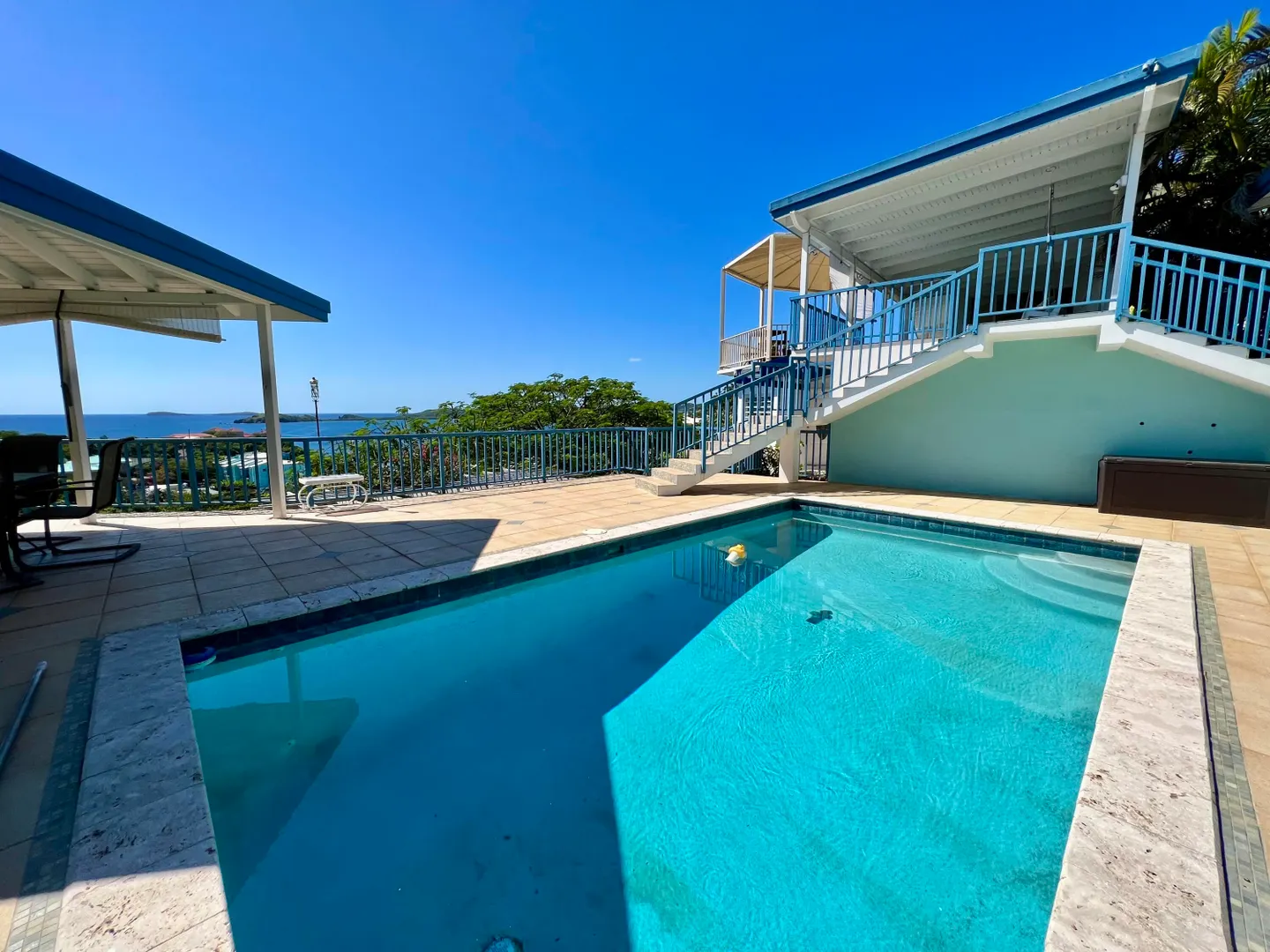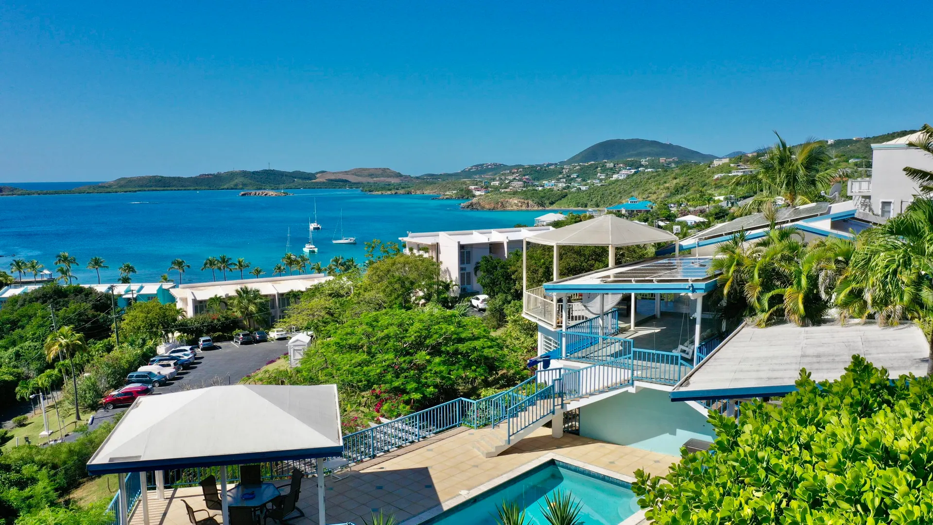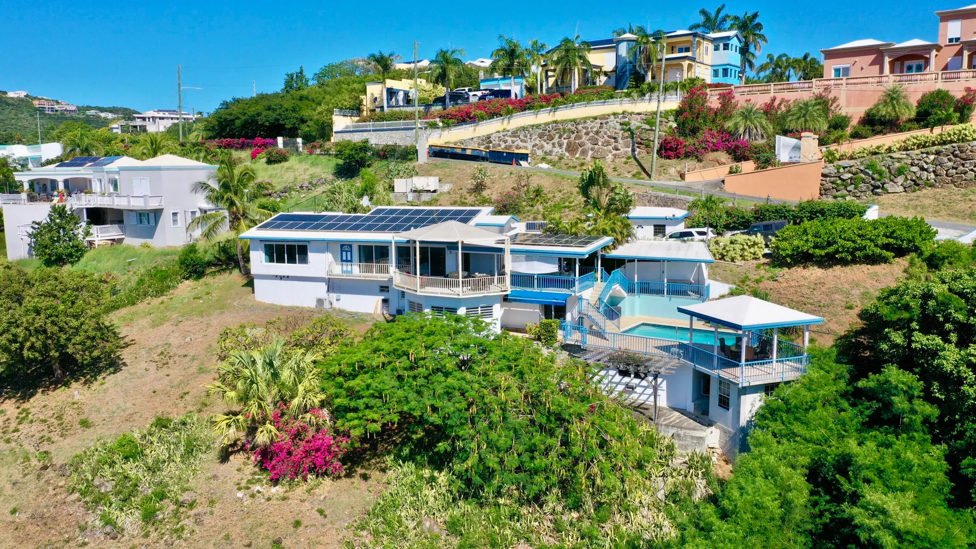 Enjoy the amazing ocean and sunset views from this 6 Bedroom, 5 Bath property located on Witty Way above Secret Harbor in the East End. The property consists of a 3 Bedroom/2 Bath main home, a spacious 2 Bedroom/2 Bath apartment & an extra separated Bedroom/Studio for visiting guests. Spend quality time on your large patio and swimming pool or walk to Secret Harbor beach. Great for personal use or investment property. Solar panels and net metering!