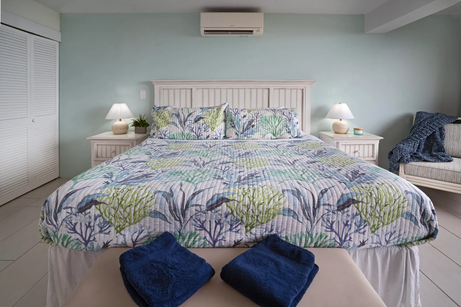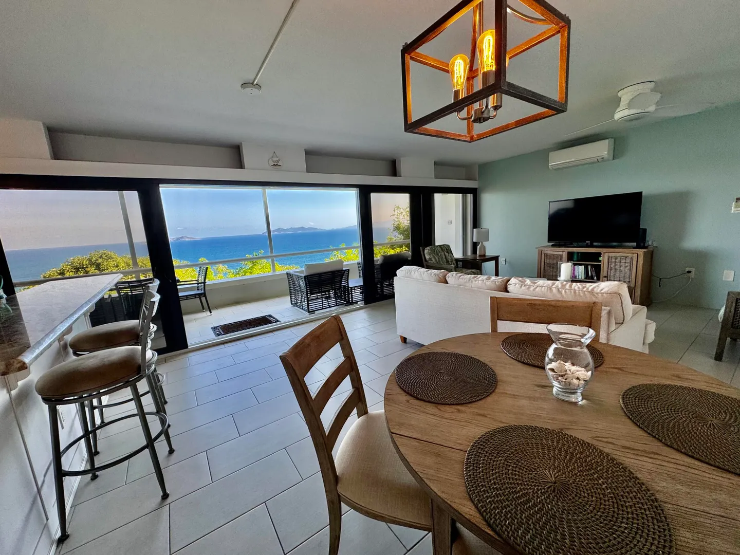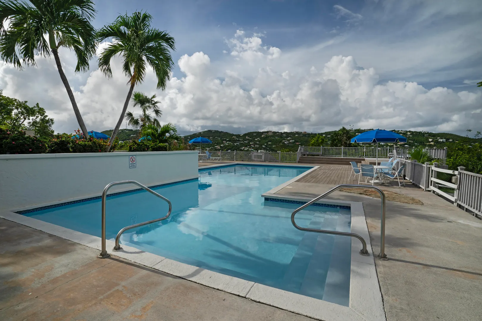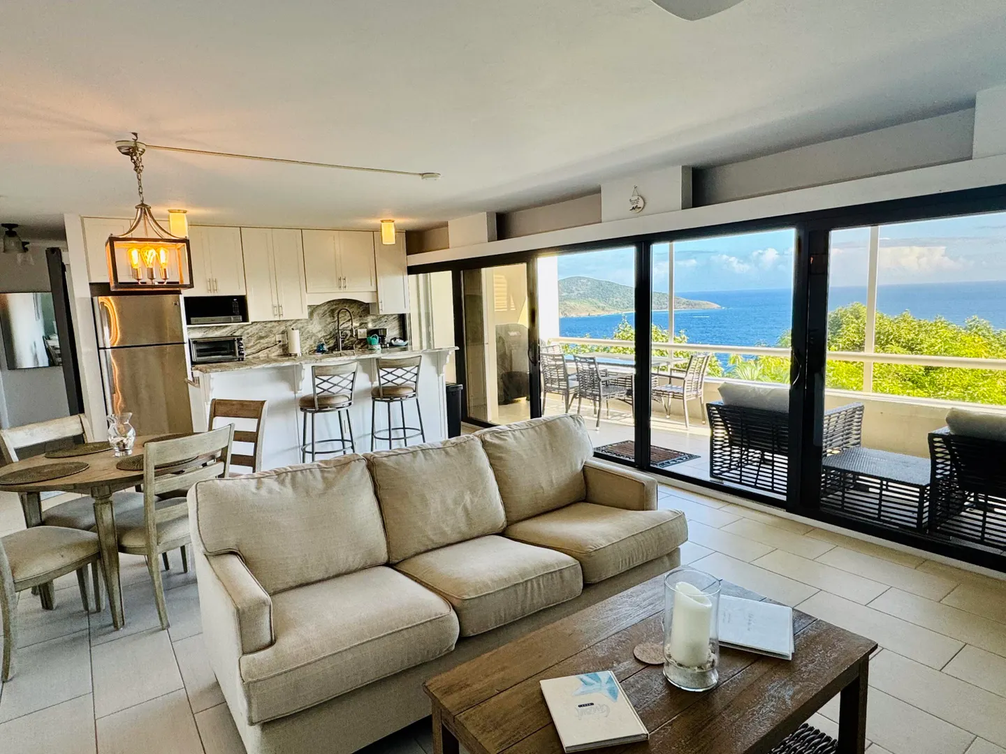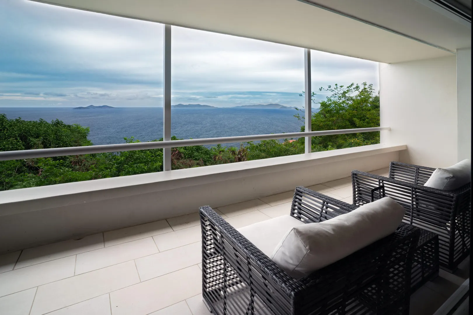 This one bedroom, dreamy island retreat is a must see. Remodeled in 2018, this condo is decorated in the colors of the sea, sky and sand with a decidedly coastal aesthetic. But its key feature is a captivating view like few others. On an island known for spectacular views this condo offers an unobstructed and much sought after down island view including all of the islands and cays dotting the ocean between St Thomas and the BVI to the north. The condo floor plan is incredibly livable, offering a private and spacious outdoor living area of just under 300 sq ft of deck, perfect for lounging and dining and generous closet space for extended stays or as a residence. With its end of street location, there is convenient parking at the top of the stairs. The community is gated and justa short 5 minute drive to the incomparable Magens Bay and a 15 minute drive to Charlotte Amalie.
