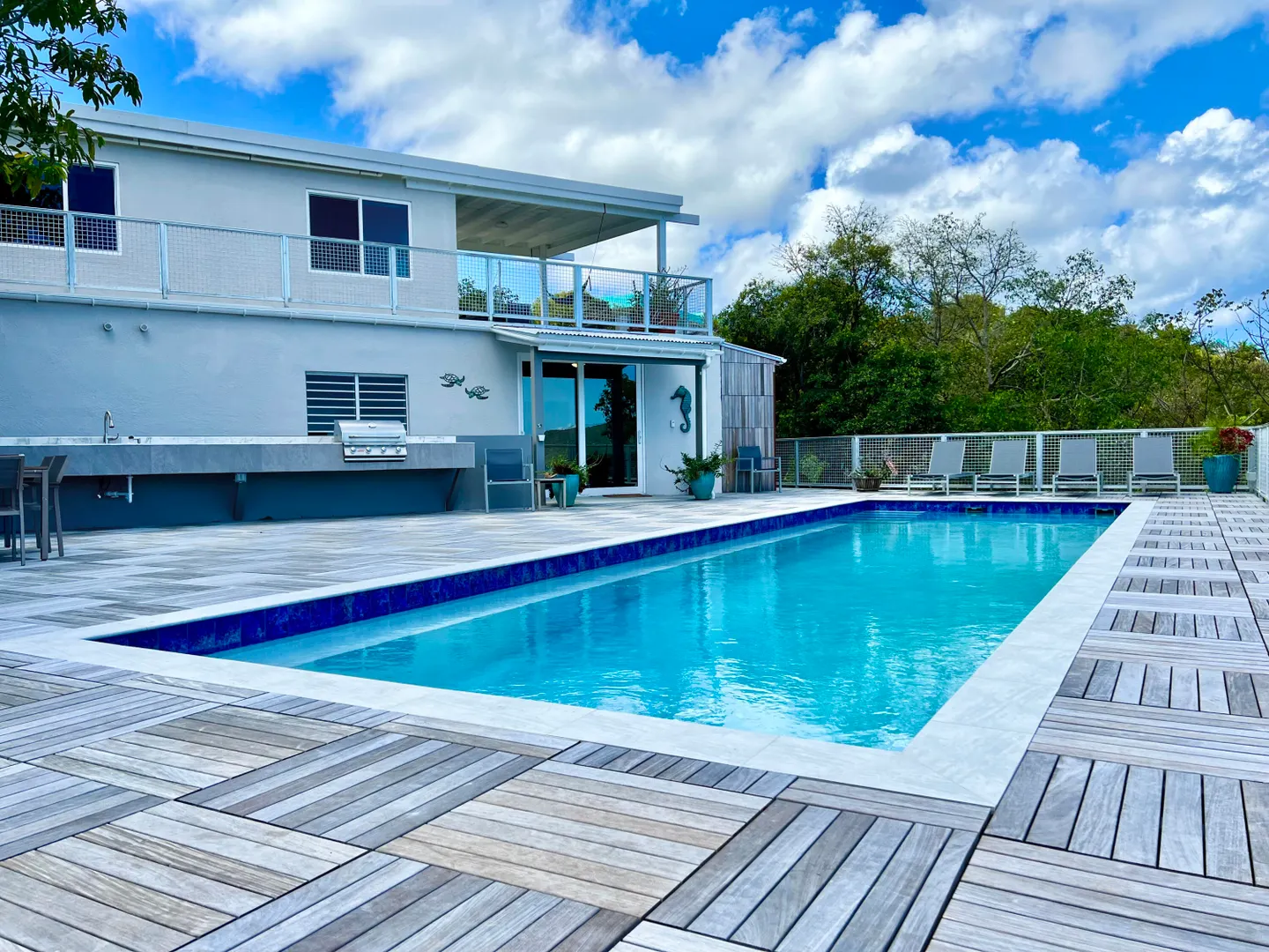 This newly remodeled, solid concrete, gated, two-family home features a 40x12 ft pool and huge entertainment patio, plenty of parking, and is 5 minutes from Magens Bay. Enjoy great rental income on the 1/1 apartment, either yearly - or AirBnB the apartment. You could also AirBnB the upstairs 3/2 main house. Sophisticated finishes and the terrific outdoor entertainment venue make this a wonderful family home or investment possibility for short term rentals. All upstairs windows and sliders are PGT windguard; Lower windows are Airmaster security. Roof completely replaced post Irma with tongue & groove board & metal. Utility connections are underground, auto generator, AC. Cistern cleaned and recoated in 2021.