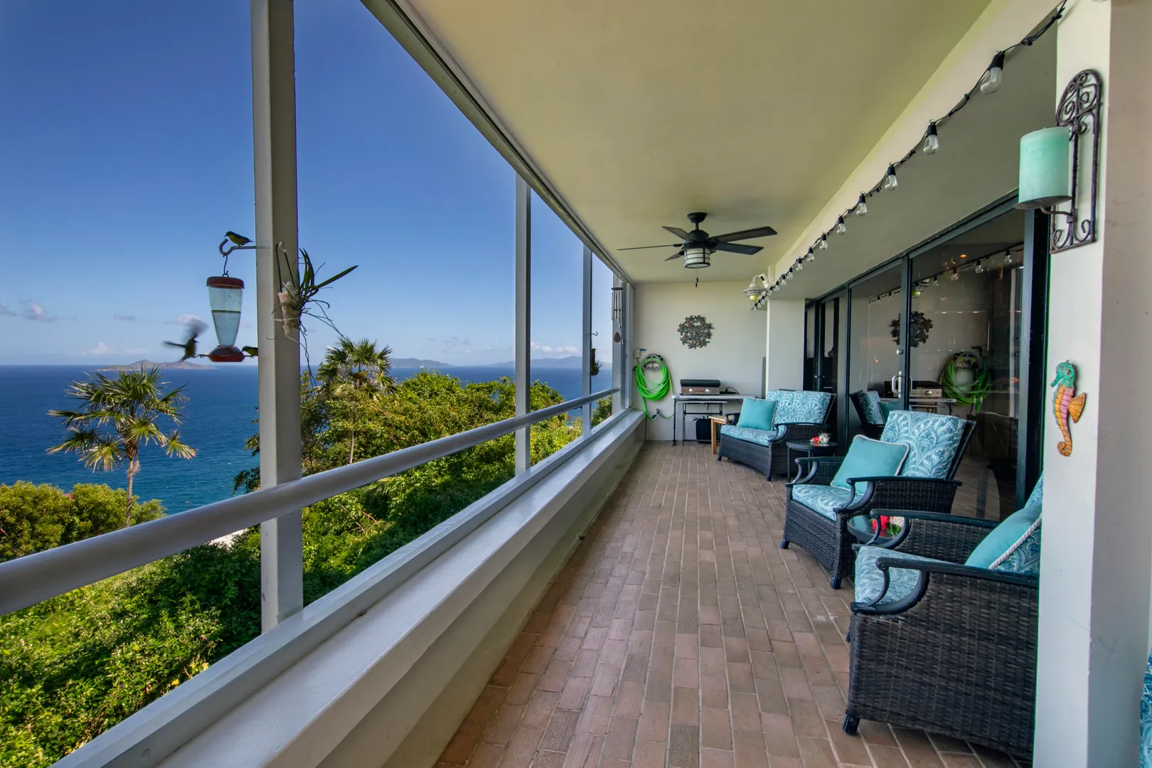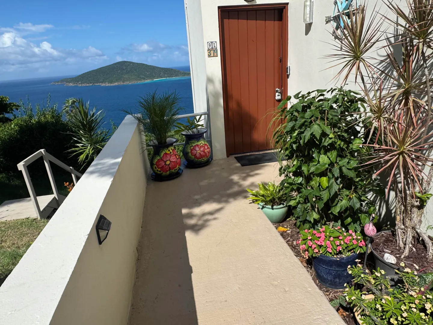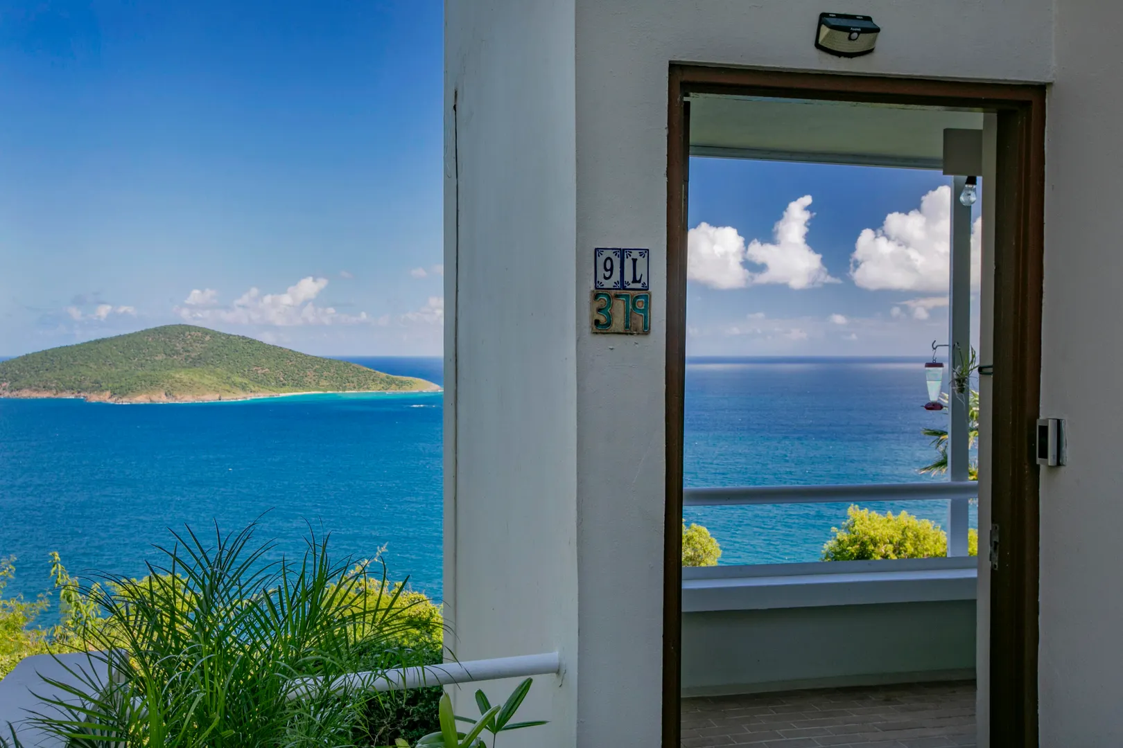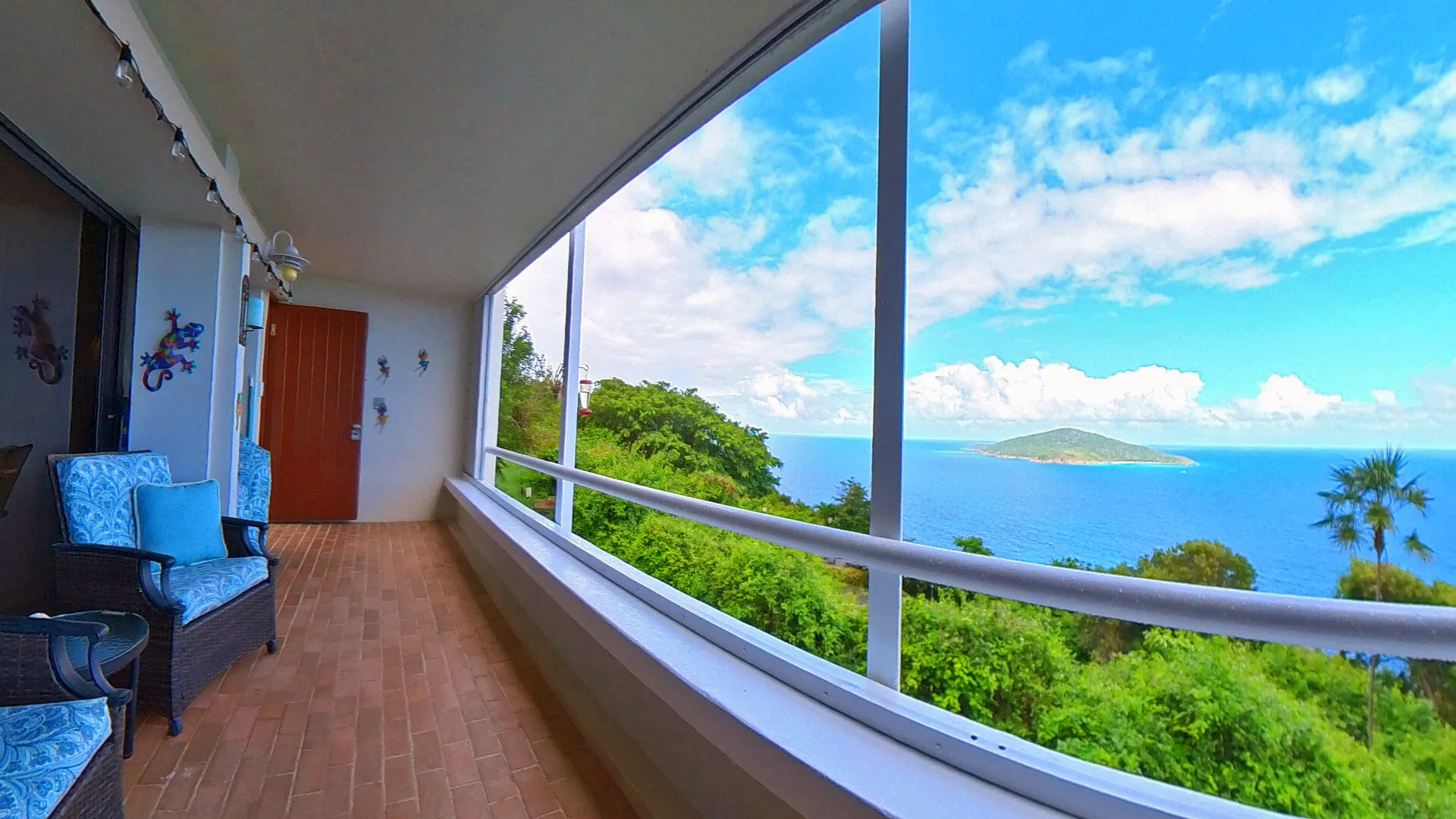 Villa Collina, is a 1 bedroom, 1.5 bath condo offering panoramic and unobstructed views from Hans Lollick to the BVI framed by beautiful, tropical vegetation. Located in the gated Mahogany Run Community, the condo features a 32' covered balcony, your outdoor living/dining 'room' and finely crafted custom mahogany cabinetry throughout. The expanded master bedroom has two built in desks and the spa-like bath has a double sink vanity and contemporary walk-in shower with a beautiful ocean vista. A rare half bath makes this the only one bedroom of its kind in the complex. Upgrades include a new, shared 30KW diesel generator, storm shutters, and Starlink mount. Private and exceptionally well maintained, Villa Collina is island living at its best