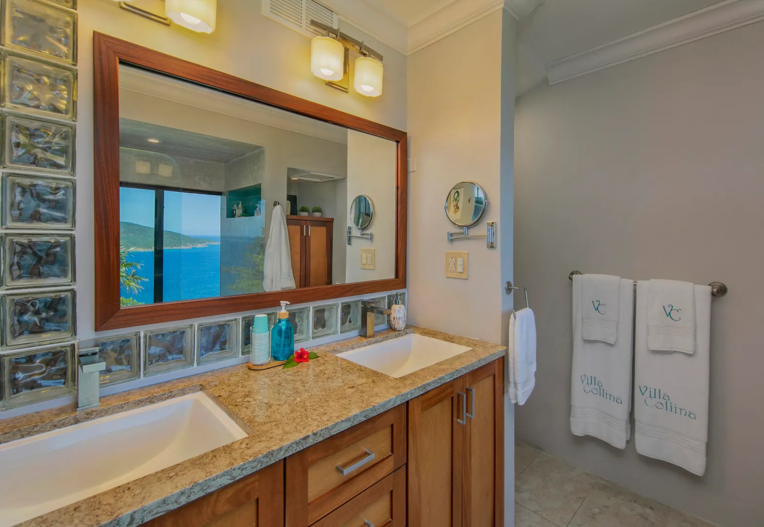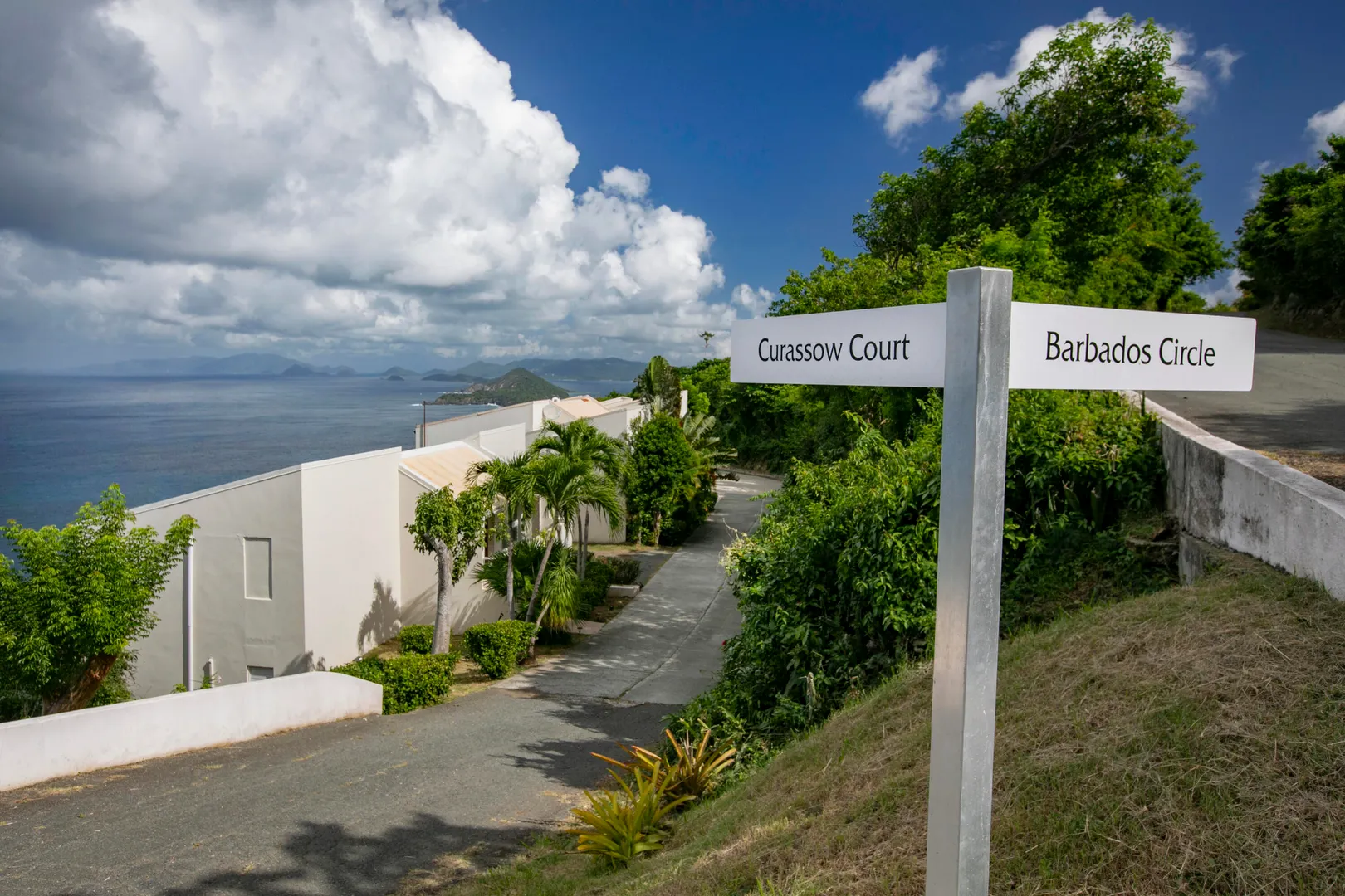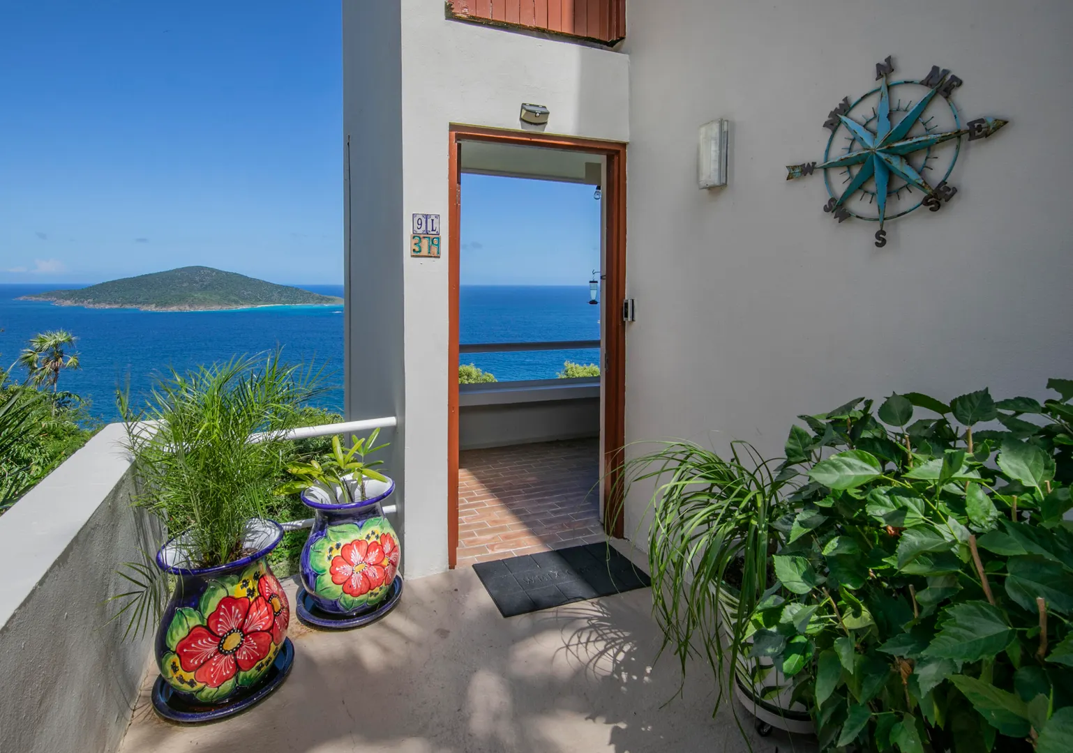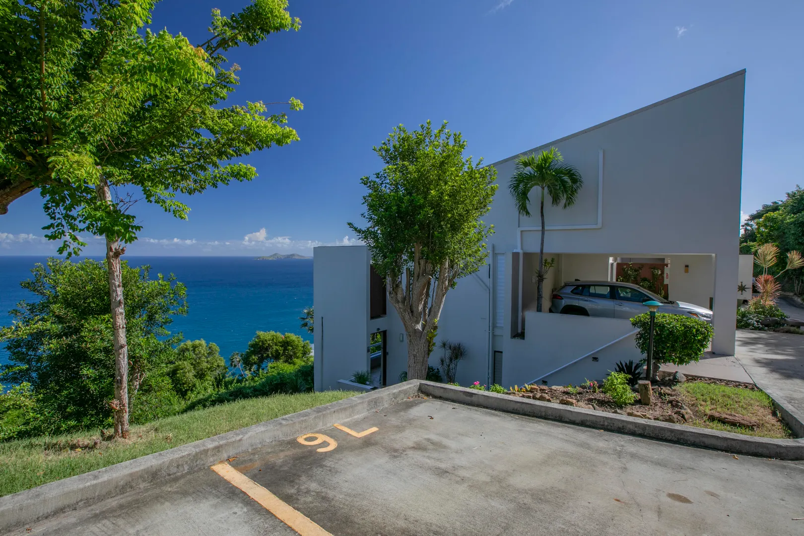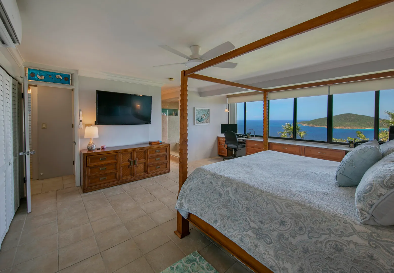 Villa Collina, is a 1 bedroom, 1.5 bath condo offering panoramic and unobstructed views from Hans Lollick to the BVI framed by beautiful, tropical vegetation. Located in the gated Mahogany Run Community, the condo features a 32' covered balcony, your outdoor living/dining 'room' and finely crafted custom mahogany cabinetry throughout. The expanded master bedroom has two built in desks and the spa-like bath has a double sink vanity and contemporary walk-in shower with a beautiful ocean vista. A rare half bath makes this the only one bedroom of its kind in the complex. Upgrades include a new, shared 30KW diesel generator, storm shutters, and Starlink mount. Private and exceptionally well maintained, Villa Collina is island living at its best