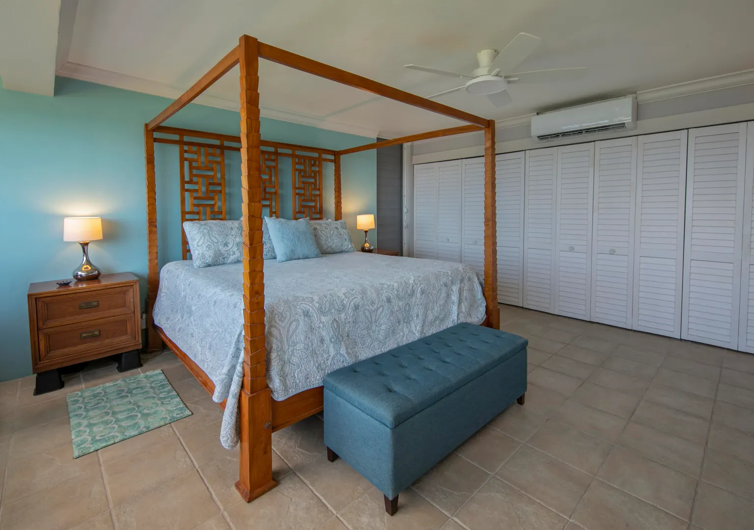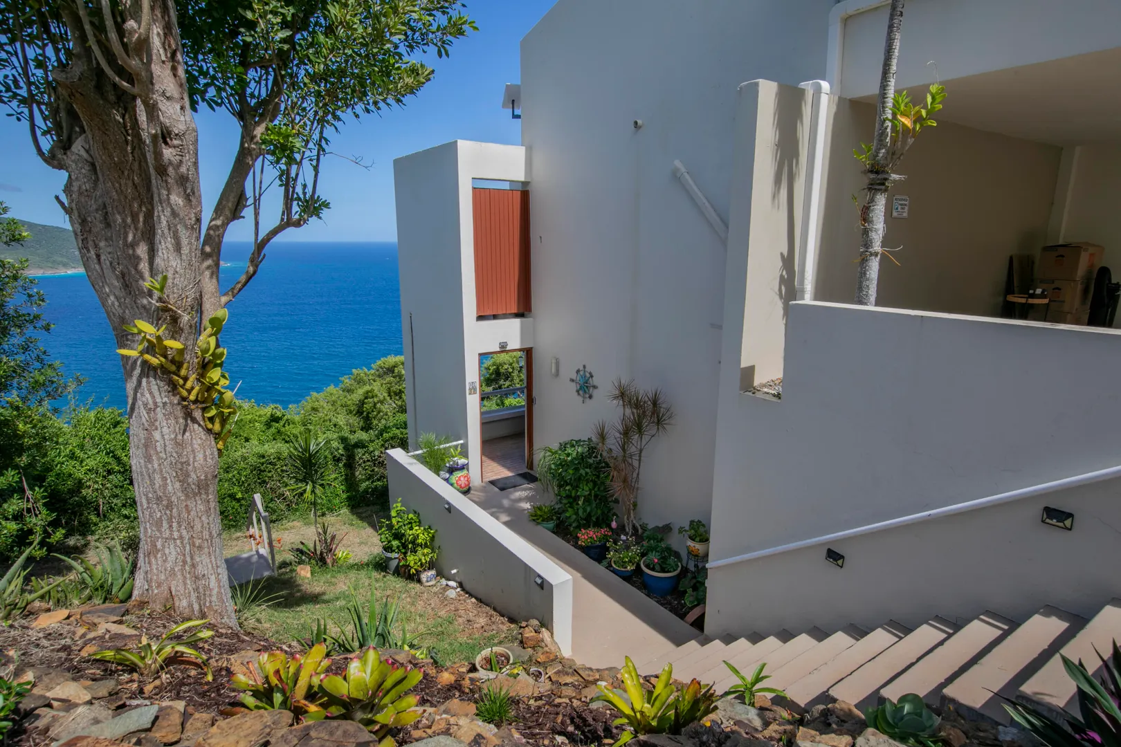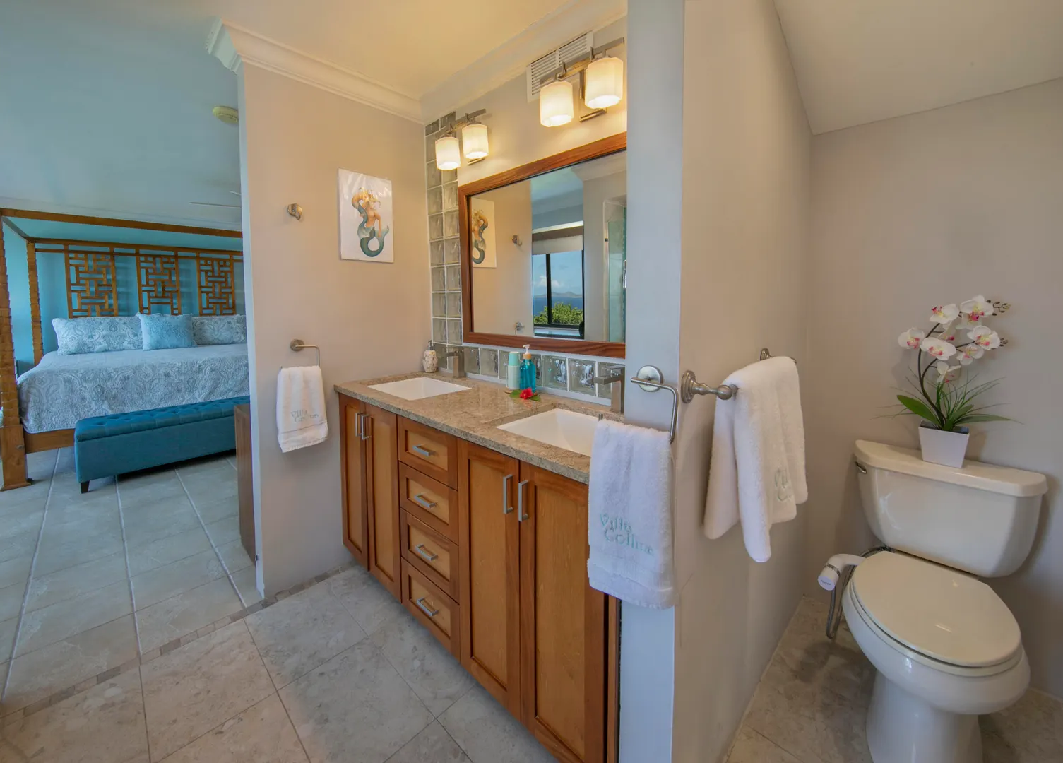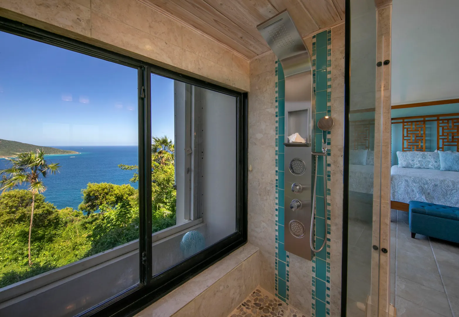 Villa Collina, is a 1 bedroom, 1.5 bath condo offering panoramic and unobstructed views from Hans Lollick to the BVI framed by beautiful, tropical vegetation. Located in the gated Mahogany Run Community, the condo features a 32' covered balcony, your outdoor living/dining 'room' and finely crafted custom mahogany cabinetry throughout. The expanded master bedroom has two built in desks and the spa-like bath has a double sink vanity and contemporary walk-in shower with a beautiful ocean vista. A rare half bath makes this the only one bedroom of its kind in the complex. Upgrades include a new, shared 30KW diesel generator, storm shutters, and Starlink mount. Private and exceptionally well maintained, Villa Collina is island living at its best