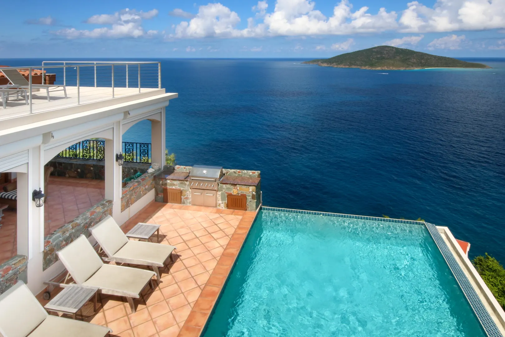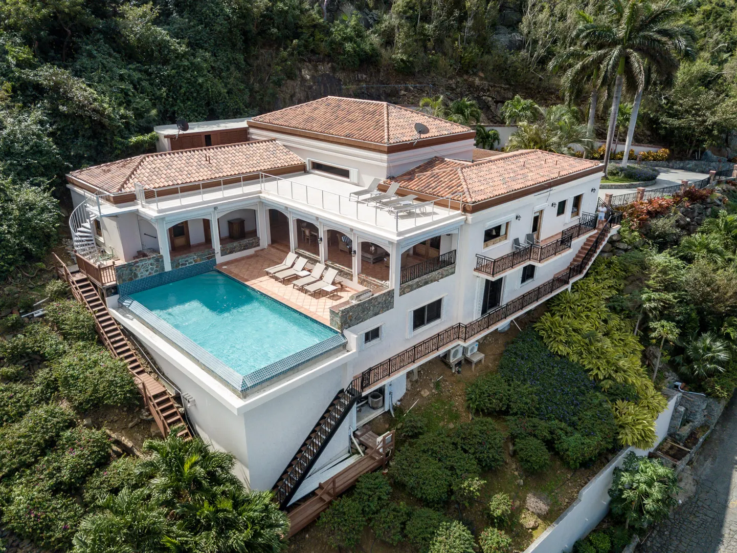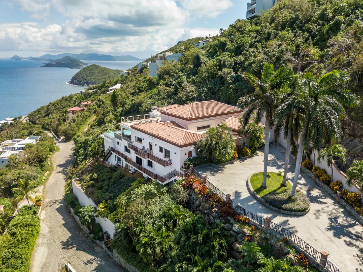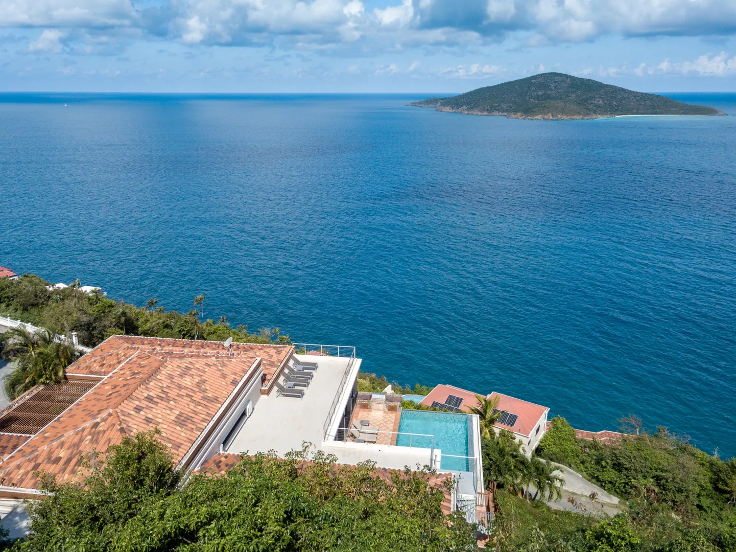Sitting high on what feels like a headland, the ethereal views from STARDUST ring true to its name. Miles of islands and sky seem an arm's length away from the infinity pool edge. Inside, the expansiveness continues with an open floor plan beneath tall, wood-lined ceilings. Built for strength as well as sophistication, you enter this 4/6 poured concrete home through a garden of tropical foliage, sculpture and trickling water. The dining room is designed with a wine ''cellar'' for formal evenings. For luxury, his & her's Master bathrooms and closets. There are two more en-suite bedrooms in the main home, and below, with its own private entrance, is a stunning, modern 1/1 apartment. Stardust is an ideal and spacious family home - but with versatility and a villa rental history to prove it.Buyer to verify square footage.