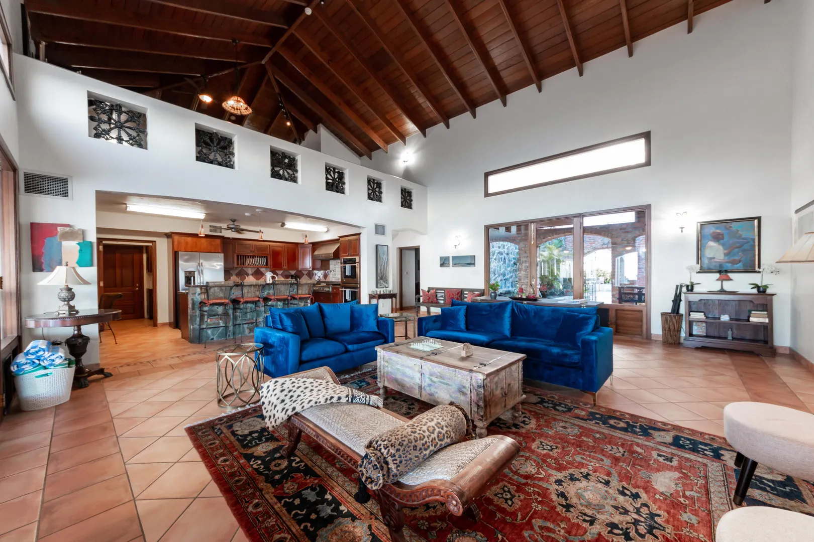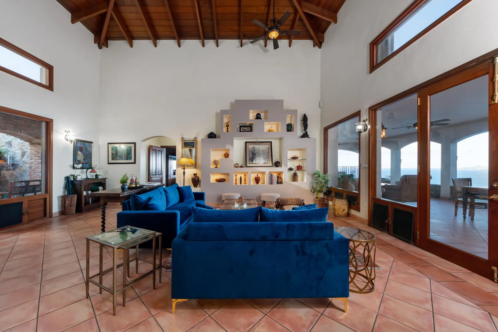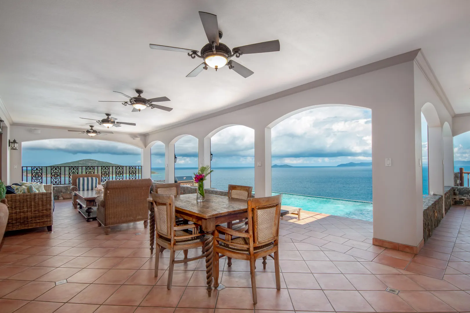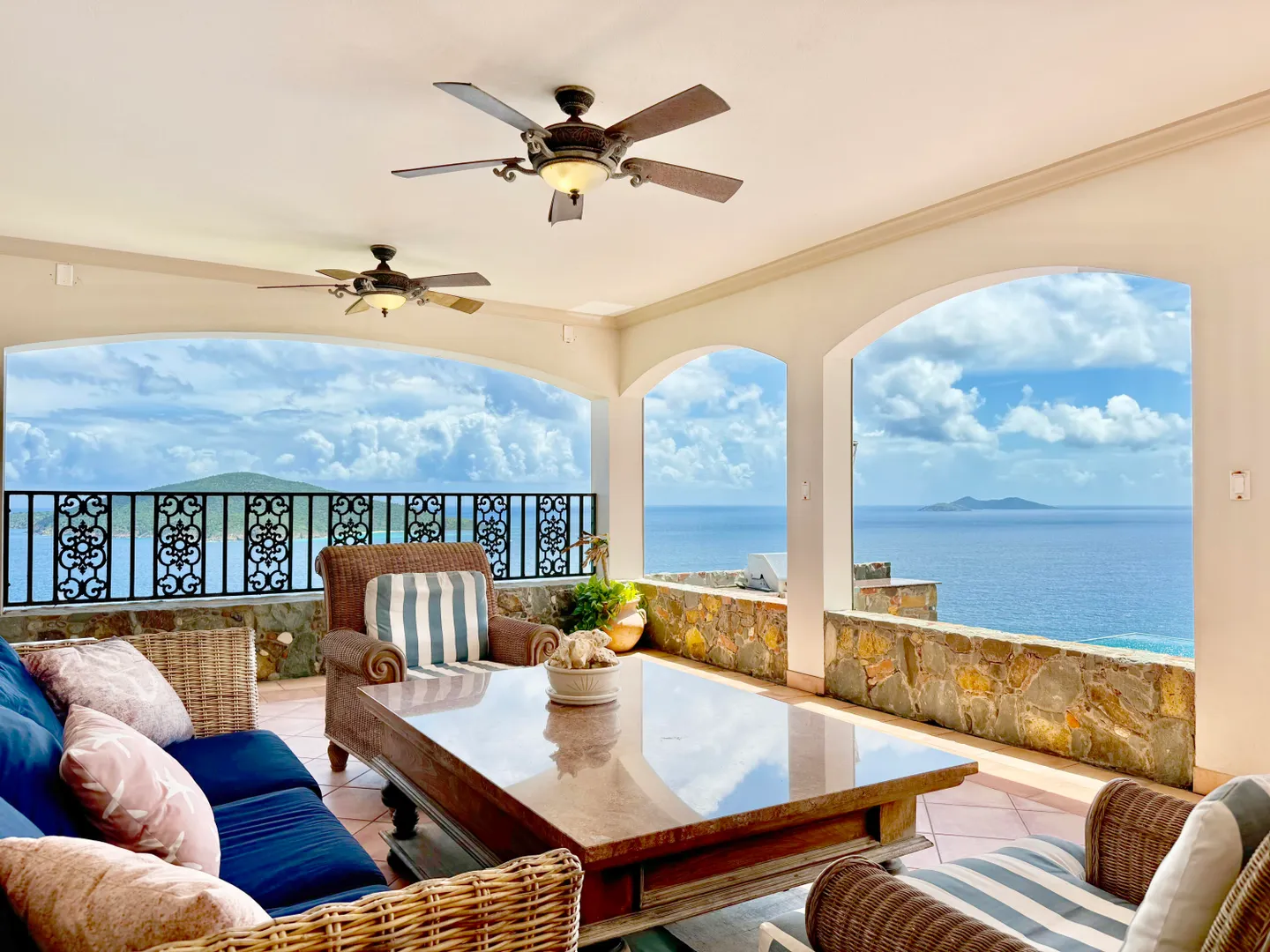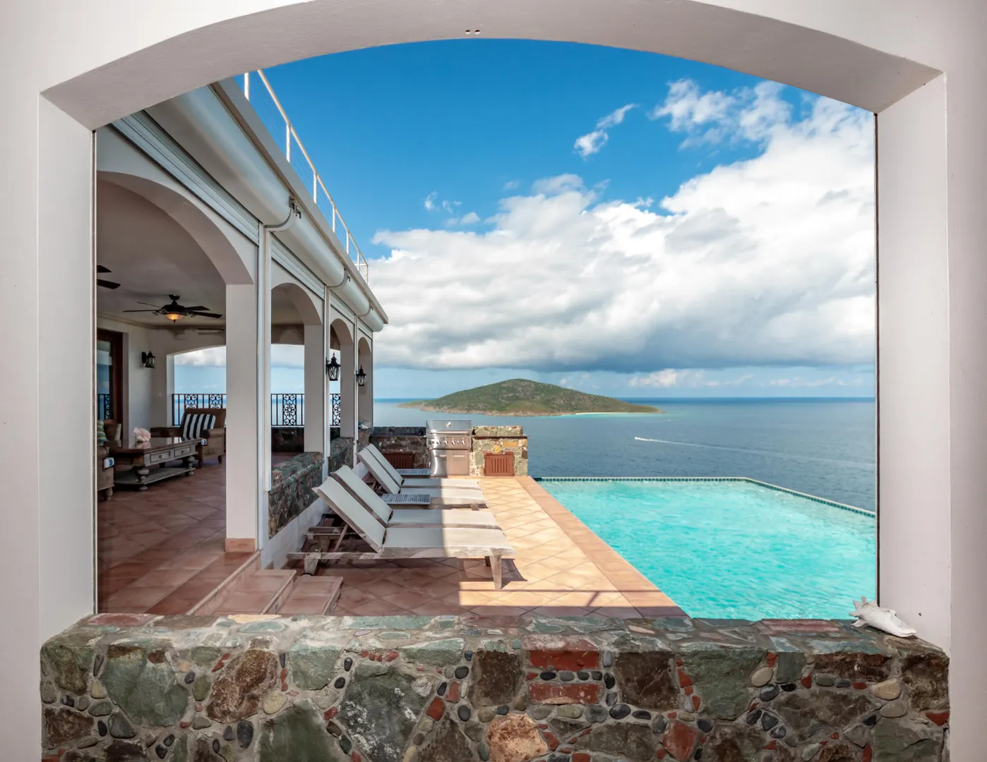 Sitting high on what feels like a headland, the ethereal views from STARDUST ring true to its name. Miles of islands and sky seem an arm's length away from the infinity pool edge. Inside, the expansiveness continues with an open floor plan beneath tall, wood-lined ceilings. Built for strength as well as sophistication, you enter this 4/6 poured concrete home through a garden of tropical foliage, sculpture and trickling water. The dining room is designed with a wine ''cellar'' for formal evenings. For luxury, his & her's Master bathrooms and closets. There are two more en-suite bedrooms in the main home, and below, with its own private entrance, is a stunning, modern 1/1 apartment. Stardust is an ideal and spacious family home - but with versatility and a villa rental history to prove it.Buyer to verify square footage.