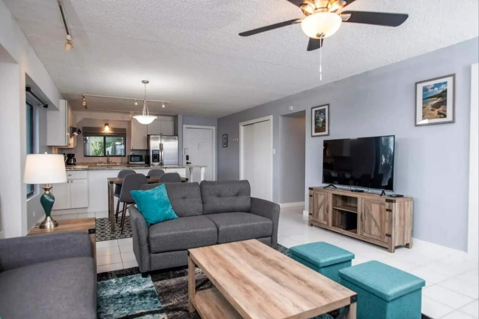 Renovated like new as of December 2021:- Completely new electrical panel with built in surge protector- Stove and microwave- Dishwasher- On-demand water heater for kitchen sink & dishwasher- Side-by-side refrigerator- Main water heater- Washing machine- Dryer- Light fixtures and fan in dining nook and living room.- Fans in bedrooms with remotes- New screens on all windows & sliding door- Paint throughout condo unitCompletely furnished with all new furniture which will remain on property:- Master bedroom: king size bed, dresser, nightstands with lamps- Second bedroom: king size bed, dresser, nightstand with lamp, and a trundle day bed with two twin mattresses- Dining table for four, expandable to six.