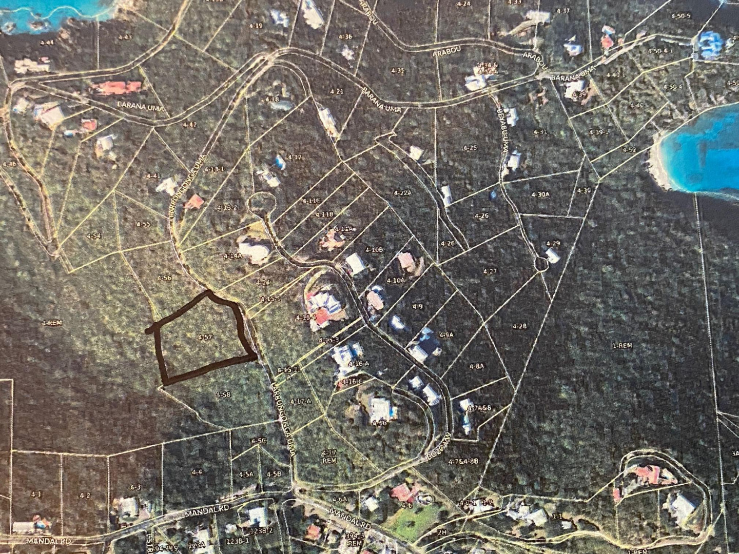 Paved Road frontage with sweeping views of Tutu Bay, Mandahl and Atlantic. Very good central location. Bound posts have been set.