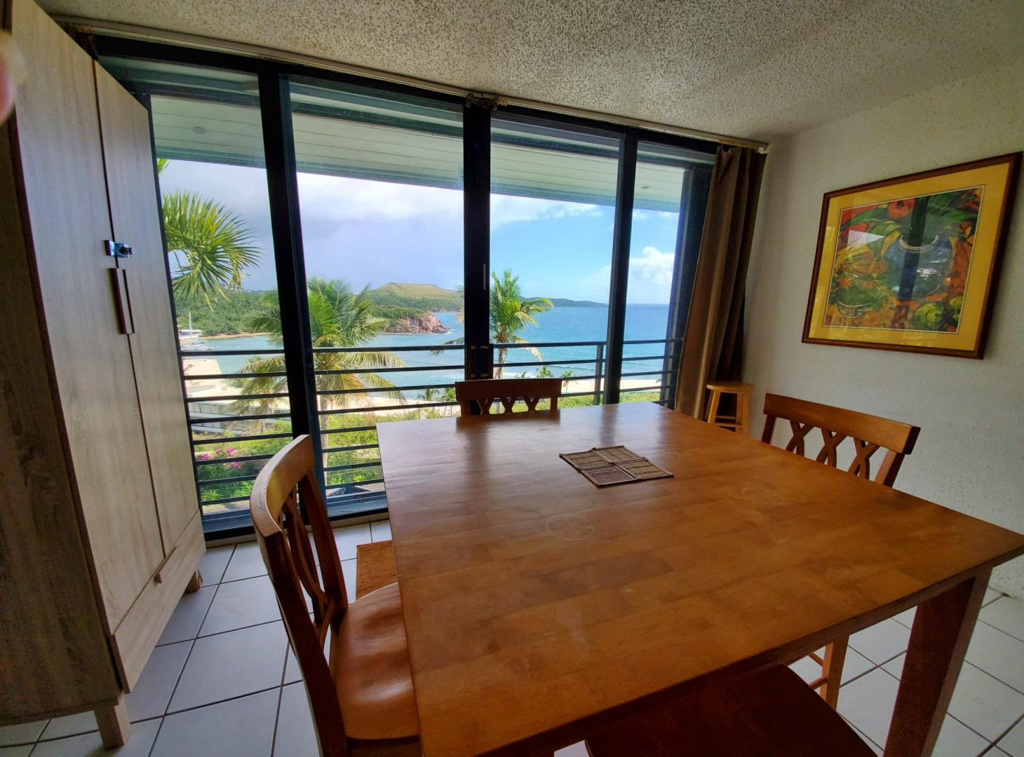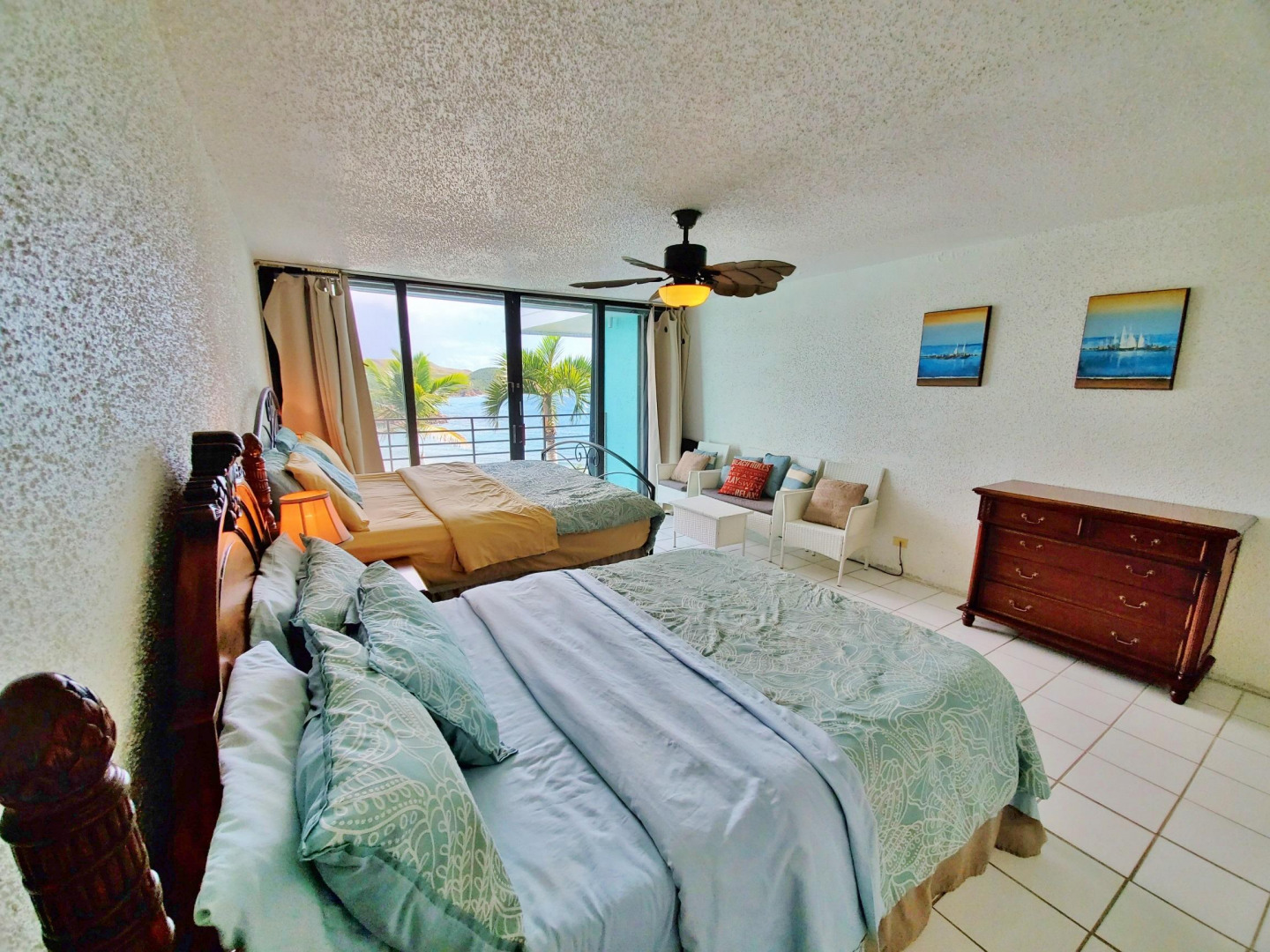 Top floor Walk in level with views of Bolongo Bay facing east. Lovely condo with access to two pools, two beaches and two restaurants in walking distance. There is a resort on the bay so plenty to do if you want to vacation there but lots of room in the over sized bedroom if you are planning to live in. Some have been made into 2 studios for rental income. Complex is soon to have a lovely community area by the pool. Gated with a generator to cover the entire complex