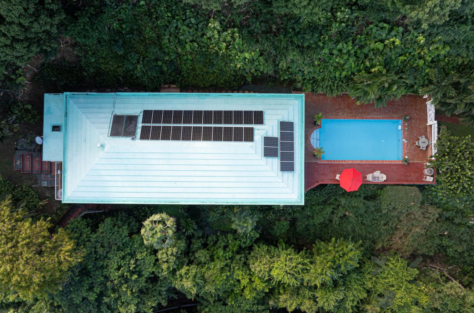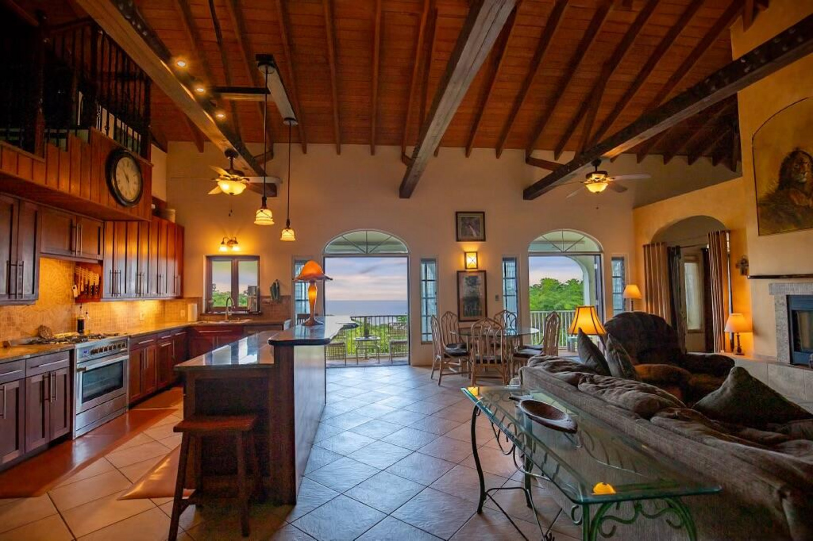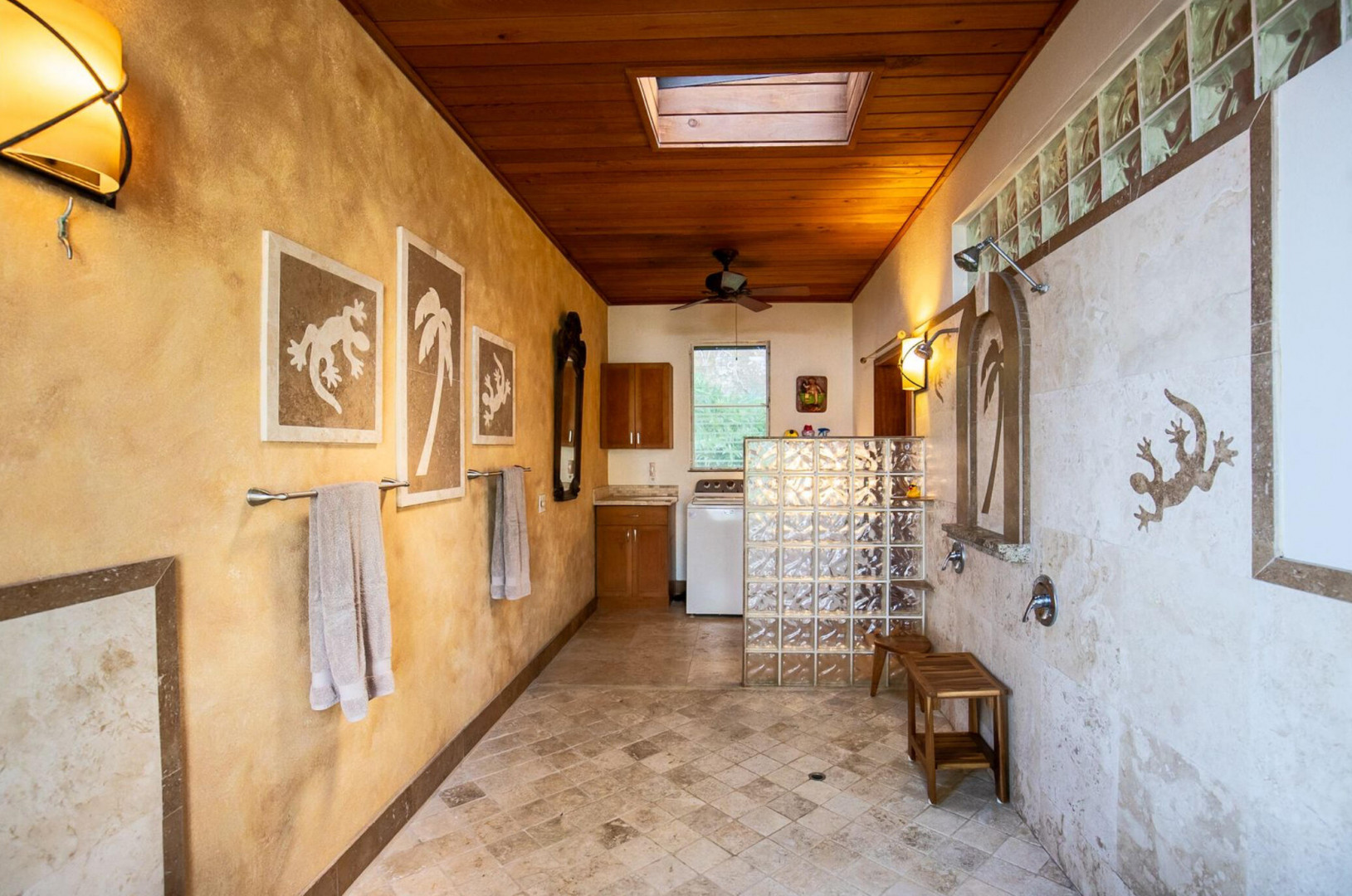 Experience island living at its finest in this poured-concrete 3-bedroom, 2-bathroom home featuring a spacious loft with striking cypress ceilings. The gourmet kitchen showcases Spanish Cedar custom cabinets by Mike Lustig, a mahogany bar, a new 36'' 5-burner gas range with convection, and a new dishwasher. Beautiful mahogany balusters add warmth and craftsmanship throughout. The main house is cooled by two large Mitsubishi split units, both under a 10-year warranty.The expansive 320 sq ft primary suite includes a walk-in closet, double vanity, double shower, skylight, custom tile work, and a luxurious 6-ft cast iron soaking tub. An outdoor shower adjacent to the main suite offers a secluded, spa-like experience.Enjoy seamless indoor-outdoor living with a wraparound deck and an observation deck overlooking the North Shore, offering panoramic views and cooling breezes. The 15x30 tiled saltwater pool features an auto chlorine generator, variable-speed pump, and a new Maytronics robot vacuum, surrounded by a stained concrete deck and an outdoor bar with sink and mini fridge, creating a private resort atmosphere.