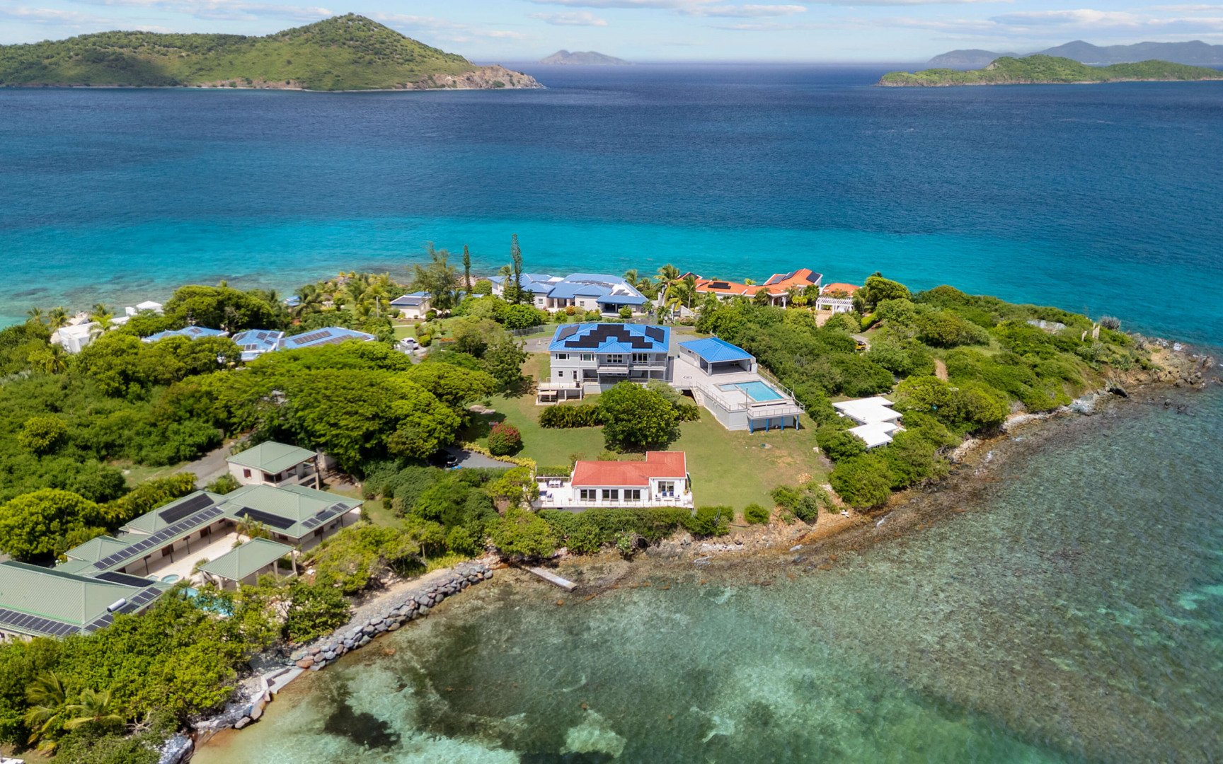 Welcome to Sunswept Cove, an iconic Caribbean retreat where luxury, history, and waterfront living converge. Once part of Fleetwood Mac's St. Thomas estate, this iconic three-bedroom sanctuary, known as the Fleetwood Mac Cottage, has been meticulously transformed into a sophisticated waterfront escape of timeless luxury and contemporary design.Located on a private 0.51-acre lot at prestigious Pelican Point, the property boasts 140 feet of direct water frontage with panoramic views spanning Pelican Beach, Sapphire Beach, St. John, and the surrounding Cays. Just steps from Pelican Beach and minutes to Sapphire Beach, this gated property offers seclusion while being moments from Red Hook's dining, shopping, and ferry to St. John and the BVI.the interior features floor-to-ceiling glass doors that open wide to the sea, filling the home with light and coastal breezes. Each of the three bedrooms offers a king bed, modern finishes, and access to a terrace. The primary suite includes a spa-inspired bath with dual vanities, rainfall shower, and private laundry. The sleek gourmet kitchen is fitted with top-tier appliances including induction cooktop, oven, microwave, air fryer, dishwasher, and multiple coffee systems, perfect for easy entertaining.