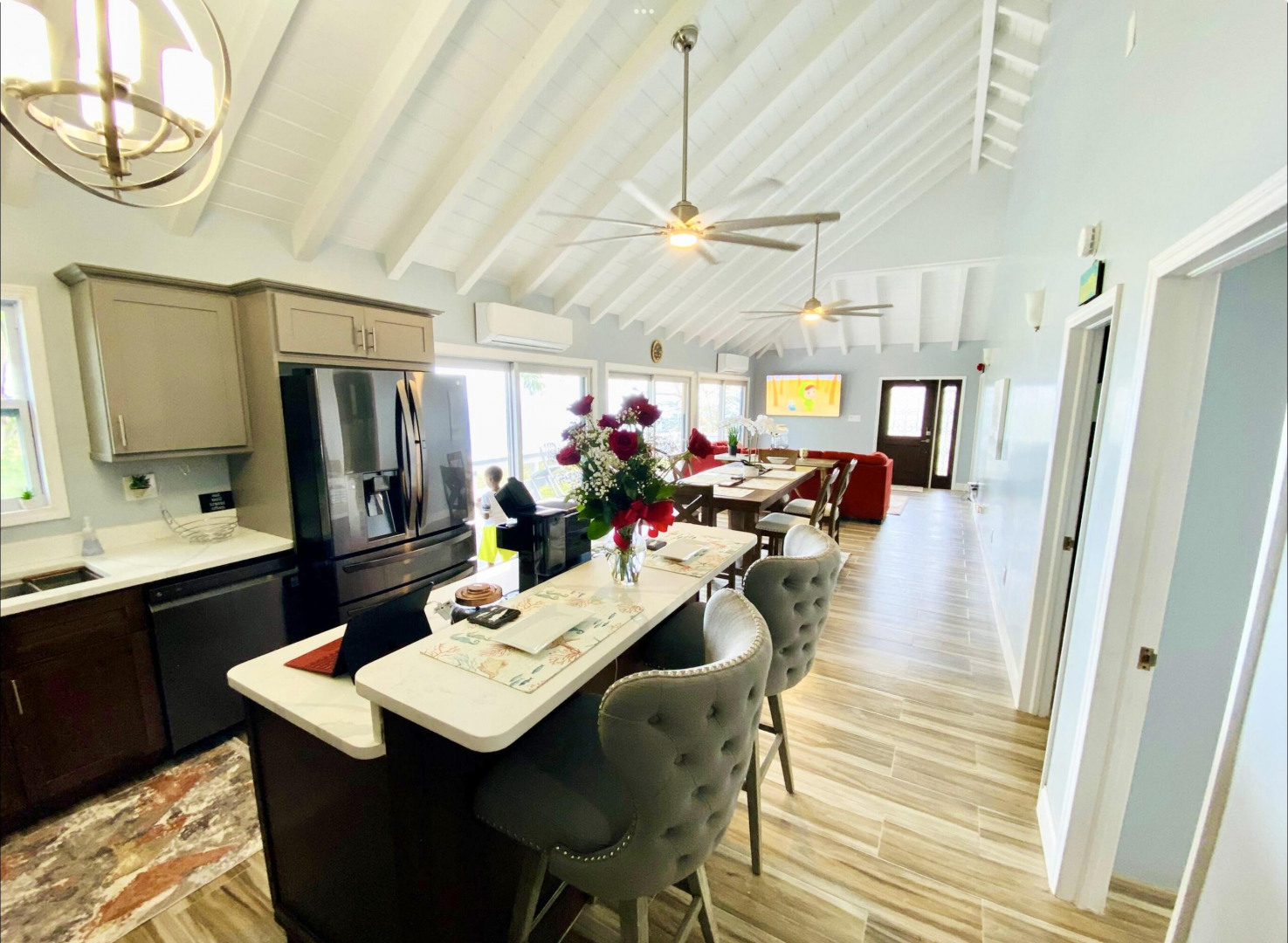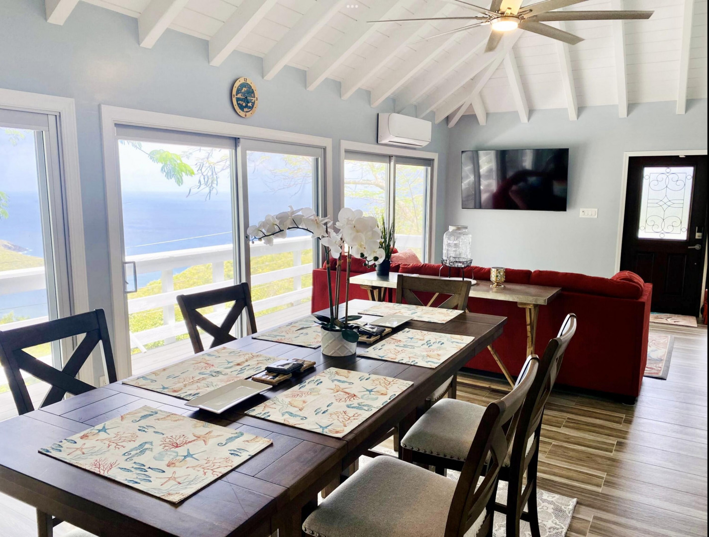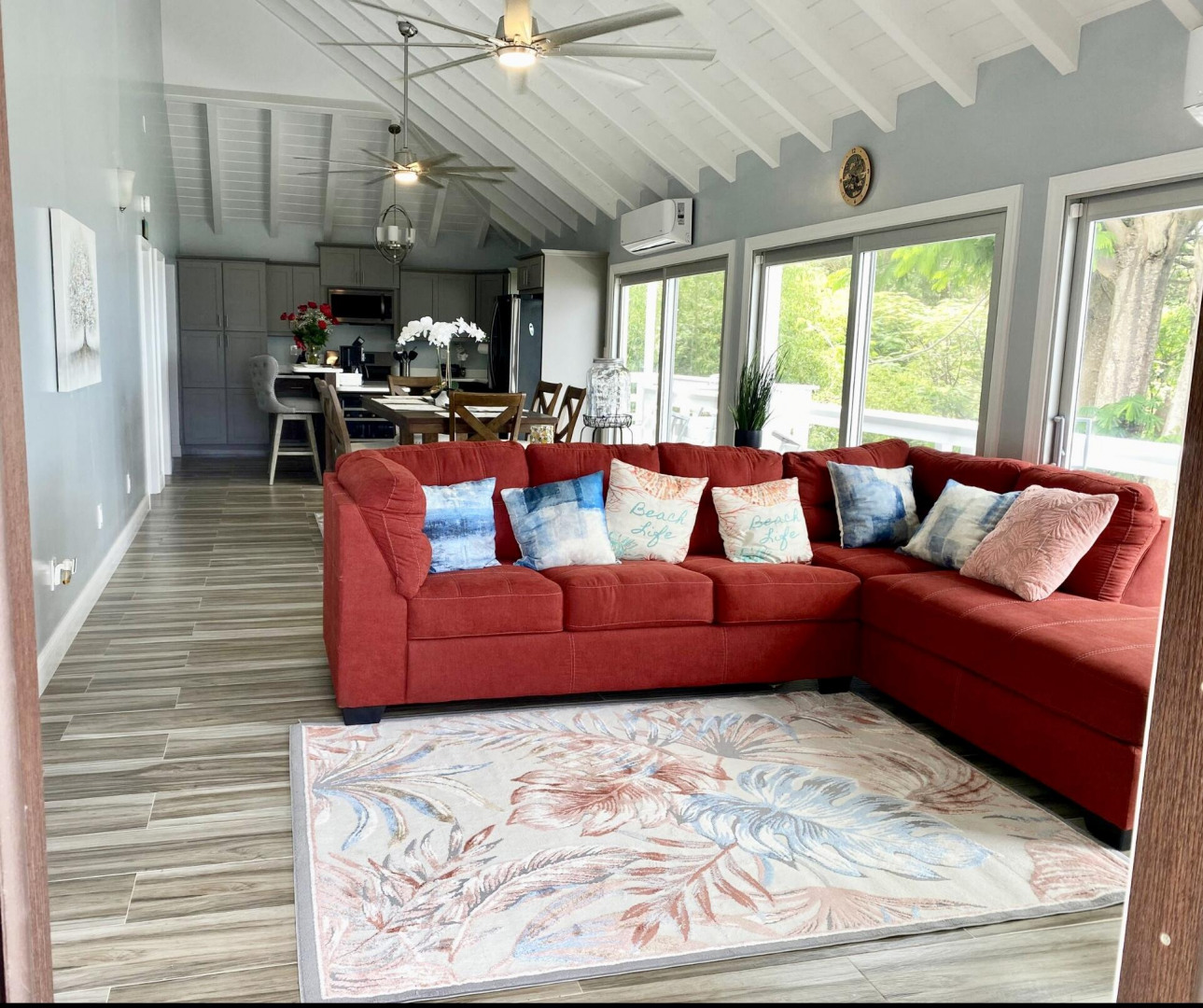 This remodeled single family residence is ready for immediate occupancy. Detailed with a spacious family room, a chef inspired kitchen, 3 generously sized bedrooms, 2 baths with walk in showers, expansive laundry room, and covered deck overlooking Preservence Bay. This warm and welcoming home sits off the ground to maximize the sweeping Caribbean Sea views. The home's entry is reached by a set of 14 steps. Equipped with solar, tenants will experience peace of mind in knowing they have less reliance on the local grid. Offered fully furnished with a monthly $400 electricity credit.
