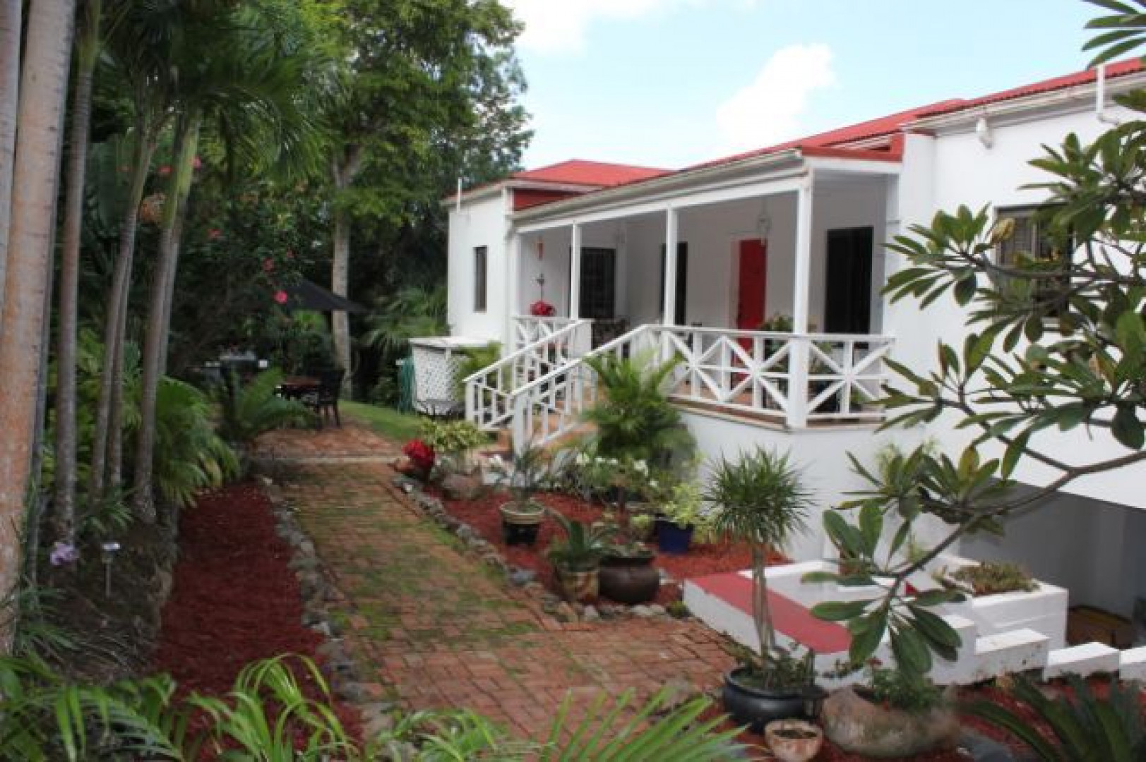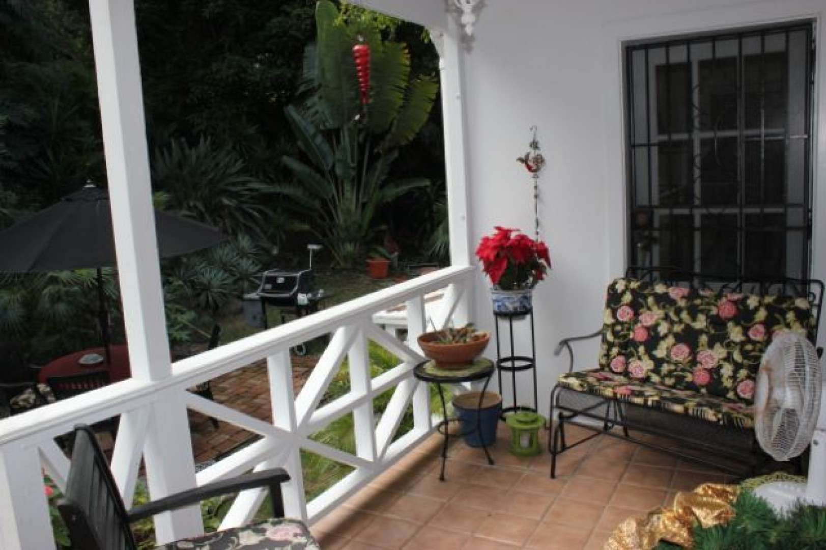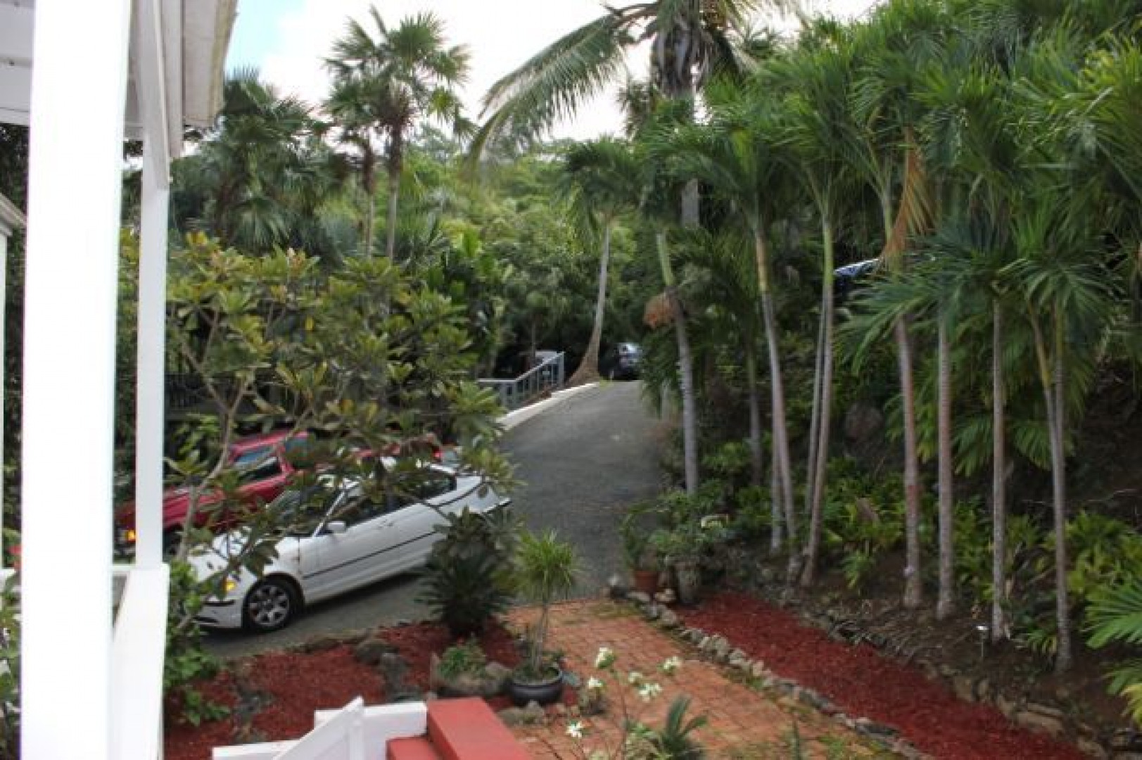 A most charming home w/ French West Indies inspired architecture, concrete, w/ 2 bedrooms, 2 baths in main home, gleaming Brazilian hardwood floors, high beamed ceilings throughout, covered galleries, French doors, shutters, huge luxury master bath w/ whirlpool + sep. shower. Apartment downstairs and separate cottage provides $2050/month income. End of road lushly landscaped .89 acMain house cistern is about 40,000 gals in two parts. The cottage has its own 7,000 gallon cistern.