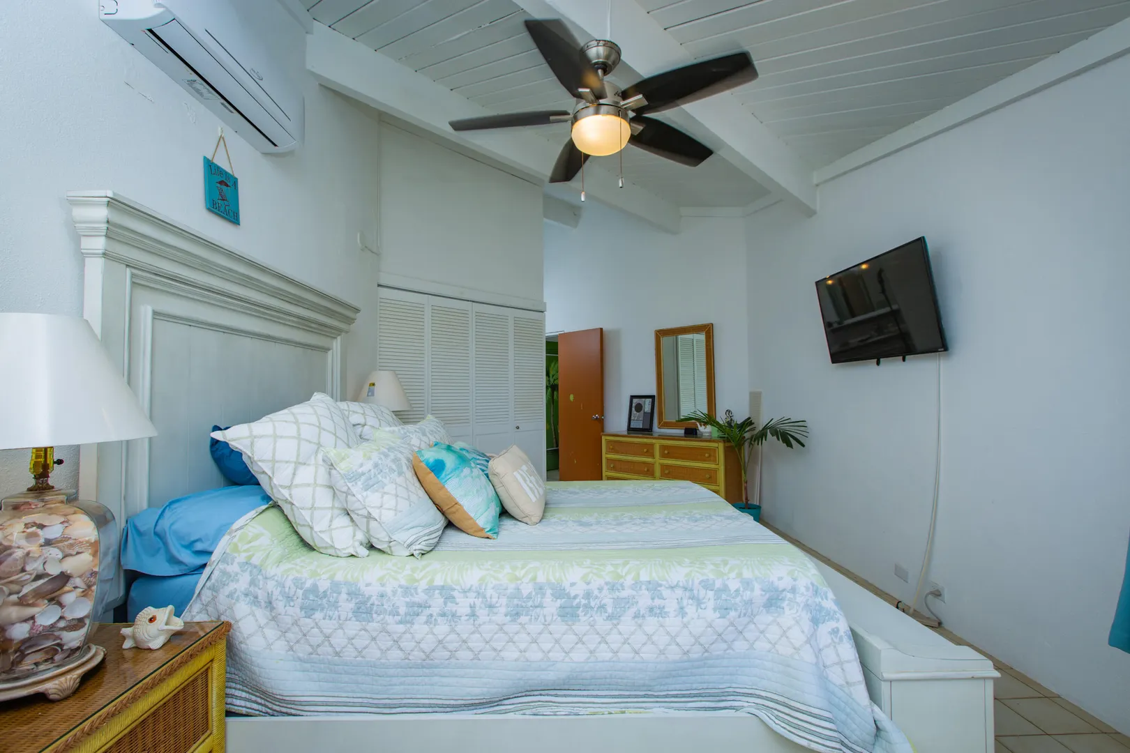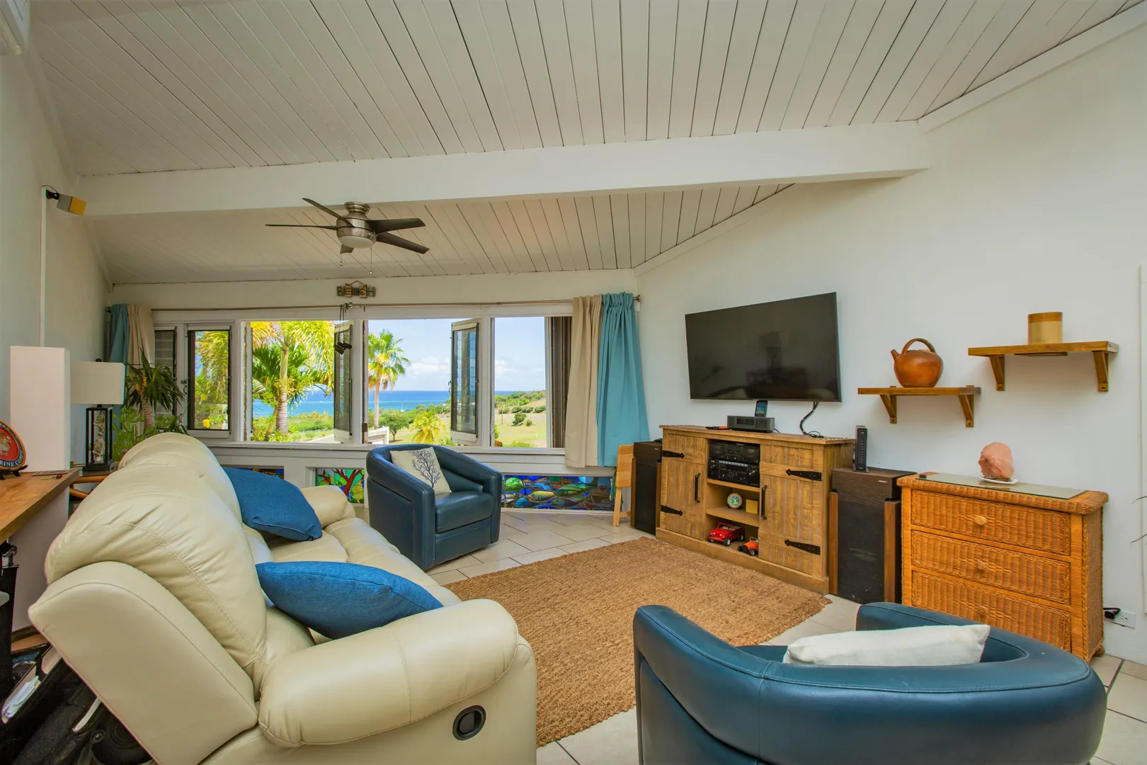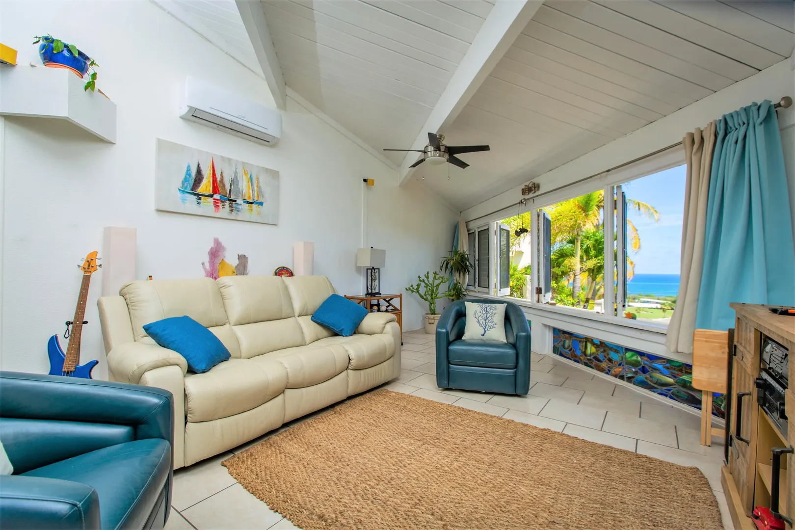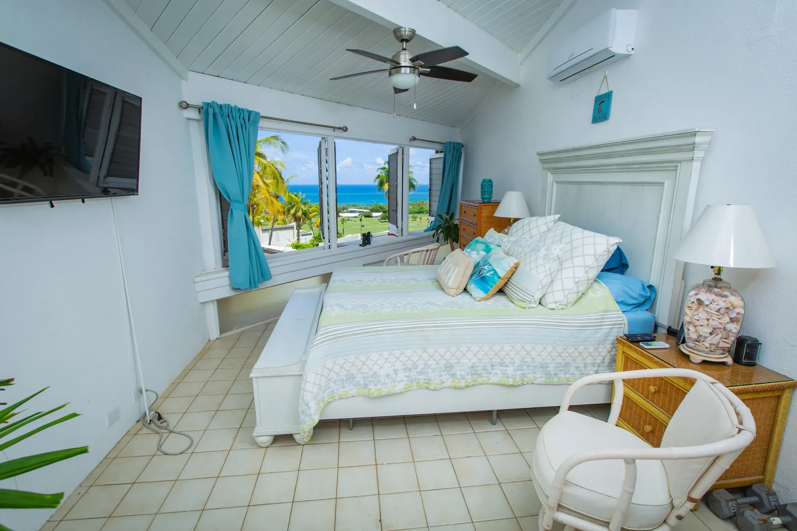 This Reef condo is not to be missed! Lovely 2 bedroom 2 bath with spectacular ocean views, refreshing trade winds, stunning upgrades throughout and plenty of patio space- located right on the golf course! Wonderful east end location close to several pristine beaches, the Yacht Club and dining at Duggan's Reef. The kitchen was beautifully remodeled with new cabinets, stunning quartz countertops, new appliances and updated electrical work. Enjoy the wonderful breezes or relax in the cool AC. 3 new split AC's installed. One can be found in each bedroom and living room. Both ensuite bathrooms also recently remodeled with lovely new vanities, tiles and fixtures. Condo comes turnkey, furnished with beautiful pieces throughout, including comfortable new memory foam mattresses.