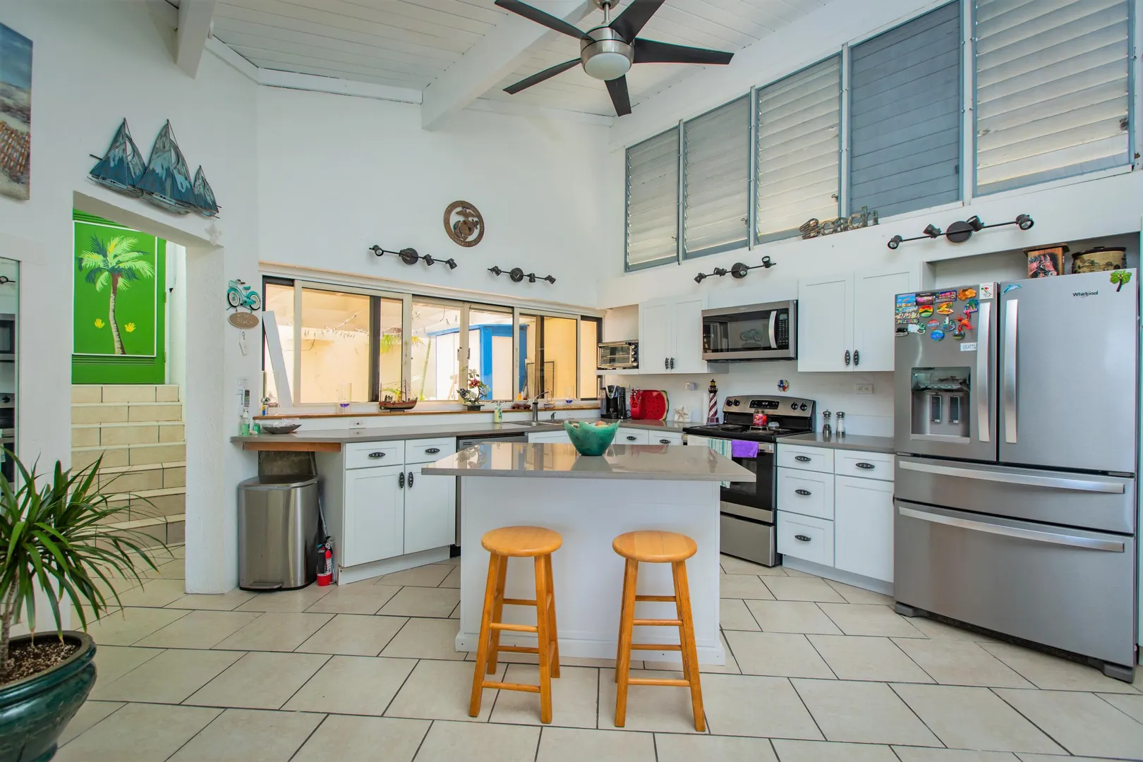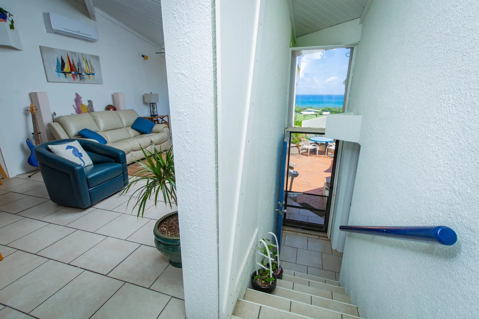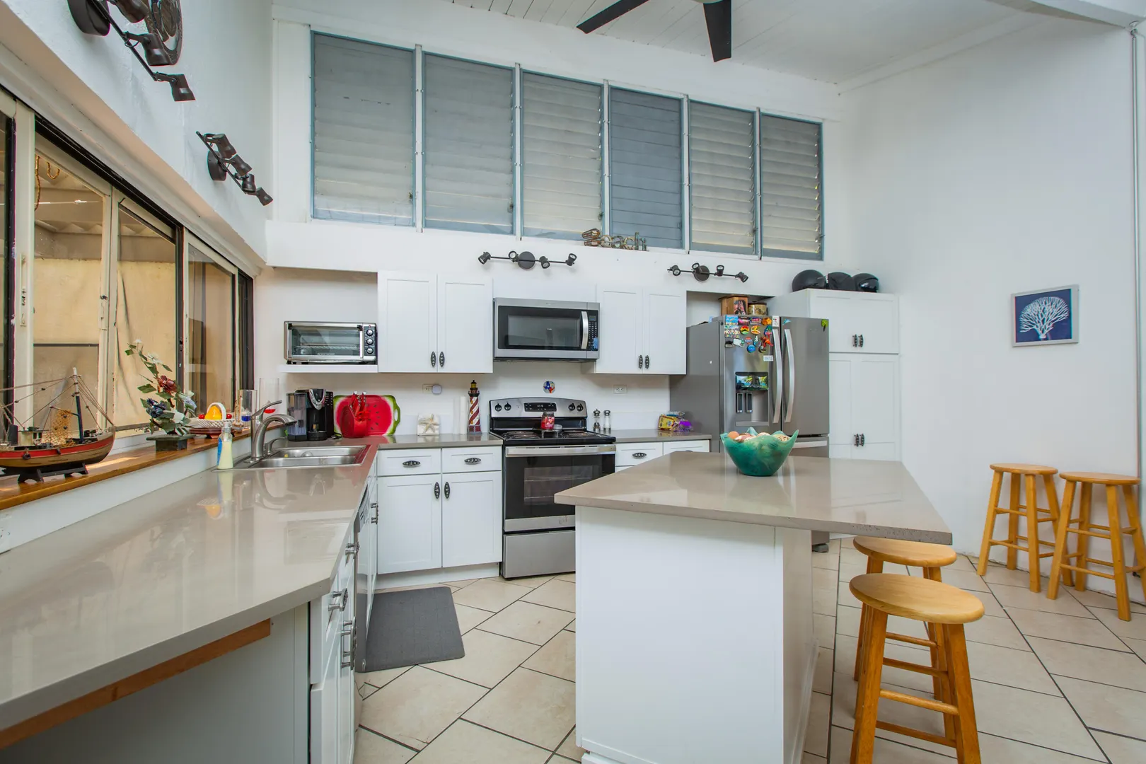 This Reef condo is not to be missed! Lovely 2 bedroom 2 bath with spectacular ocean views, refreshing trade winds, stunning upgrades throughout and plenty of patio space- located right on the golf course! Wonderful east end location close to several pristine beaches, the Yacht Club and dining at Duggan's Reef. The kitchen was beautifully remodeled with new cabinets, stunning quartz countertops, new appliances and updated electrical work. Enjoy the wonderful breezes or relax in the cool AC. 3 new split AC's installed. One can be found in each bedroom and living room. Both ensuite bathrooms also recently remodeled with lovely new vanities, tiles and fixtures. Condo comes turnkey, furnished with beautiful pieces throughout, including comfortable new memory foam mattresses.