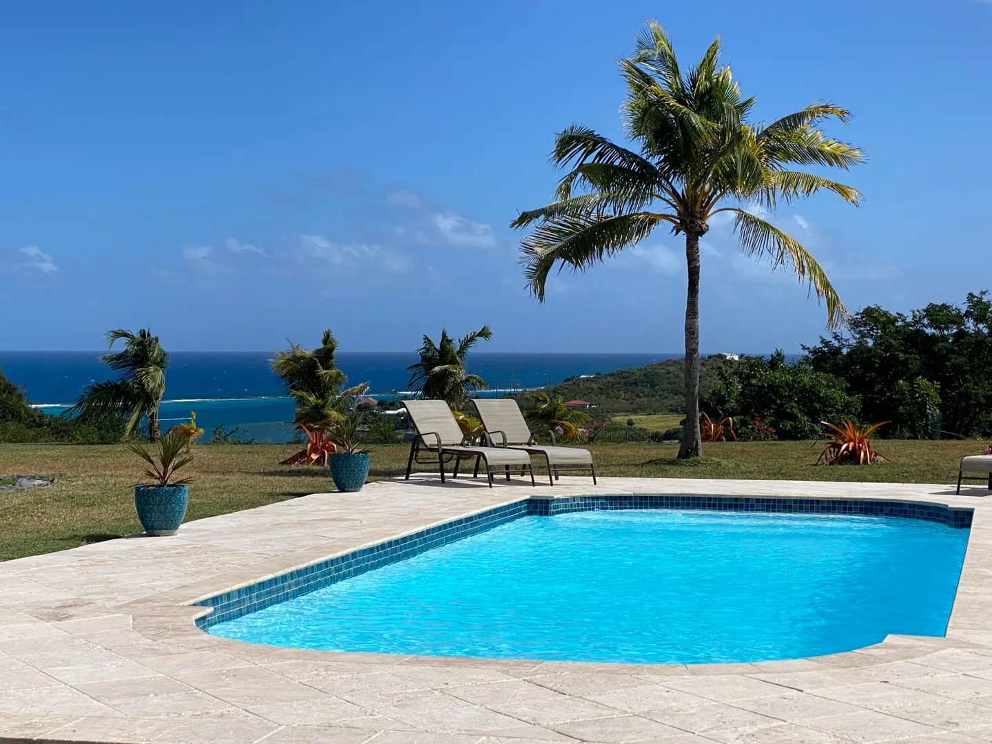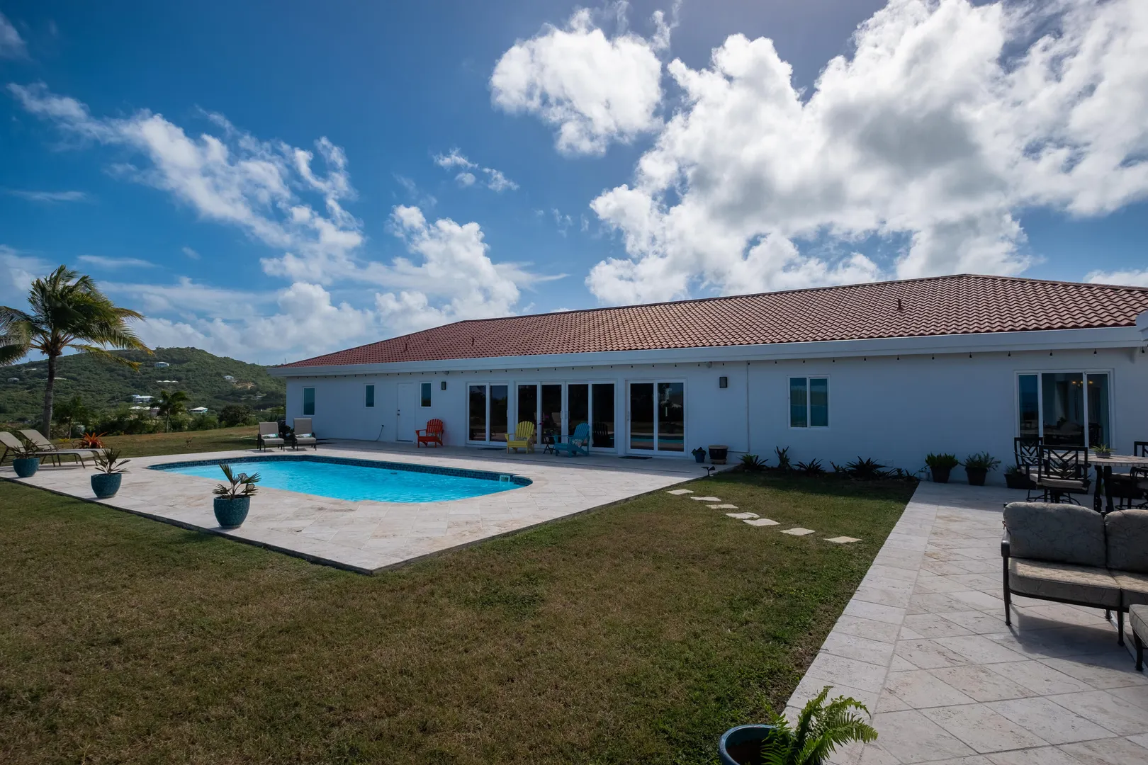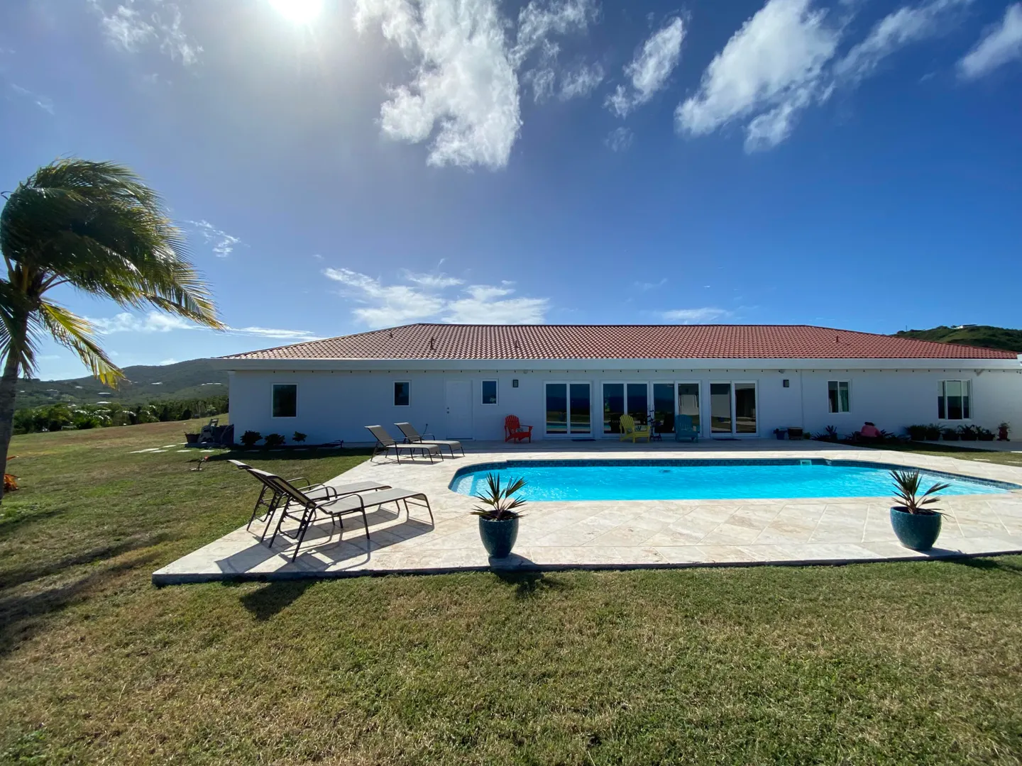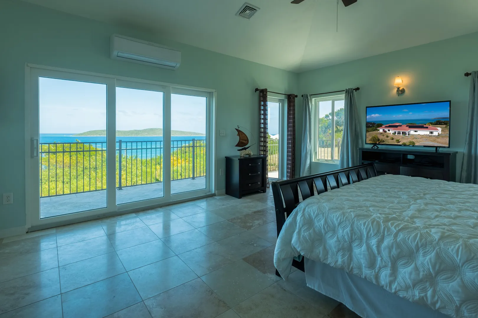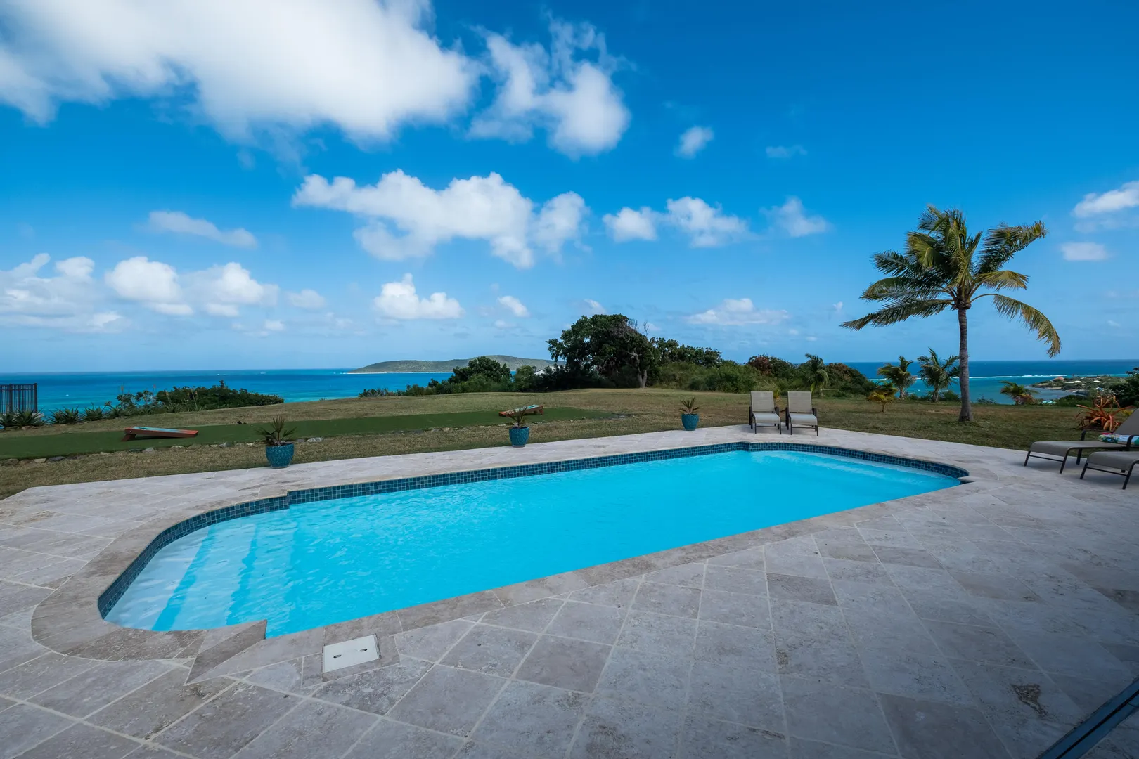 Spectacular East End home on a coveted 1.45 ac. flat knoll top with 180-degree views of the blue Caribbean Sea and splendid Buck Island. This 4 oversized bedroom villa embraces the relaxed, island lifestyle with beautiful views, a spacious high ceiling great room, open granite kitchen & separate wet bar. Step outside to the outdoor open & covered sitting areas surrounding the 32ft pool. Wow! Perfect for entertaining is the big game room with pool, ping pong, TV, and game table. This well-maintained home's fourth bedroom is a separate guest suite with additional sleeping. Another bonus is the private 800 sq. ft efficiency apartment. Some of the notable features of this upgraded, well maintained home: 10KW Solar system, all new high impact doors & windows, 45KW diesel generator, 45K cistern.