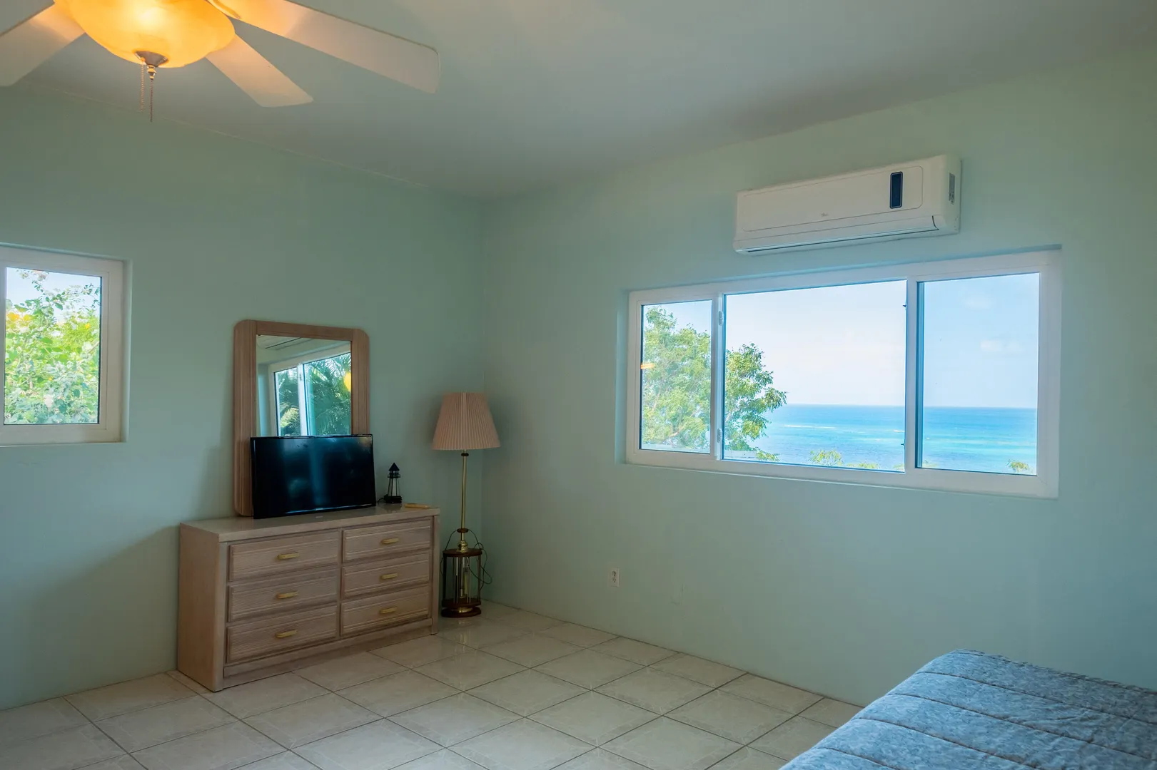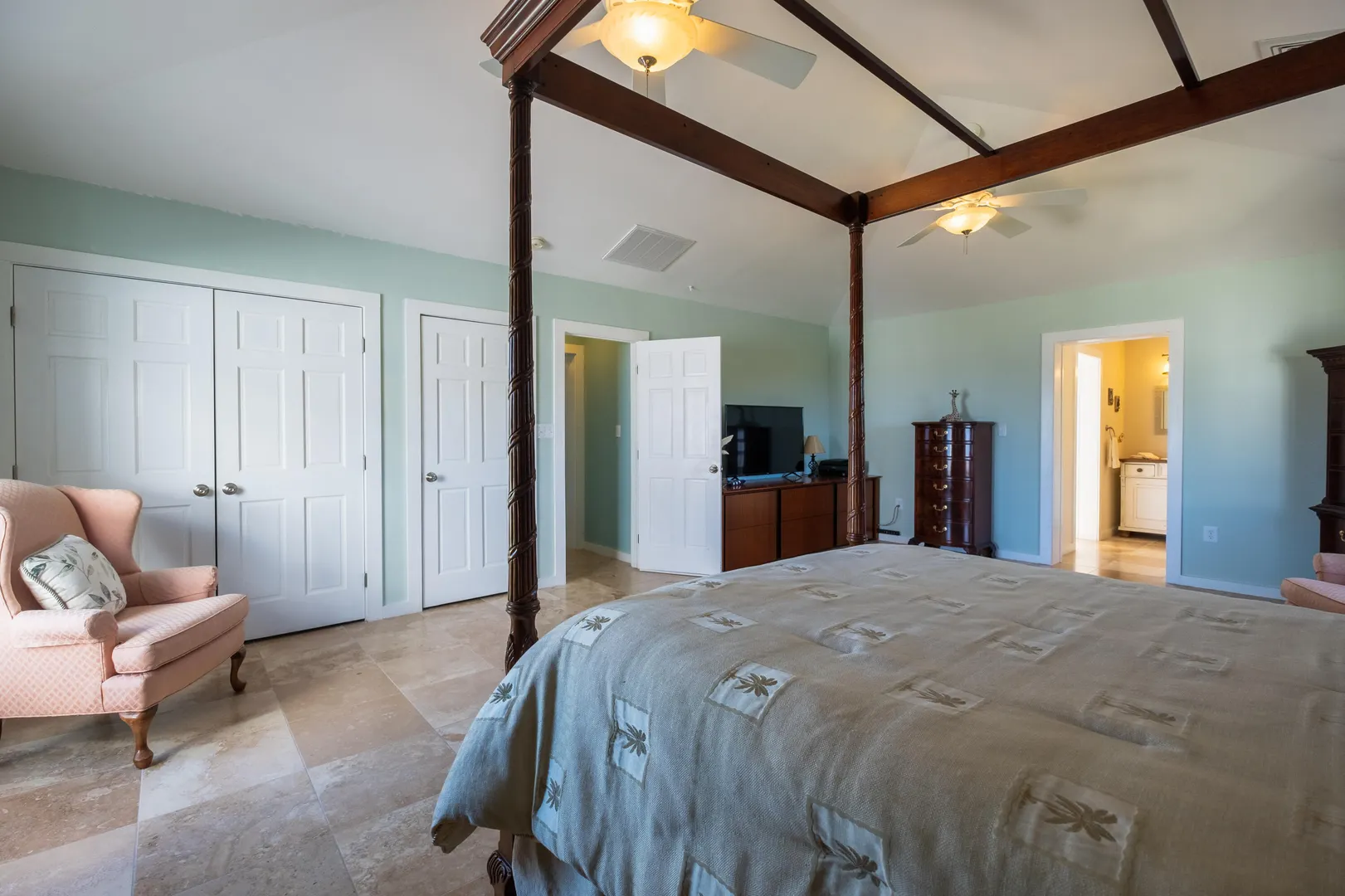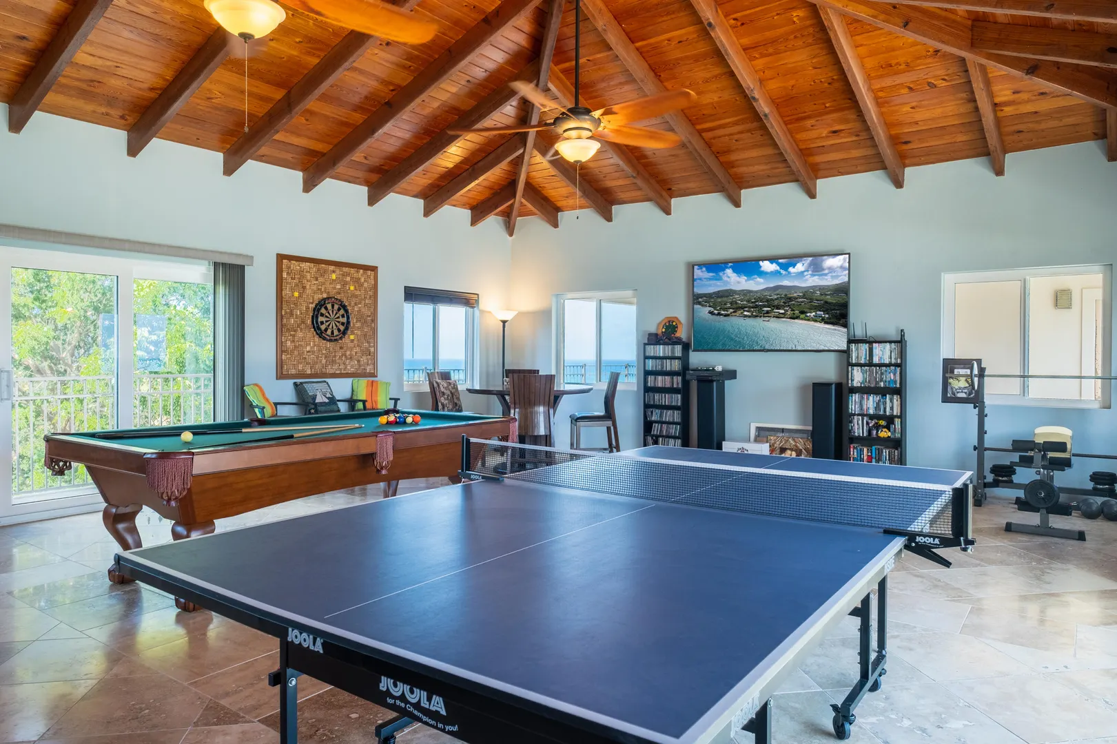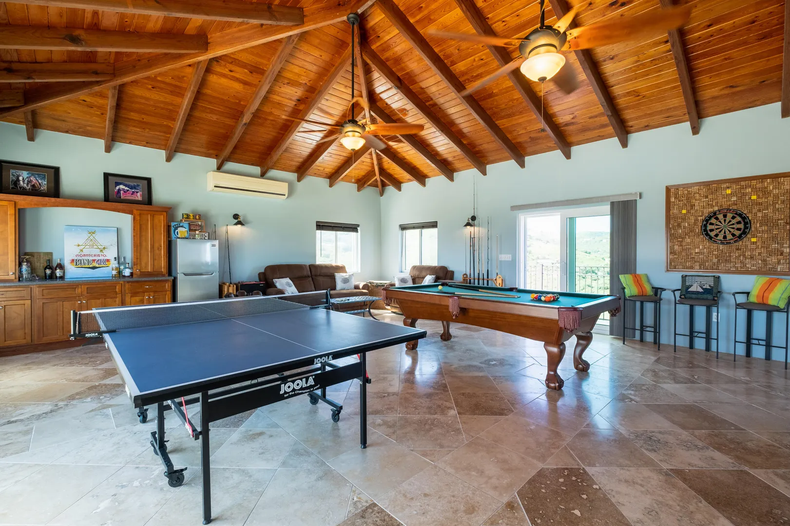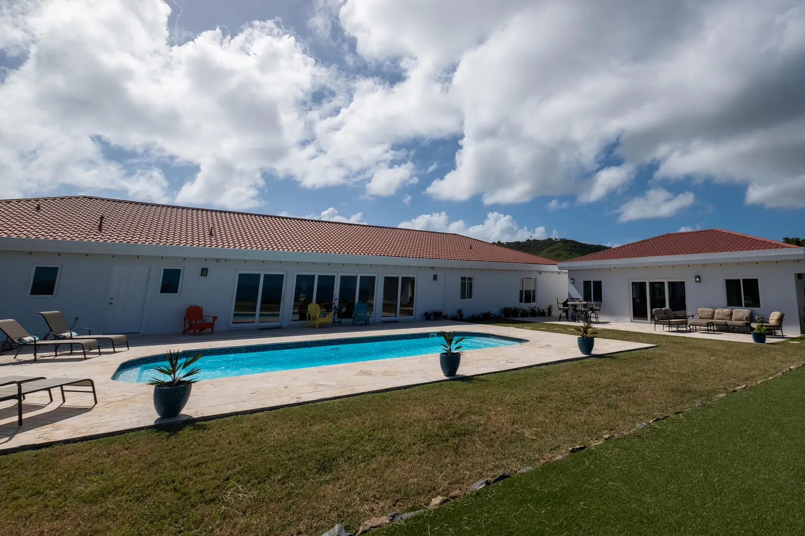 Spectacular East End home on a coveted 1.45 ac. flat knoll top with 180-degree views of the blue Caribbean Sea and splendid Buck Island. This 4 oversized bedroom villa embraces the relaxed, island lifestyle with beautiful views, a spacious high ceiling great room, open granite kitchen & separate wet bar. Step outside to the outdoor open & covered sitting areas surrounding the 32ft pool. Wow! Perfect for entertaining is the big game room with pool, ping pong, TV, and game table. This well-maintained home's fourth bedroom is a separate guest suite with additional sleeping. Another bonus is the private 800 sq. ft efficiency apartment. Some of the notable features of this upgraded, well maintained home: 10KW Solar system, all new high impact doors & windows, 45KW diesel generator, 45K cistern.