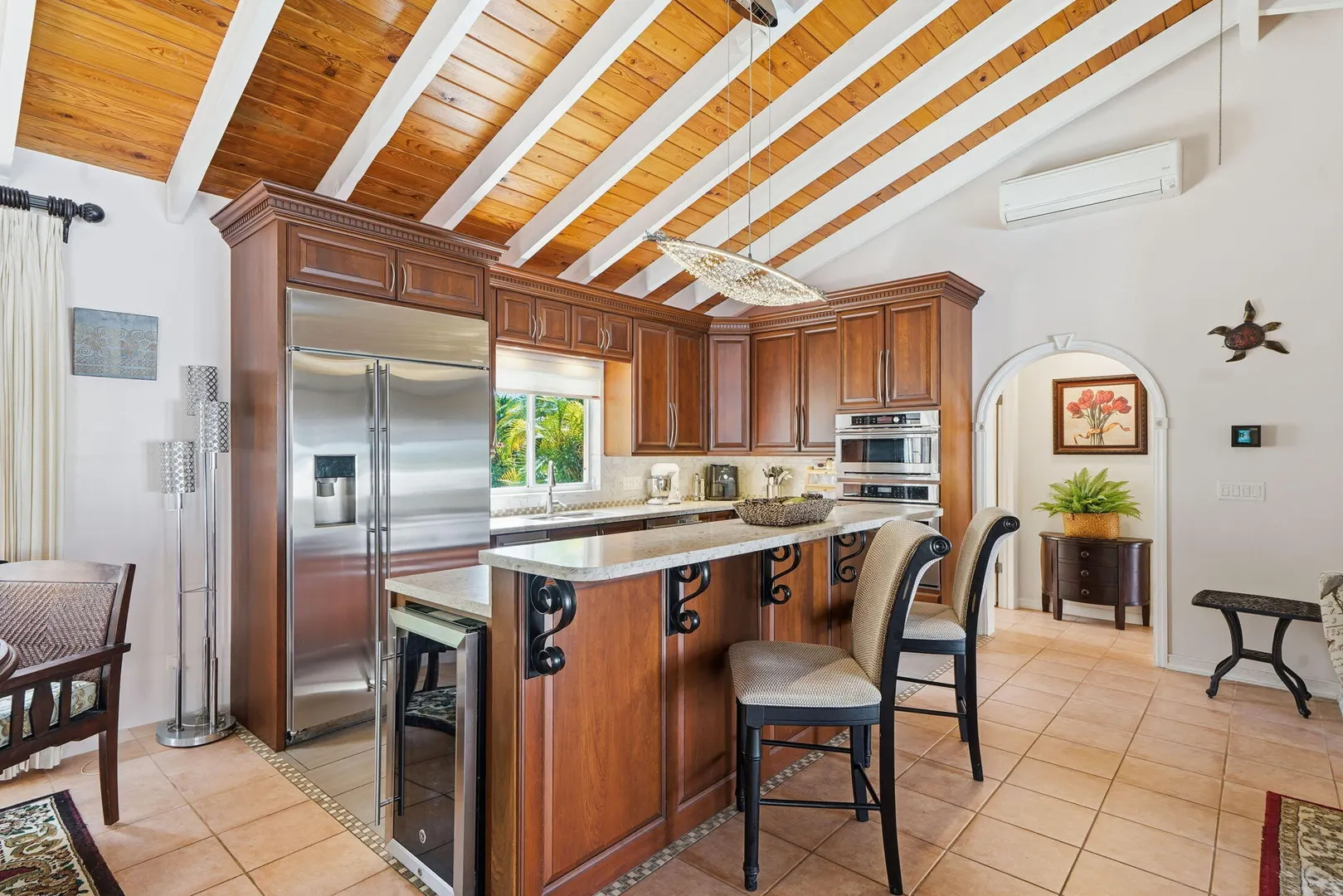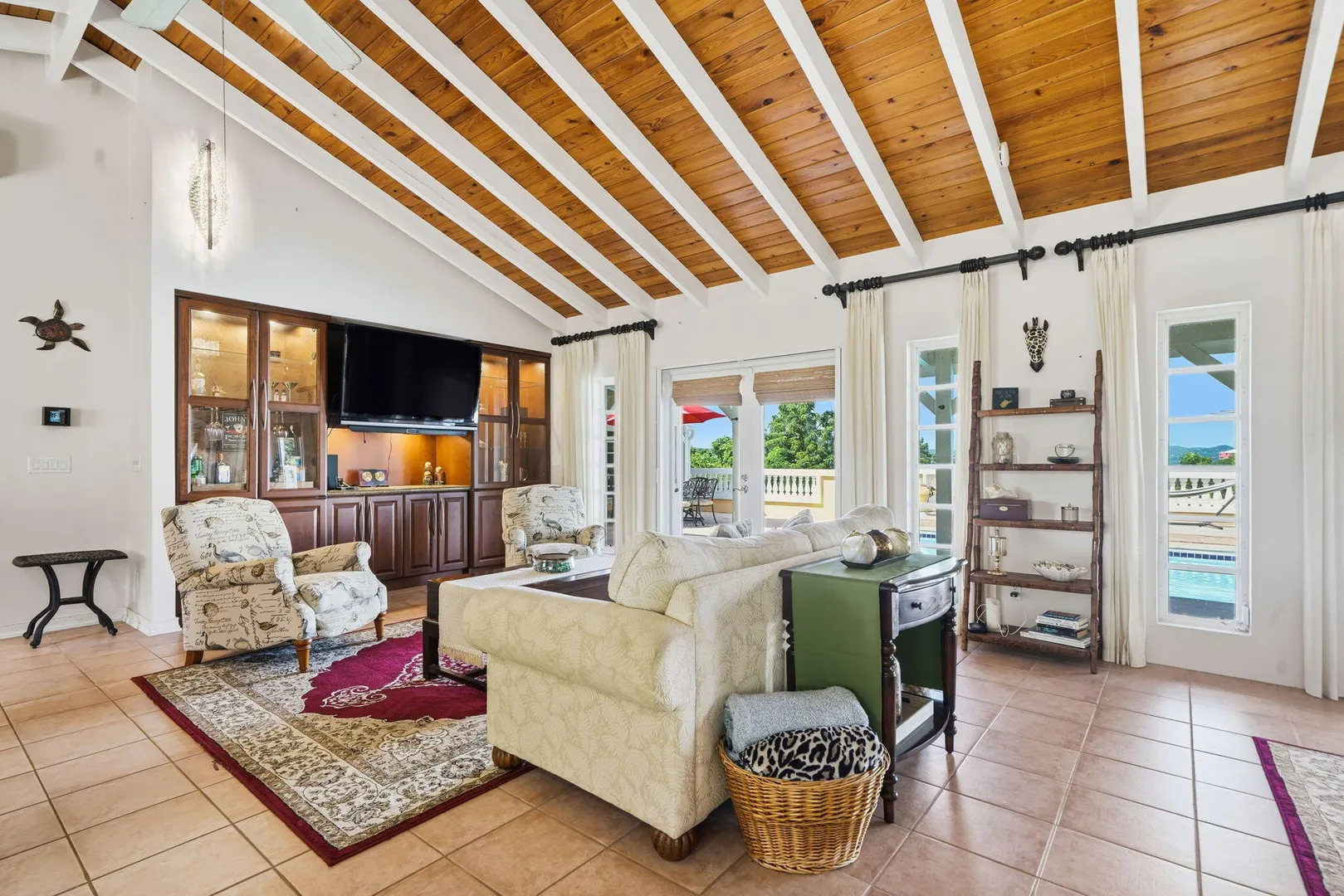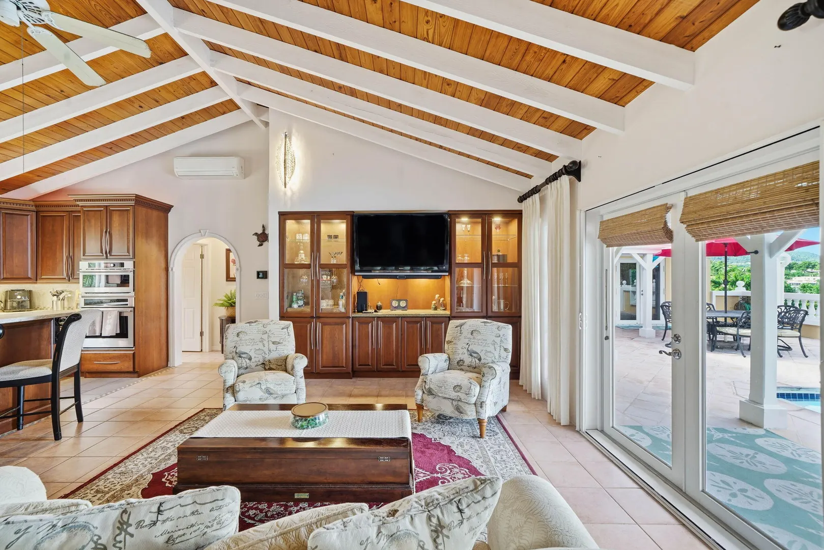 Experience effortless island living in this 3-bedroom, 3-bath villa nestled within the exclusive gated BEACHFRONT community of Shoys. Designed for both relaxation and connection, this property delivers a seamless indoor-outdoor lifestyle centered around a sparkling private pool and framed by lush tropical landscaping. Step inside to find an open-concept great room with cathedral ceilings and a beautifully renovated kitchen featuring high-end stainless-steel appliances, sleek countertops, and abundant cabinetry--a true chef's delight. The custom entertainment center with a pull-out bar, wine cooler, and breakfast bar makes hosting friends and family a breeze. The layout offers flexibility and privacy, with two bedrooms under one roof and a third suite just off the pool deck--perfect for guests or a home office. Each bathroom has been thoughtfully updated, blending coastal style with modern comfort.