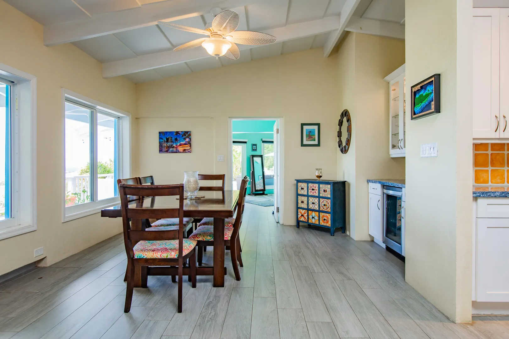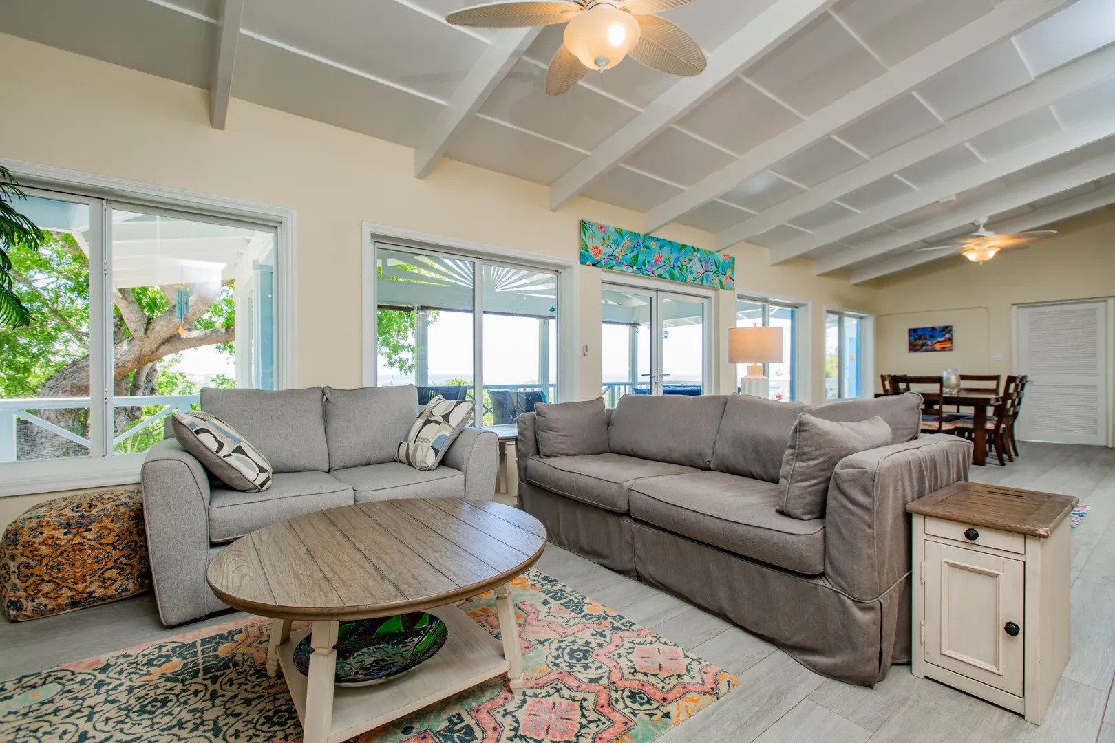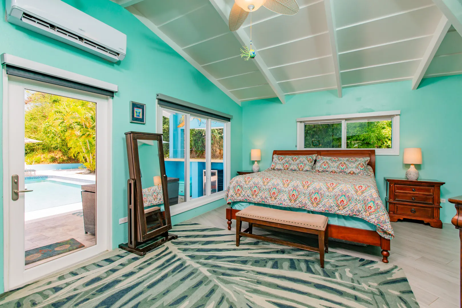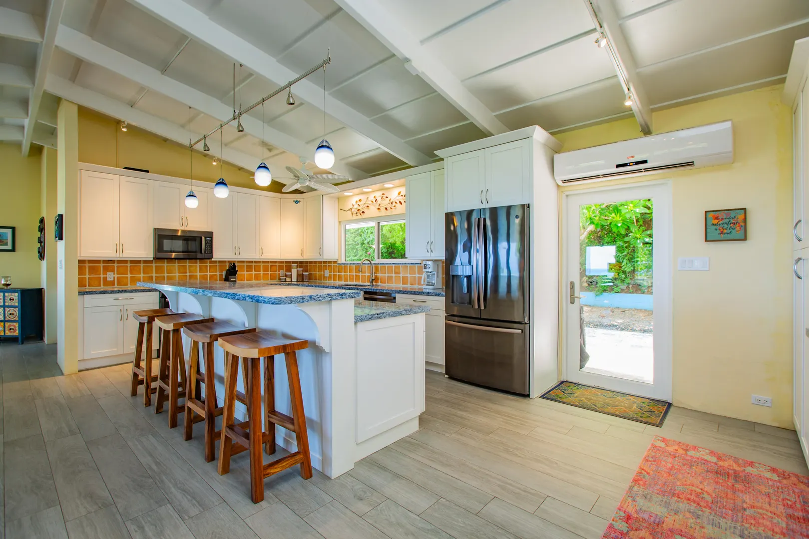 Experience paradise in every corner! 3-Bedroom, 2-Bath recently remodeled tropical oasis that seamlessly blends modern luxury w/ the natural beauty of the tropics. Located in a East End residential neighborhood w/ a brand-new concrete driveway and automatic gate, this freshly painted home also features impact glass windows & doors, generator, cathedral ceilings, open floor plan, hand painted murals by local artists, custom tile work, all new flooring, new kitchen cabinets & quartz counter tops, new bathroom showers & cabinets, new skylight in guest bath, remodeled Diamond Bright pool, pool heater, new Travertine tile patios & walkways, new outdoor bar, split A/C's & private covered gallery for entertaining and soaking up those unobstructed Green Cay island and sea views!