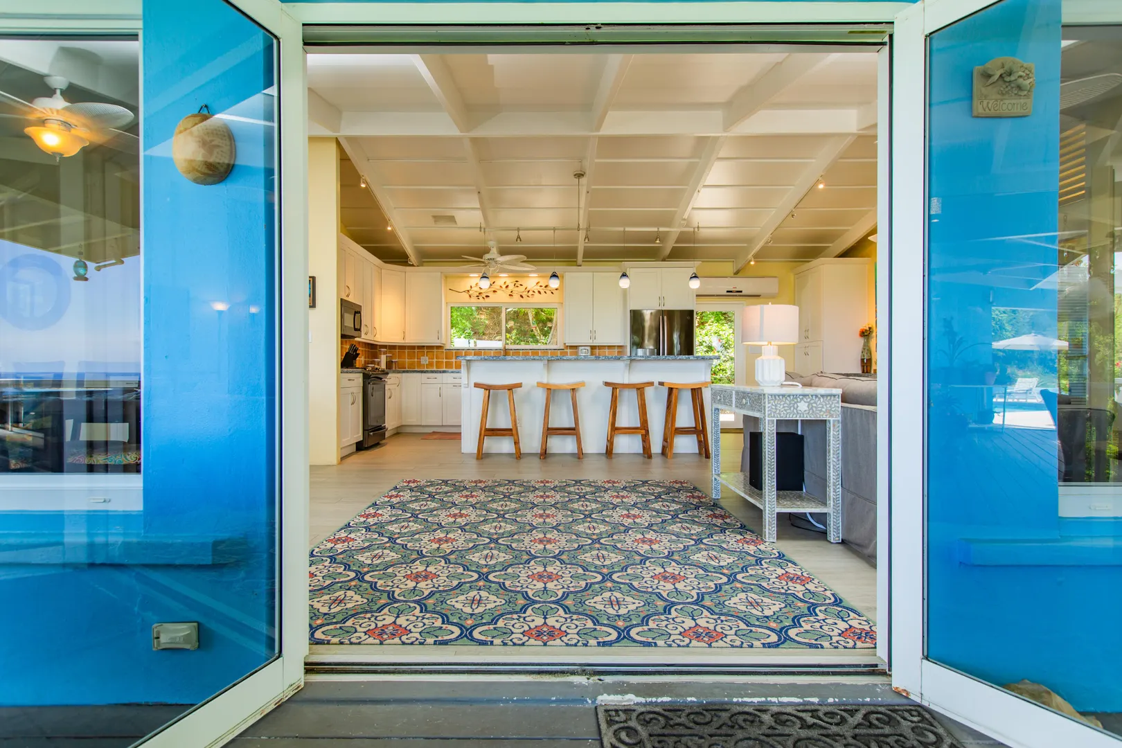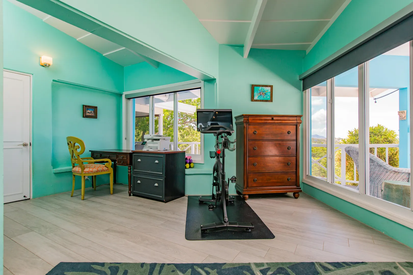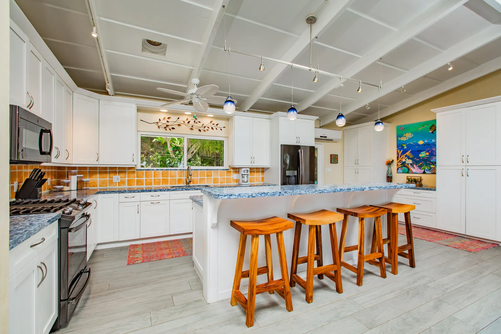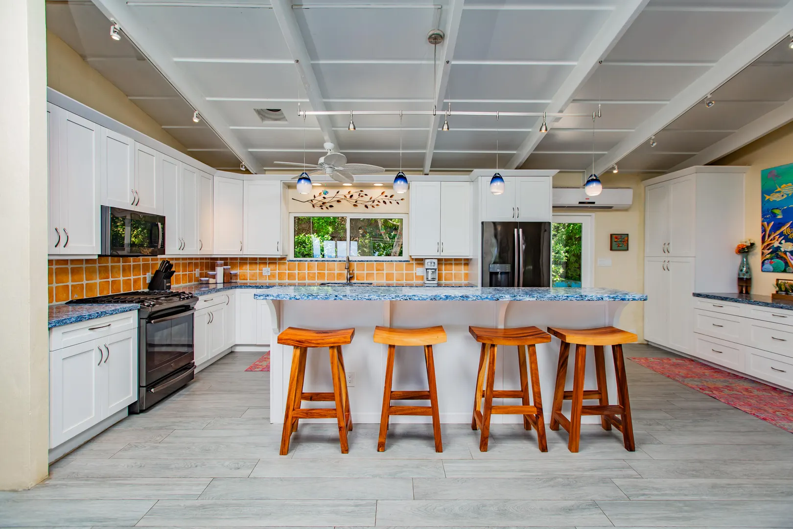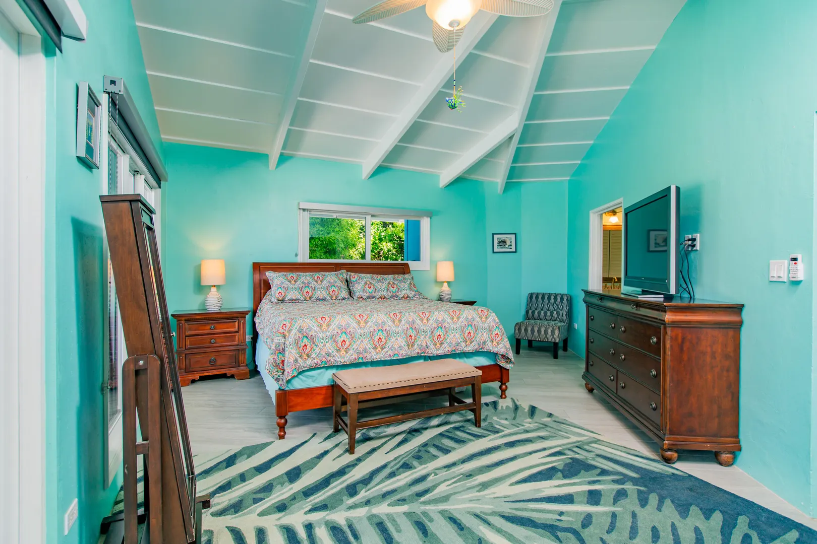 Experience paradise in every corner! 3-Bedroom, 2-Bath recently remodeled tropical oasis that seamlessly blends modern luxury w/ the natural beauty of the tropics. Located in a East End residential neighborhood w/ a brand-new concrete driveway and automatic gate, this freshly painted home also features impact glass windows & doors, generator, cathedral ceilings, open floor plan, hand painted murals by local artists, custom tile work, all new flooring, new kitchen cabinets & quartz counter tops, new bathroom showers & cabinets, new skylight in guest bath, remodeled Diamond Bright pool, pool heater, new Travertine tile patios & walkways, new outdoor bar, split A/C's & private covered gallery for entertaining and soaking up those unobstructed Green Cay island and sea views!