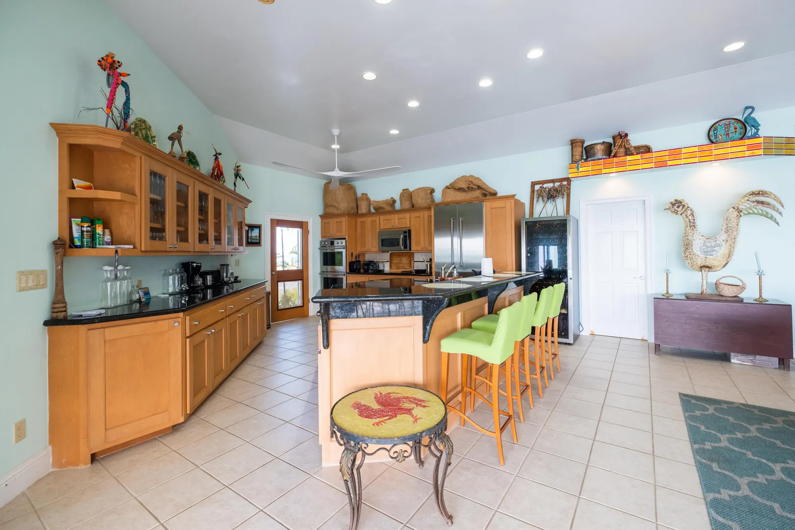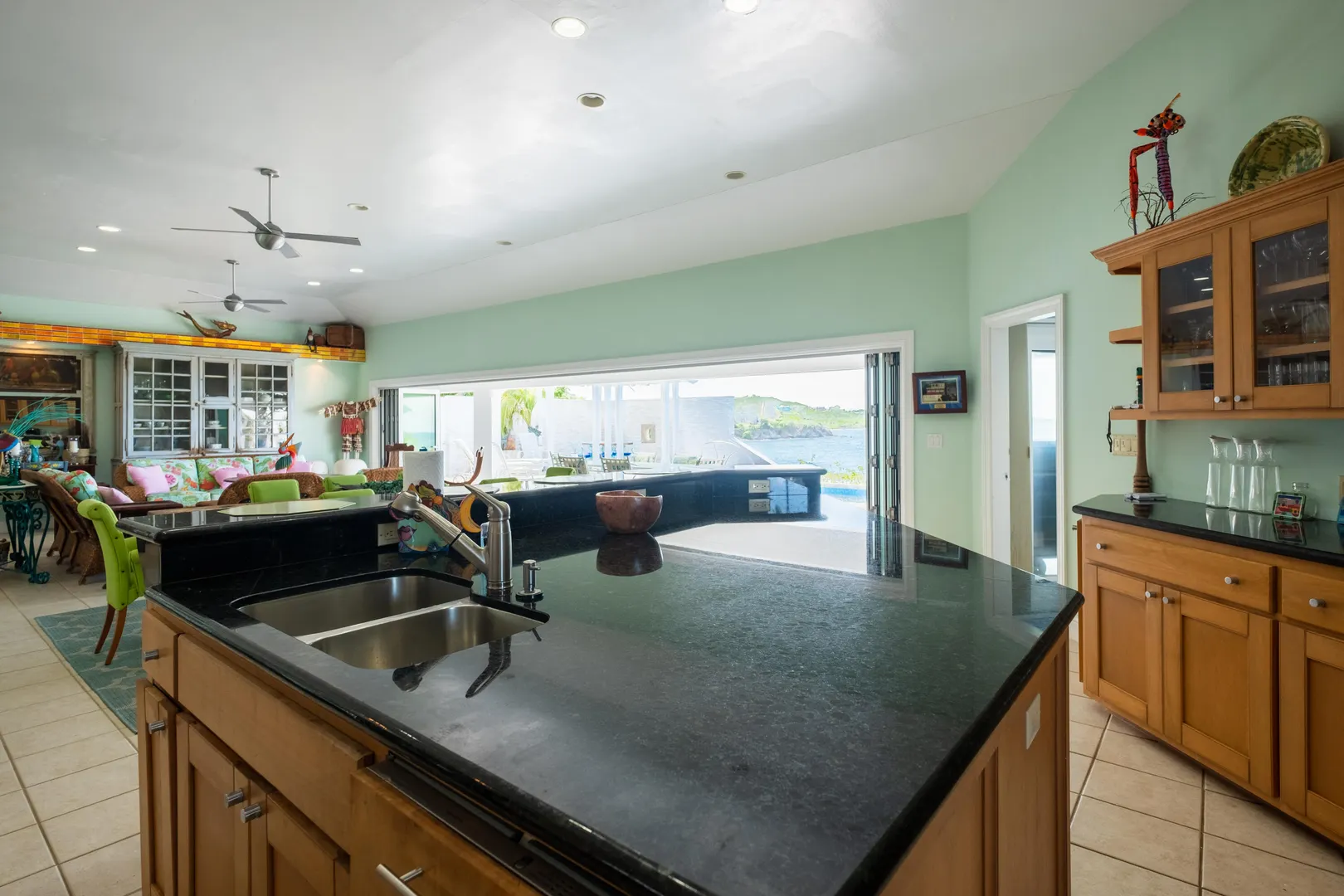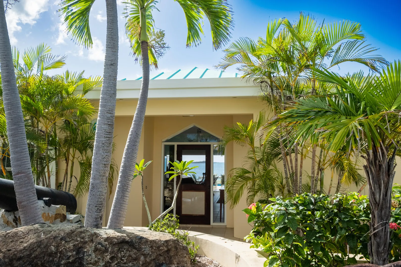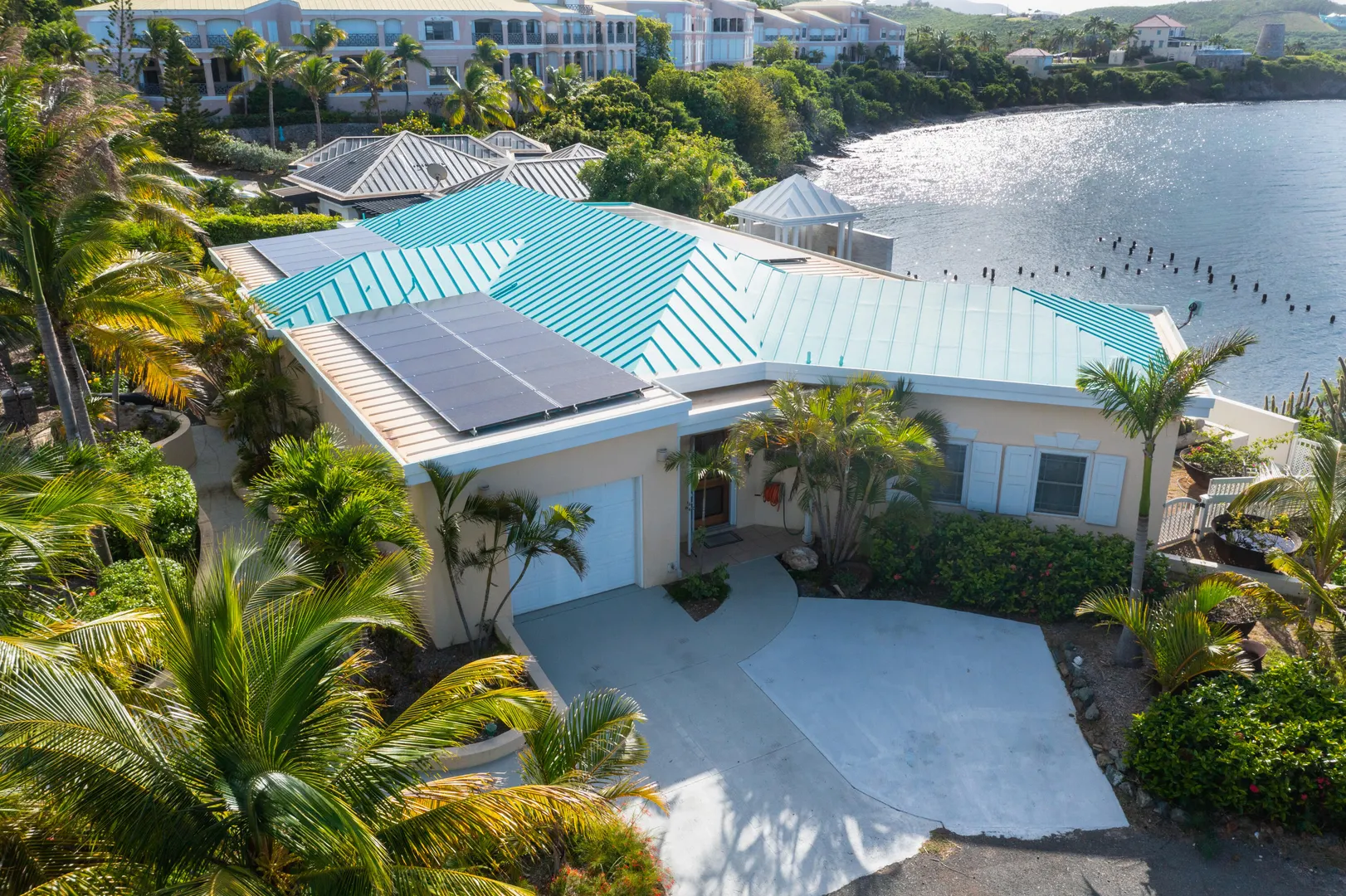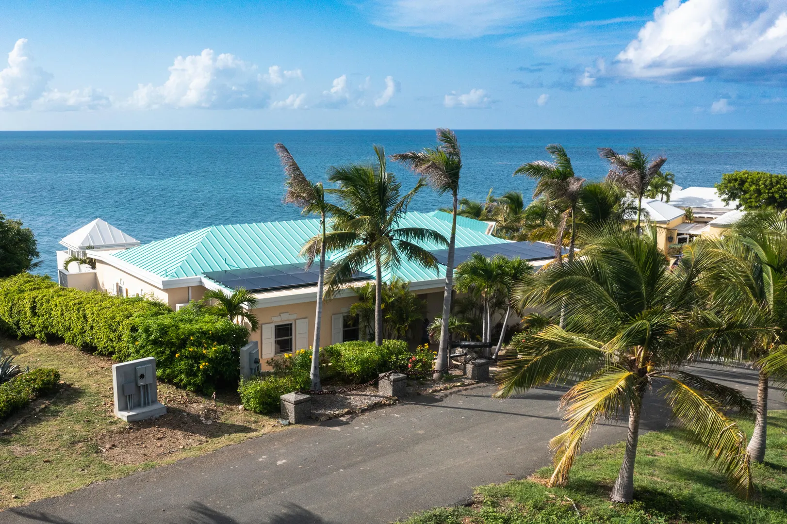 Discover this stunning Caribbean-inspired oceanfront home, a true masterpiece with breathtaking sea, sunset, and distant island views. Nestled in the exclusive, gated Carden Beach community, this immaculate 3-bedroom, 3-bath residence offers luxury, privacy, and unparalleled beauty.The home is equipped with solar power and features a heated lap pool adorned with custom glass tiles and burgundy limestone sourced directly from Provence, France. The spacious great room boasts a tray ceiling accented with custom glass tiles and soffit lighting. Expansive hurricane-resistant doors on the seaside open fully, inviting ocean breezes and framing stunning views of colorful flora and the shimmering sea.Enjoy outdoor living at its finest with a covered gallery and dining area with seating for eight, perfect for savoring the waves and sunsets. A poolside pergola with a unique custom stone porthole offers an alfresco dining experience enhanced by the soothing sounds of the ocean.