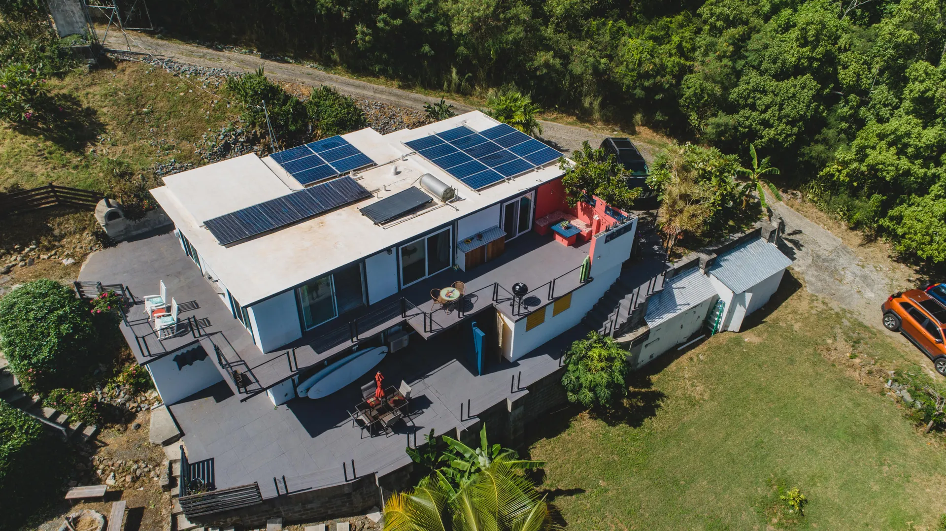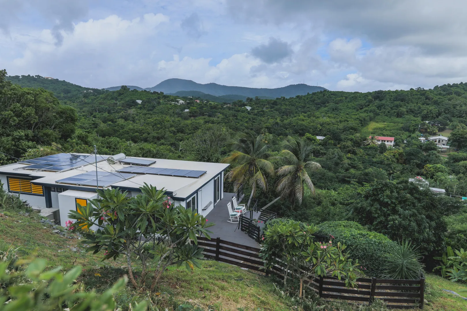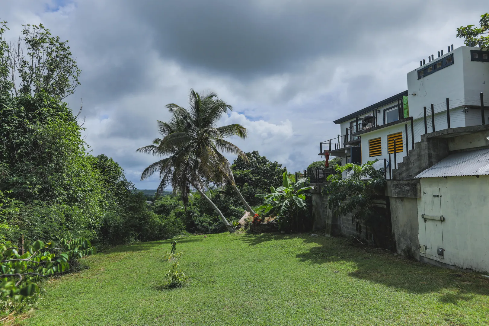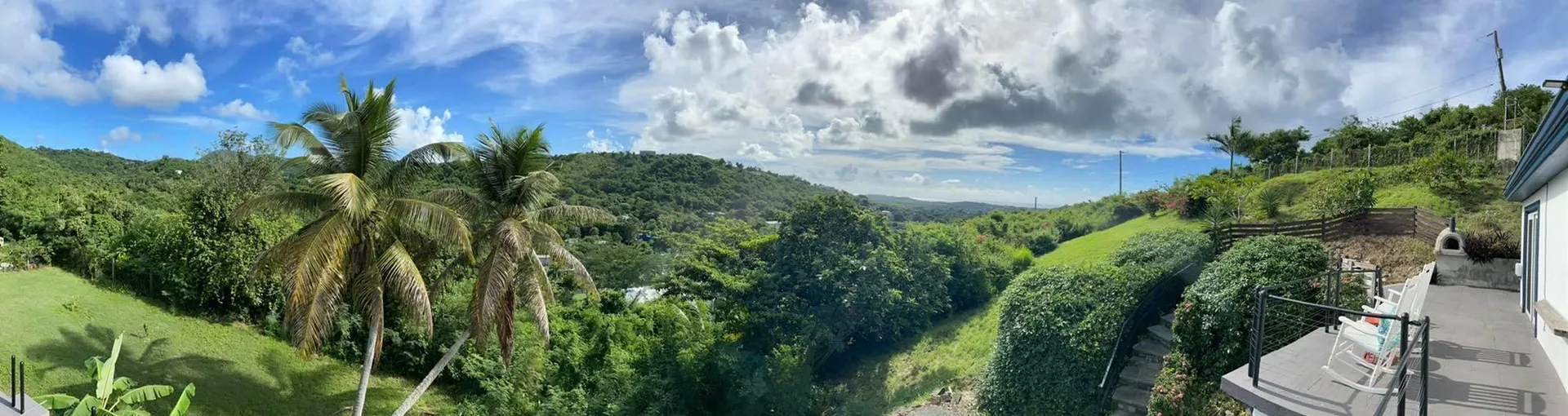 Beautiful, hillside property with spectacular valley and South shore views. This solid concrete home offers a spacious one bedroom upstairs (was 2 bedrooms, but current owners knocked down the wall to make one large bedroom). The updated kitchen opens up to a newly tiled living and dining room with expansive sea and valley views.The wrap around concrete patio provides many options to relax outdoors in privacy. The one bedroom, one bath lower level includes a second kitchen as well as a separate entrance, so it can be used as either a rental or an in-law suite.An energy saving solar system with net metering keeps your power bills low, and back up generator (6 KW) gives you peace of mind. The property is nearly an acre of lush landscape with a plethora of fruit trees. An island dream.