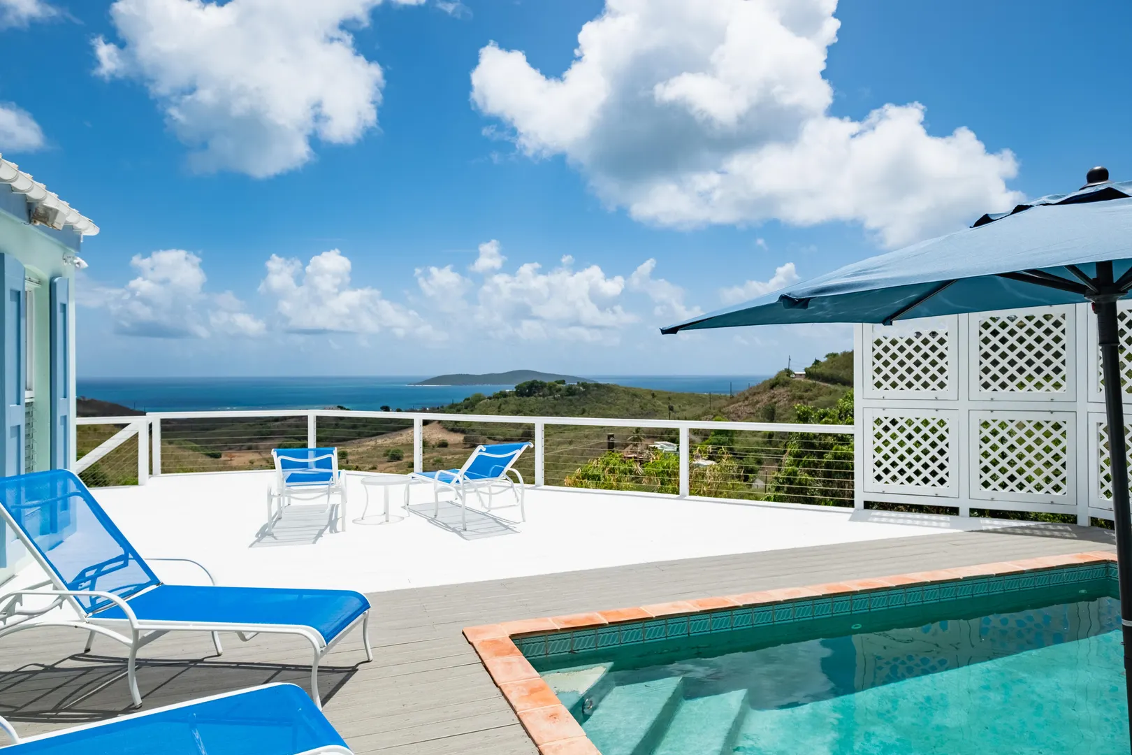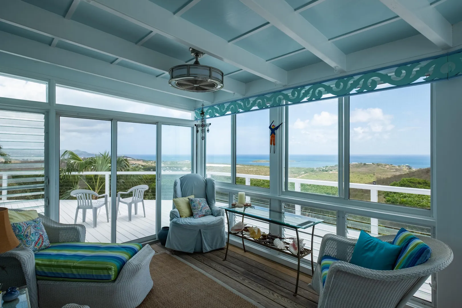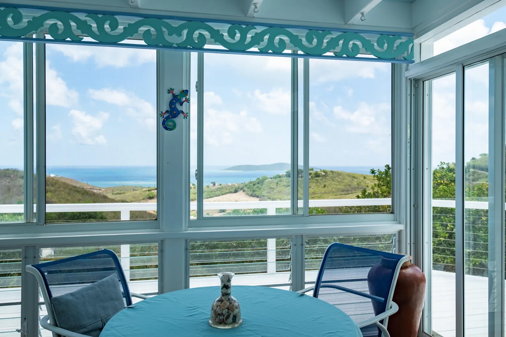 LIFE IS BETTER IN ALL FOR THE BETTER! This spacious and charming home is nestled in the hills of a desirable East End neighborhood, with an automatic gated entry. The setting on 1.7 lushly landscaped acres offer stupendous views from Christiansted to Buck Island, and the distant islands plus a glistening 'lights at night' panorama too! This immaculate home features 3 BRs and 3 baths upstairs w/ split AC in MBR and central in main, & a 2nd AC in 2nd BR, a1 BR apt. w/ AC below w/ its own private pkg. Enjoy the breezes on the new enclosed porch off the great room, which was specifically tied into the ground below for added reinforcement. Wander out to the pool on the wrap-around deck and sunning areas, and enjoy a refresher on the built-in pool seat & table under the umbrella!