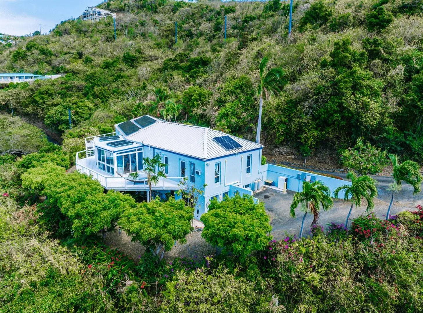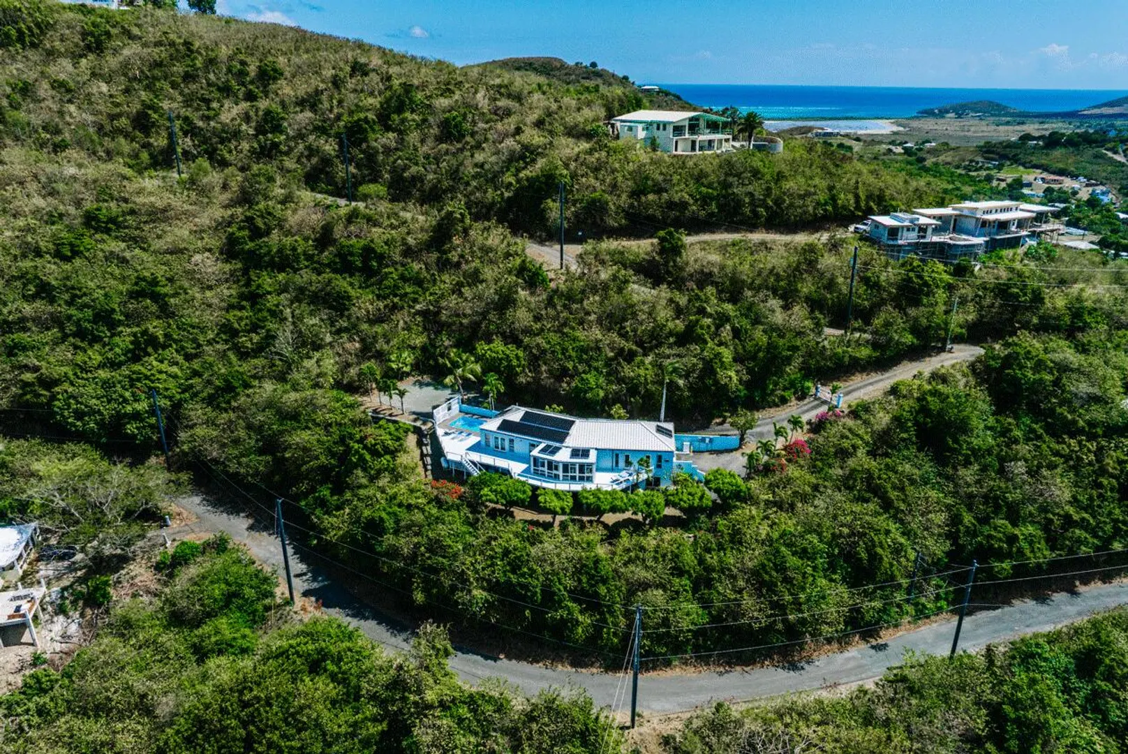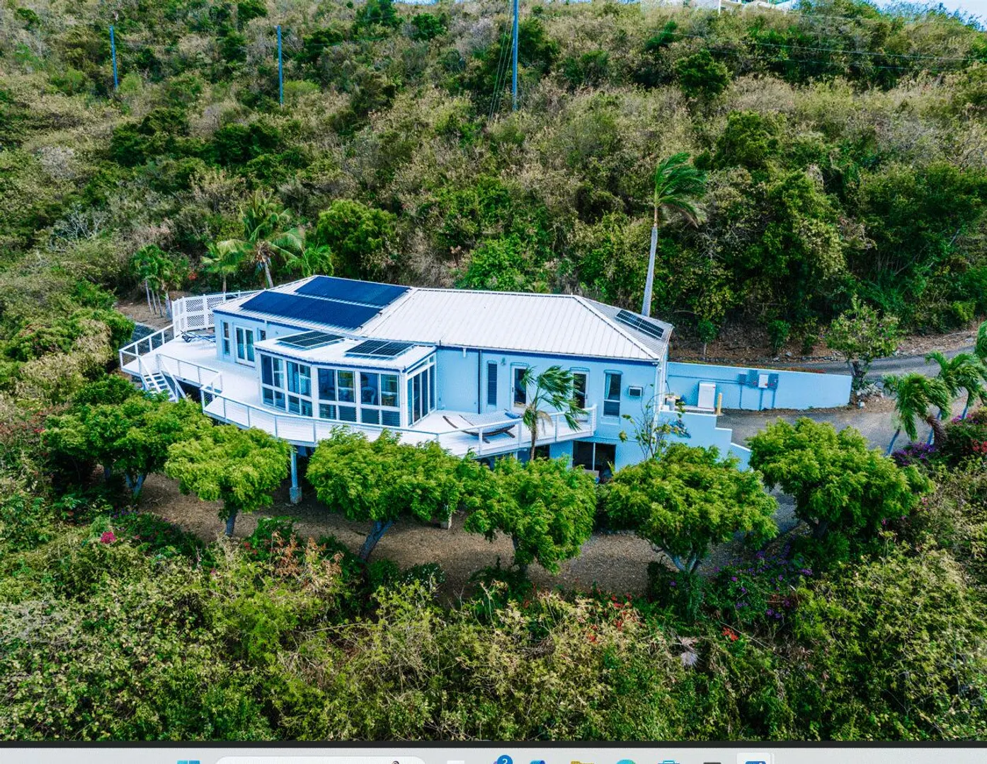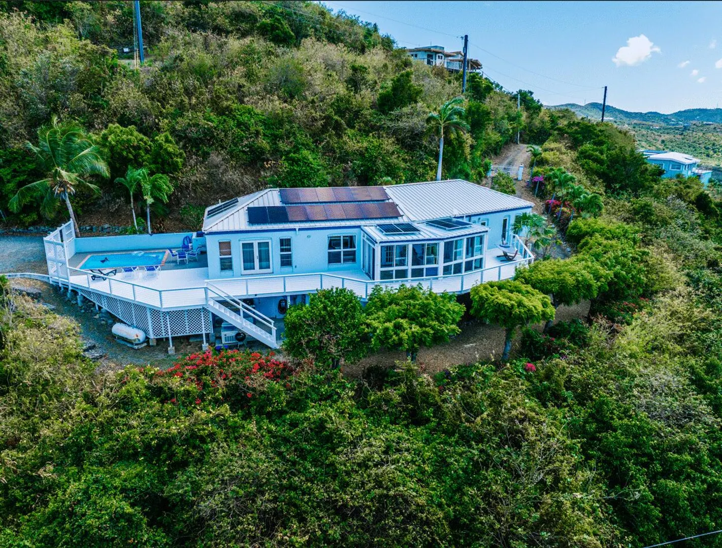 Unrivaled Caribbean Views from Buck Island to Judith's Fancy Point - Set on 1.2 acres of lushly landscaped grounds, this solidly built 3 BR/3 bath home with 1BR/1bath apt, pool, and solar w/ net metering & Tesla battery system is located high in the hills in the Seven Hills/AFTB mid-east end neighborhood behind an automatic gated entry. The home is immaculately maintained and offers expansive vistas stretching from Buck Island to Green Cay, all the way west across Christiansted to Judith's Fancy Point. Whether by day with the endless turquoise waters and offshore islands or by night with a shimmering canvas of twinkling lights in C'sted, the views are simply unforgettable. The open-concept kitchen is designed for entertaining with quartz countertops, a custom mahogany island and bar,and flows seamlessly into the great room and dining area. An enclosed porch - engineered for structural reinforcement - invites you to relax and soak in the sweeping views of the Caribbean Sea and distant islands. Step out onto the wrap-around deck to bask in the sun or cool off in the pool, complete with a built-in seat and umbrella-shaded table.