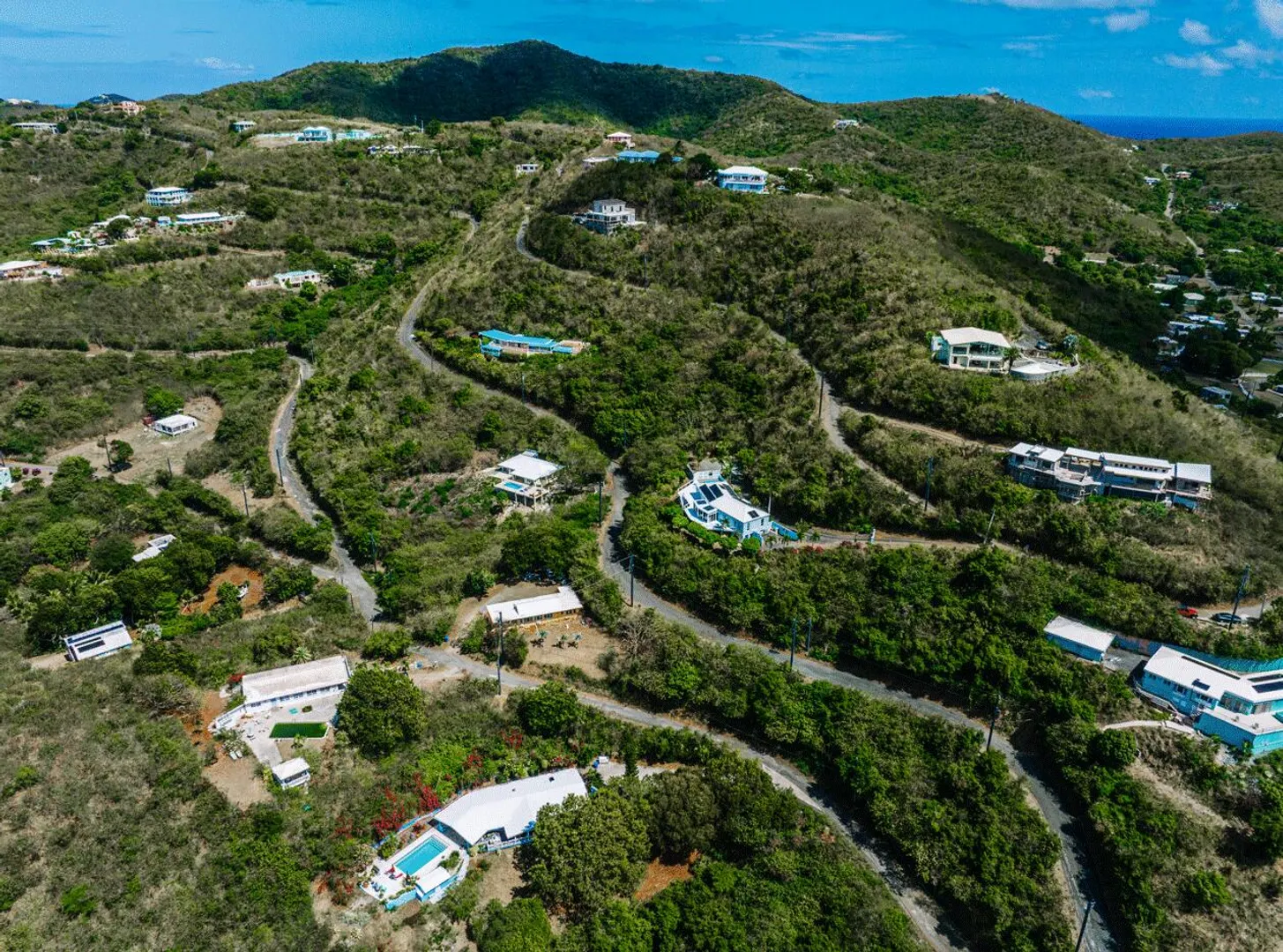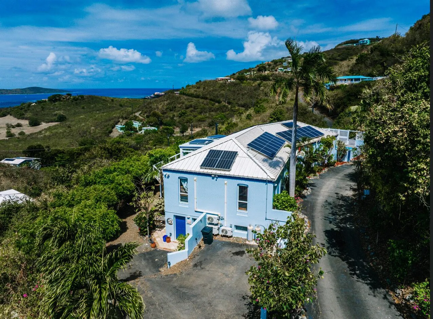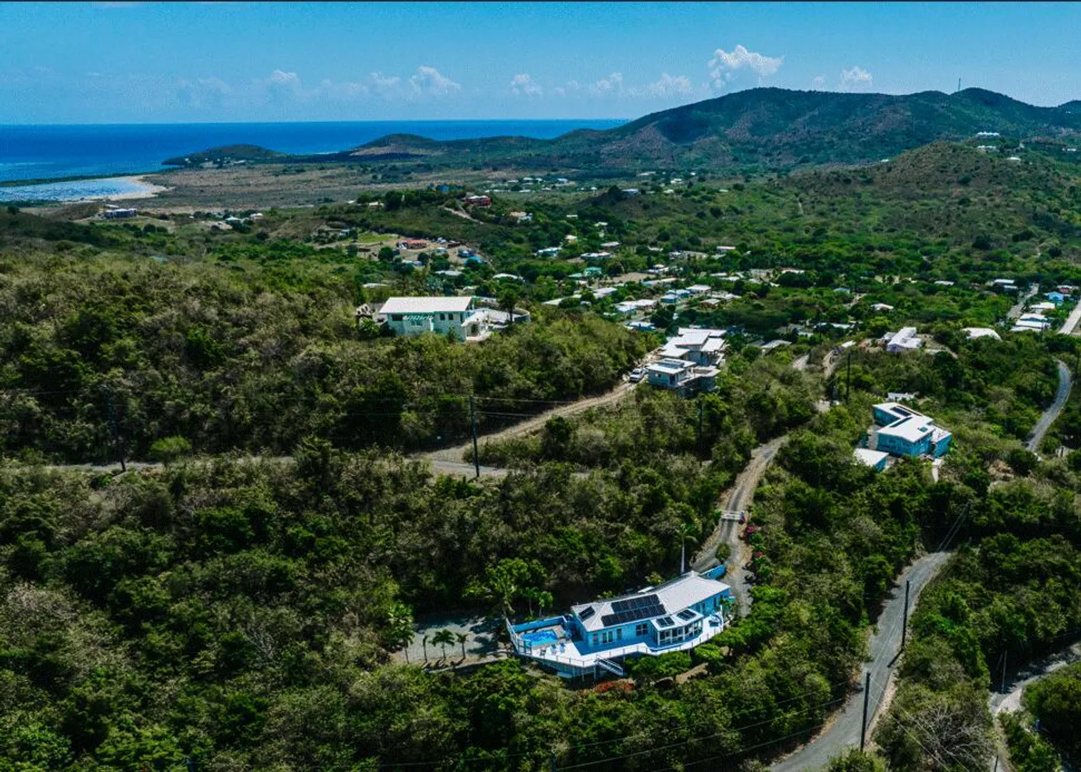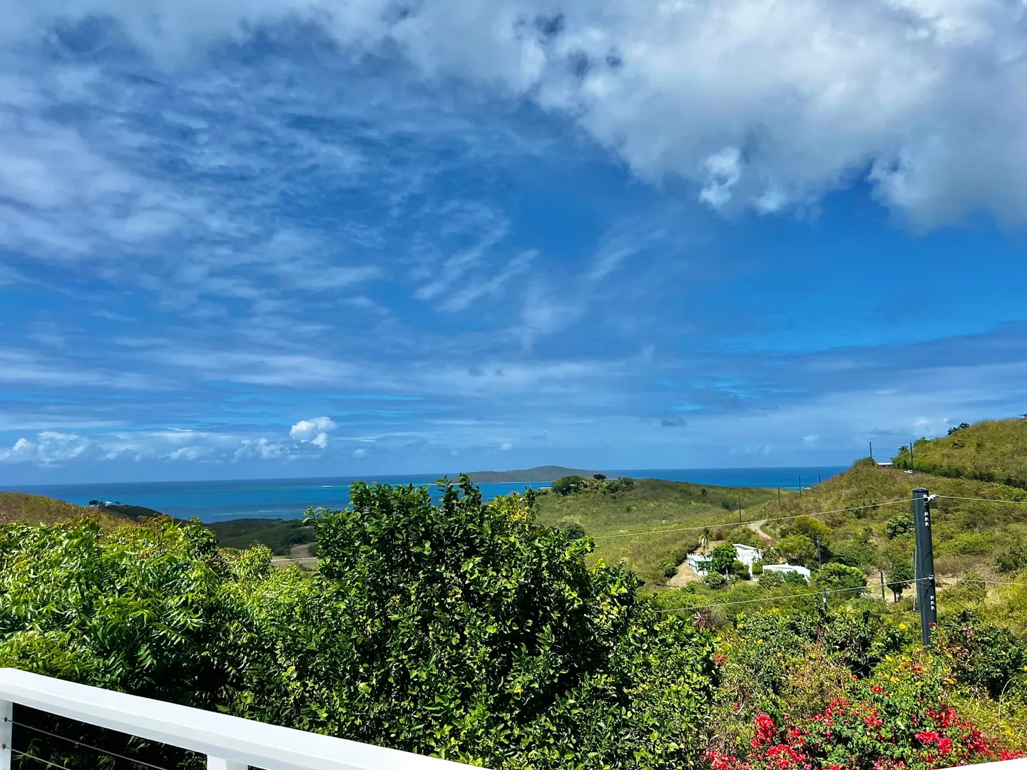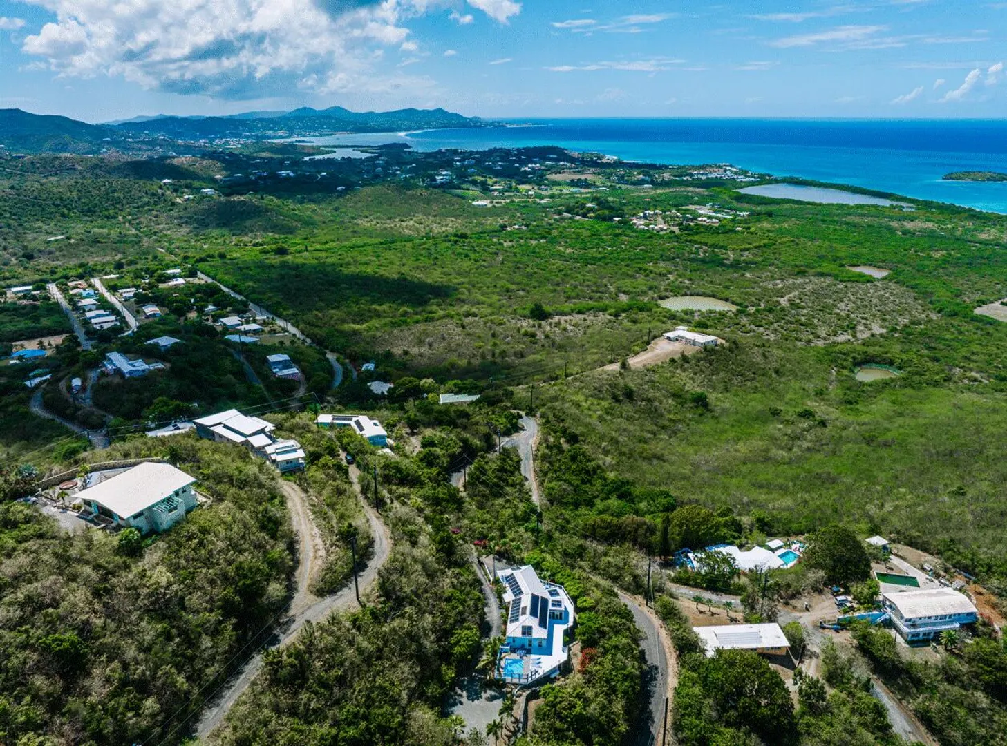 Unrivaled Caribbean Views from Buck Island to Judith's Fancy Point - Set on 1.2 acres of lushly landscaped grounds, this solidly built 3 BR/3 bath home with 1BR/1bath apt, pool, and solar w/ net metering & Tesla battery system is located high in the hills in the Seven Hills/AFTB mid-east end neighborhood behind an automatic gated entry. The home is immaculately maintained and offers expansive vistas stretching from Buck Island to Green Cay, all the way west across Christiansted to Judith's Fancy Point. Whether by day with the endless turquoise waters and offshore islands or by night with a shimmering canvas of twinkling lights in C'sted, the views are simply unforgettable. The open-concept kitchen is designed for entertaining with quartz countertops, a custom mahogany island and bar,and flows seamlessly into the great room and dining area. An enclosed porch - engineered for structural reinforcement - invites you to relax and soak in the sweeping views of the Caribbean Sea and distant islands. Step out onto the wrap-around deck to bask in the sun or cool off in the pool, complete with a built-in seat and umbrella-shaded table.