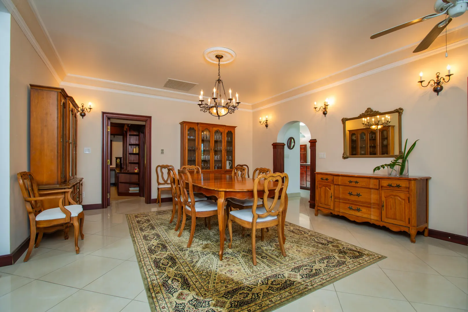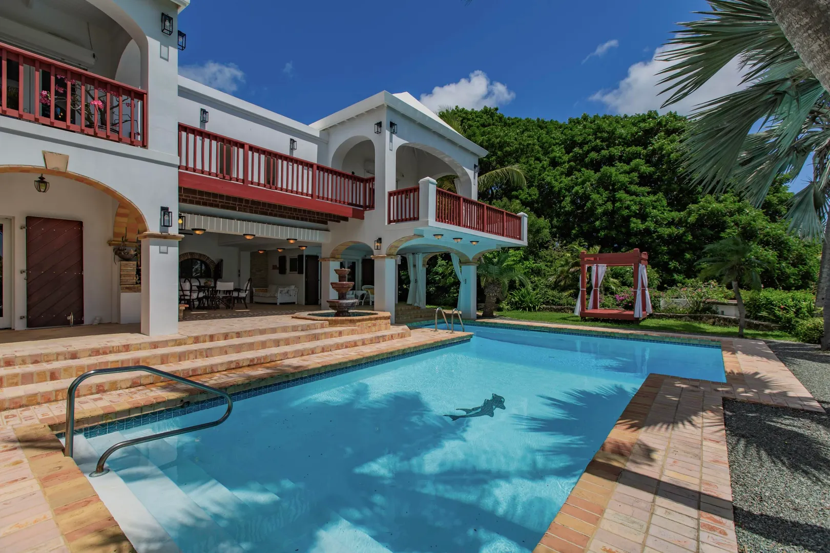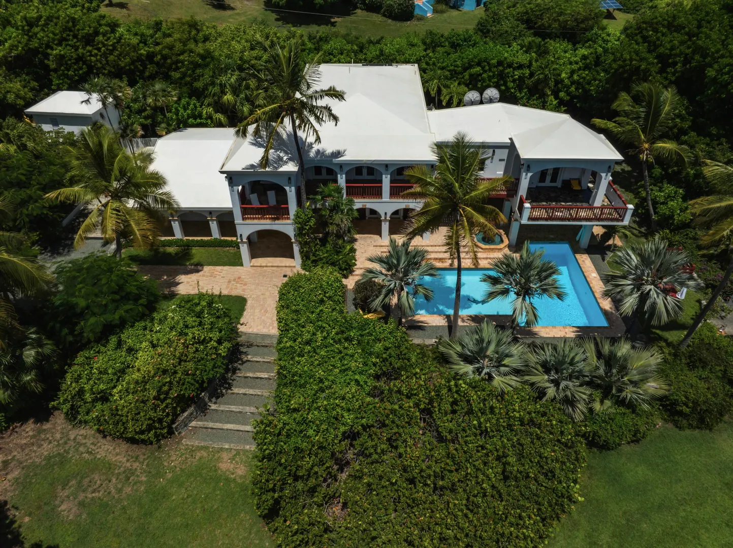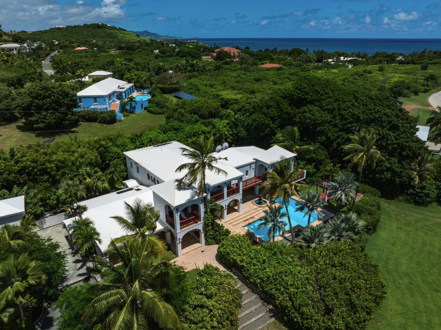 Discover the epitome of Caribbean luxury with this stunning two-story villa on St. Croix's East End. This 5-bedroom, 6.5-bath masterpiece offers an unparalleled living experience, blending opulent comfort with the island's natural beauty. Its spacious accommodations include: Five bedrooms (including a 2/2 apt with separate entrance), each with its own en-suite bathroom, provide comfort and privacy for all guests. Half-bath just off living /dining room, full bath poolside. Main bedroom suite on upper level features a private living area and covered gallery. The gourmet chef's kitchen is fully equipped and designed for culinary enthusiasts, perfect for hosting and entertaining with triple sinks, range, granite countertops, large pantry, custom cabinetry, pass-through window & eat-in