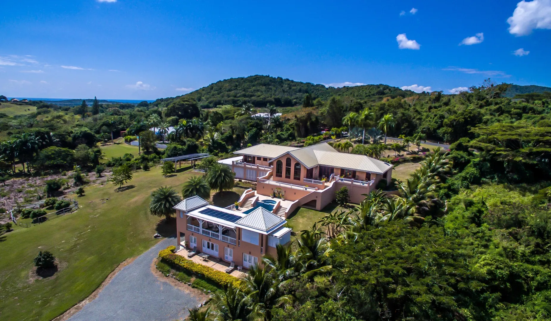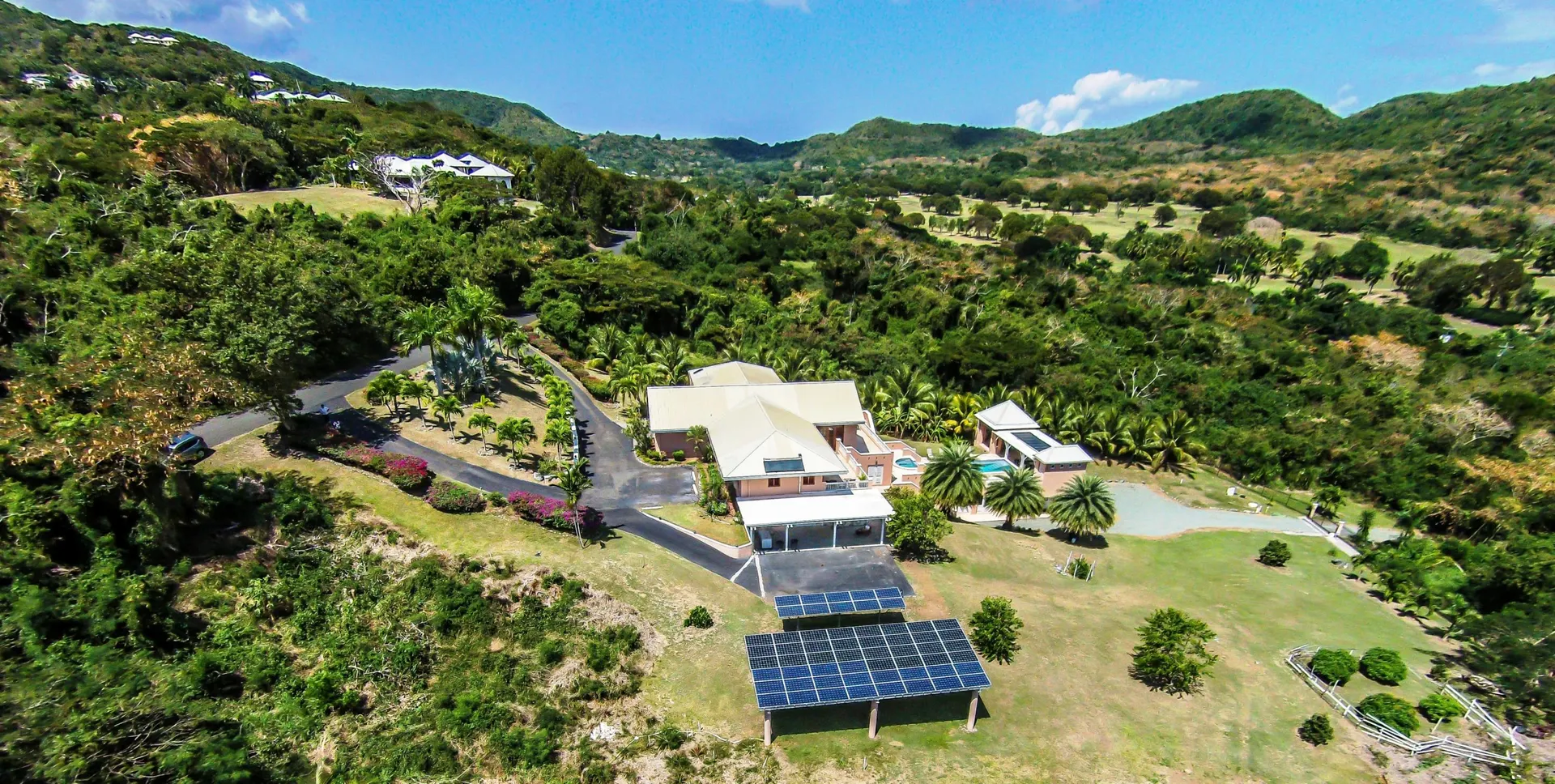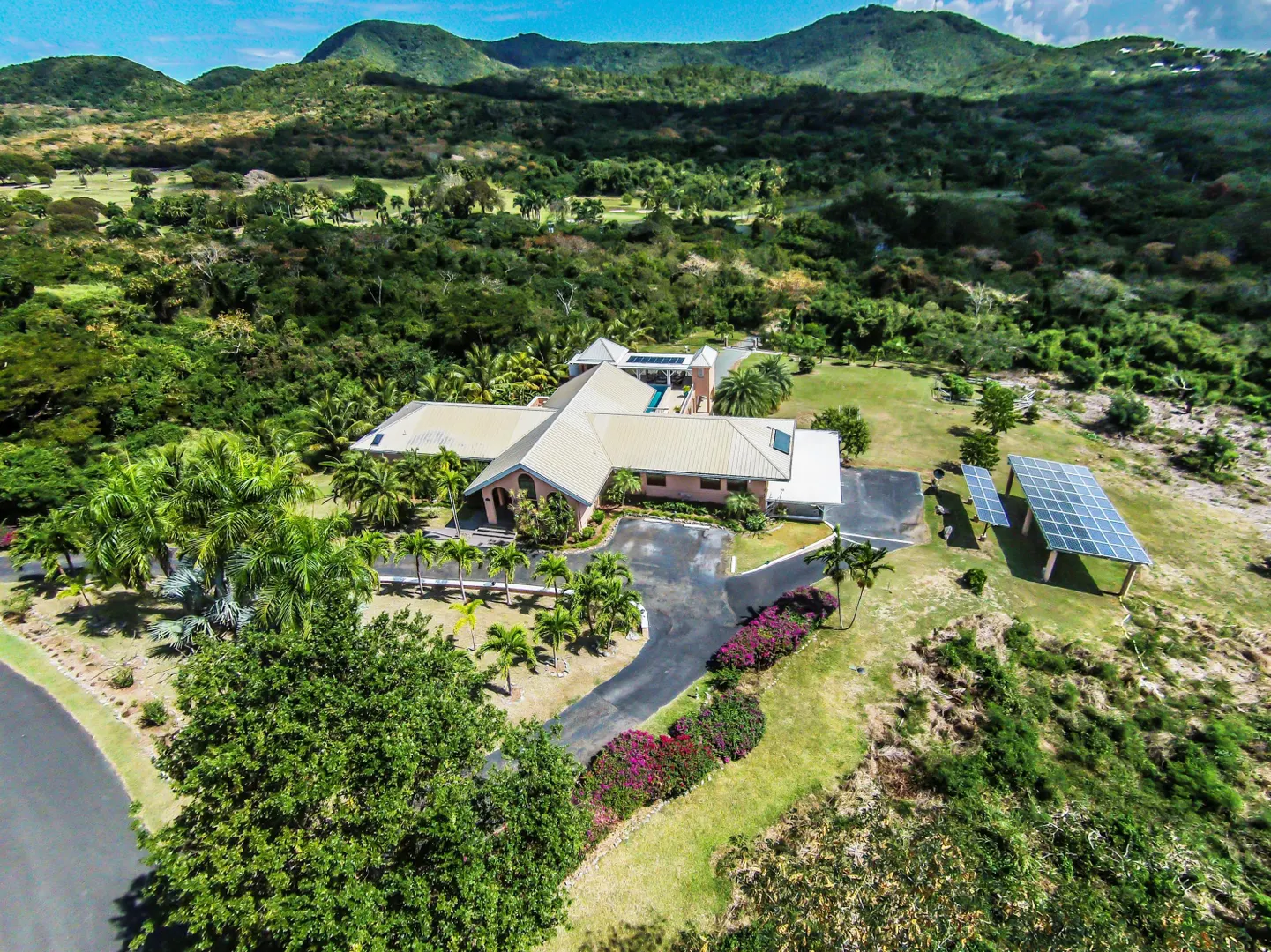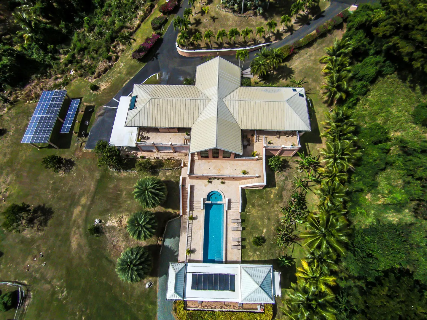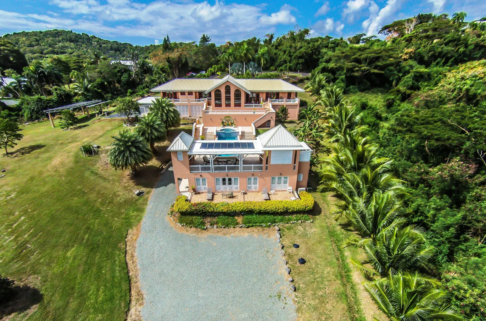 Las Palmas located in gated Carambola on 2.36 tropically landscaped acres is a pristine home encompassing 3 bedrooms ensuite, office, gym & large apartment. Travertine tiles throughout, beautiful outdoor summer kitchen & media area, 36ft pool and spa. Great room has 19 ft cathedral ceilings with gorgeous Mahogany windows, solar powered, well, generator, all next to Robert Trent Jones golf course!Las Palmas is an exquisite home; some of the highlights are: • 2011 installed all new custom mahogany window doors and louvers. The glass is 7/16" thick for hurricane resistance • All 3 bedrooms have custom closet built- ins made locally by Andre McBean of local Mahogany • 2013 travertine tile installed on the diagonal throughout the main house • Gourmet kitchen made by Quality Cabinets of Cherry with granite counter tops, sub-zero refrigerator and freezer and all stainless steel appliances • Outdoor area is as approximately 4,000 sq. feet, and done in coral stone tile; the deck, summer kitchen, media area, pool and apartment were completed in 2010 • At the pool deck there is a full summer kitchen with grill, sinks and cooler and a TV retractable screen painted by artist Marie Graci. • Full bath with shower at pool level • Apartment at lowest level is approximately 800 sq. ft. one bedroom apartment with open concept kitchen, 3 fans, A/C, washer/dryer and is also connected to Solar/backup system • 2010 Solar system phase I was completed • 2014 Solar Phase II was completed producing 15 KW approximately 2000 KW per month, a net metering system, it has battery backup with a generator to recharge the batteries if needed. • 2015 new septic system installed • The water system contains 2 cisterns. One cistern collects rain water and holds approximately 30,000 gallons. The smaller cistern holds 15,000 gallons. The water in the smaller cistern holds water that comes from a well on the property after it has gone through a reverse osmosis system. It is an automatic system that creates RO water on an as needed basis. • The house uses a recirculation system that avoids wasting water while waiting for hot water. • There is abundant spaces at the lower level of the home, providing a gym, storage, a workshop and a garage. • Standing seam metal roof • Alarm system • Lower level has a separate gated entry for apartment privacy and or service providers • Community pool, tennis courts and Robert Trent Jones Championship golf course all in close proximity • The property is beautifully landscaped with drip irrigation and there are numerous native fruit trees including bananas, lime, coconut, sour sop, pineapple, avocado and papaya
